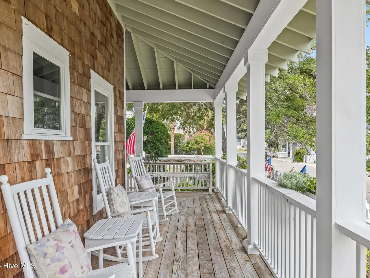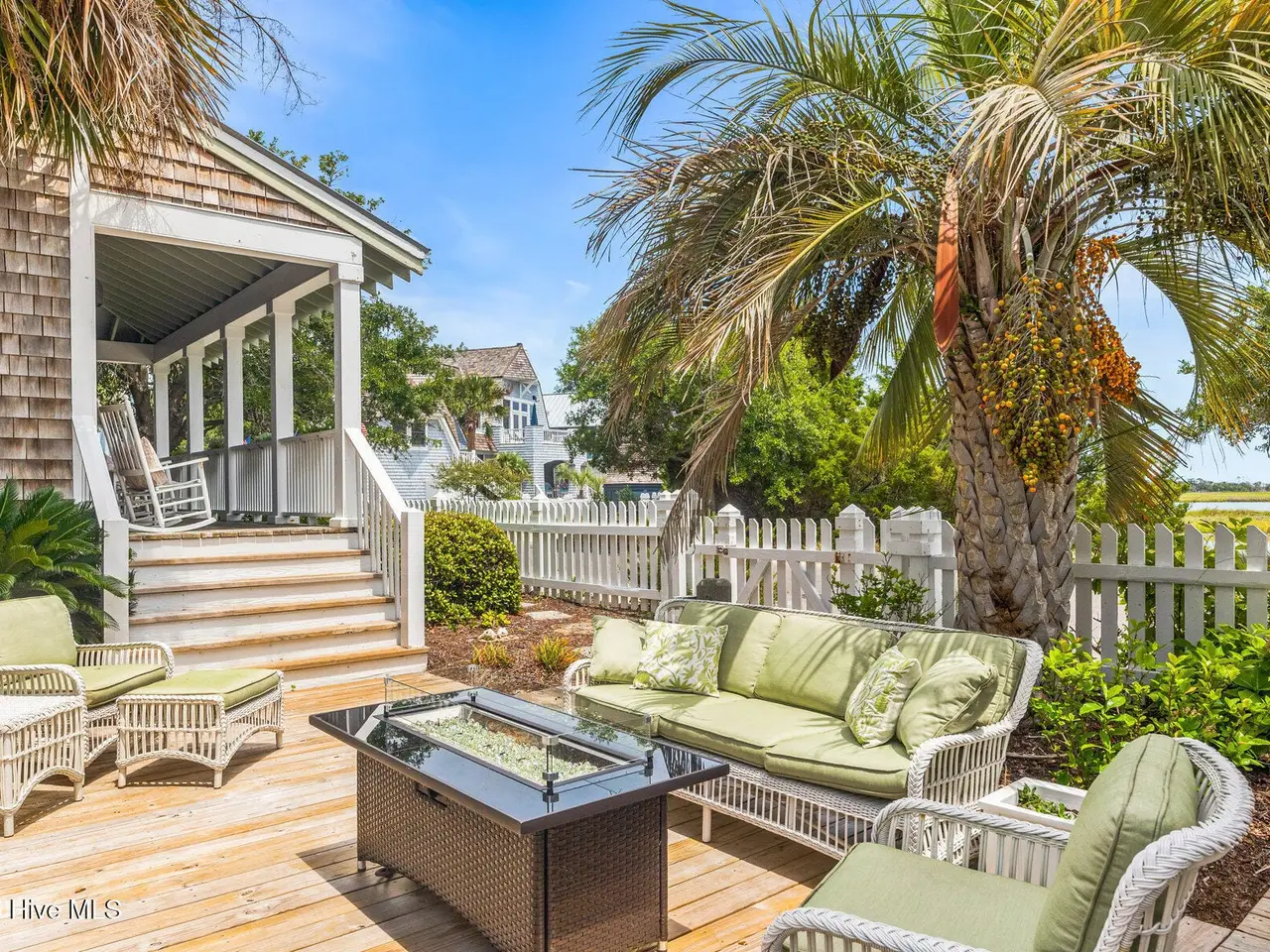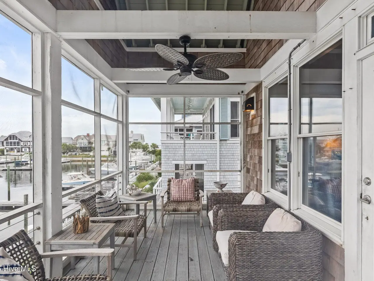 Coastal charm on one of the island's most iconic corners. At the meeting of Keelson Row and Transom Row, this Nantucket-style retreat offers front row views of the marina, sweeping saltwater marshes, and the daily rhythm of Bald Head Island. With 4 bedrooms and 4.5 baths total, the home spans just over 2,300 square feet and is designed for laid-back island living. The reverse floor plan makes the most of its elevated views. Upstairs, the vaulted living room opens to a screened porch where you can watch boats drift by and spot the beacon of Old Baldy. A renovated kitchen blends coastal character with modern function, creating a warm and welcoming flow throughout. On the main level, you will find two guest suites. One of which opens directly to a covered porch with a swinging bed that catches the breeze and invites long, lazy afternoons. Just outside, the wraparound front porch is lined with rocking chairs and offers a perfect perch to watch the island go by. A cozy fire pit patio just off the side adds one more spot to unwind. The top-floor primary suite is a true retreat with sweeping marsh views, a cozy reading nook, and a spacious walk-in shower. The crofter, accessed by a spiral staircase, offers two twin beds and a full bath for guests or flexible living space. Sold furnished and including two 4-passenger golf carts, this home offers a front porch lifestyle made for slow mornings, sunset views, and timeless island memories.