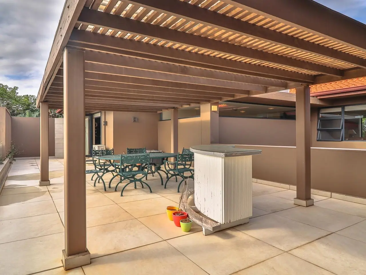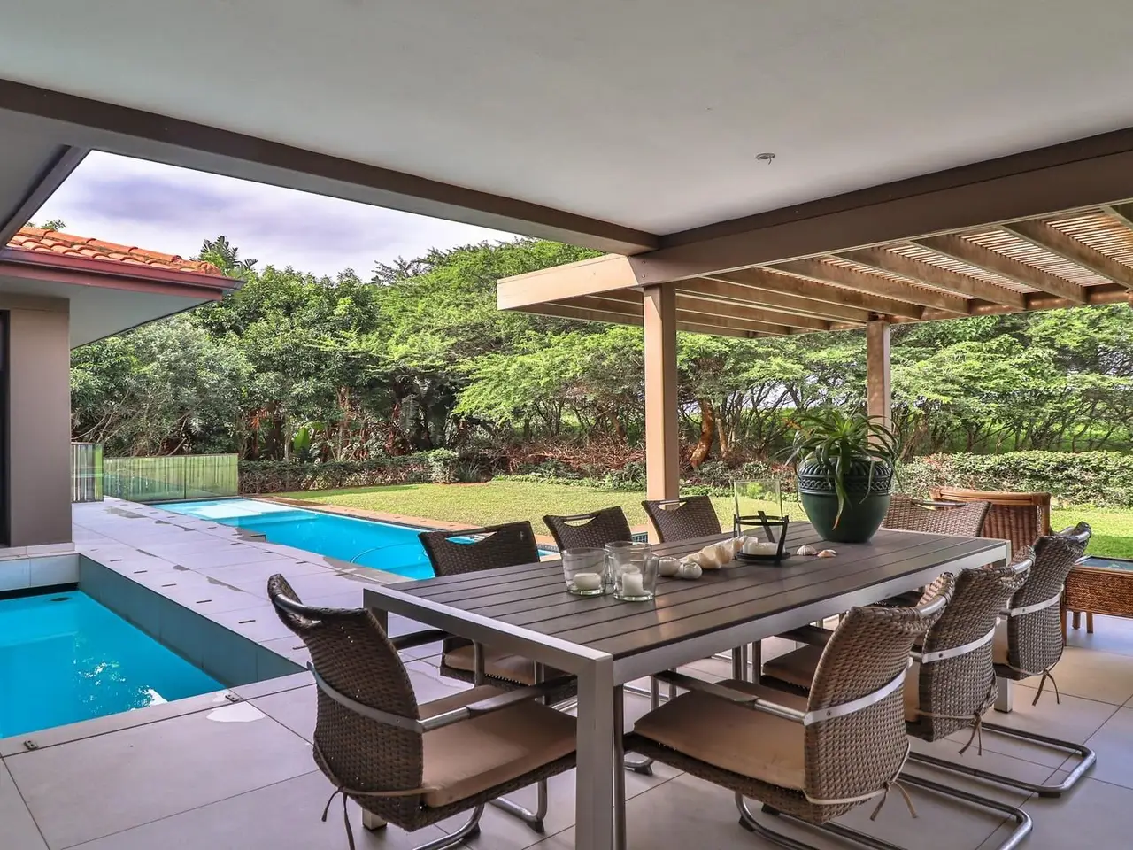 Tranquil pool patio with dining area