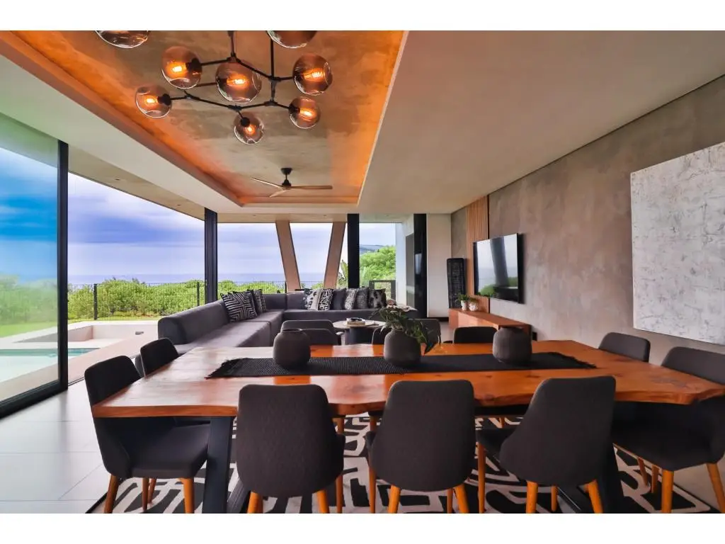 Perched in the prestigious Mont Clam Oceanside Estate in Sheffield Beach, this newly completed modern masterpiece offers the ultimate in luxury coastal living. Boasting the finest finishes throughout, the home captures breathtaking panoramic sea views from every angle. The striking architectural design seamlessly blends elegance and functionality, creating a haven of sophistication and comfort. The lower level is an entertainer's dream, featuring an open-plan kitchen and dining area that flow effortlessly into a spectacular living space. Expansive glass doors open to a lush garden, complete with a sparkling pool and fire pit, perfect for relaxation and social gatherings. A covered patio features a built in braai, and a triple garage adds convenience and security, completing this remarkable coastal home. Upstairs, four generously sized bedrooms await, each with its own en-suite bathroom, offering uninterrupted ocean vistas and access to private balconies. Natural light floods the interiors, enhancing through cleverly angled walls, a great sense of space and tranquility. Thoughtfully designed for modern living, the home ensures every detail is meticulously crafted to the highest standards. Full access to all Zululami and Seaton facilities, including private beach access, beach club, sports pavilions and more