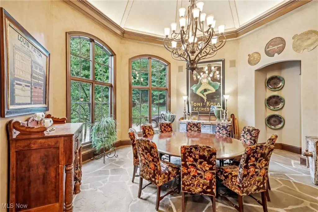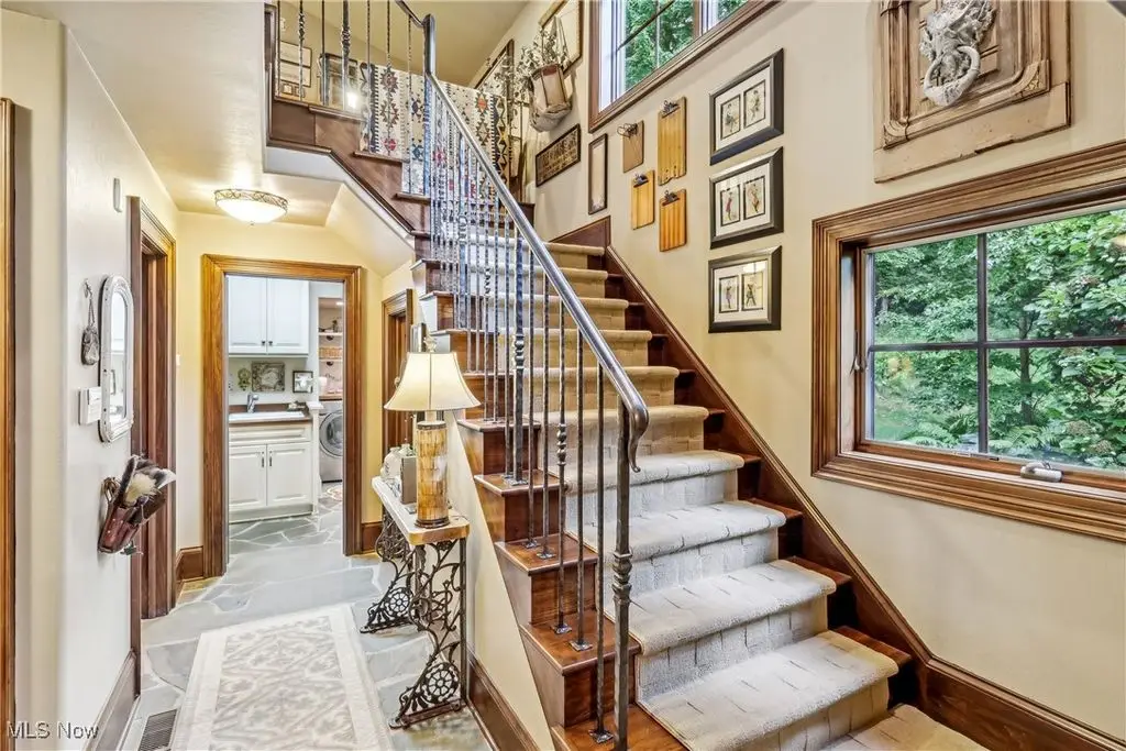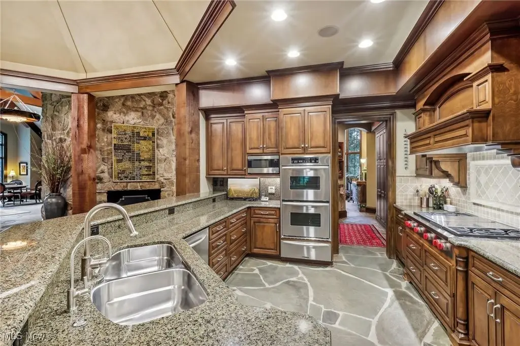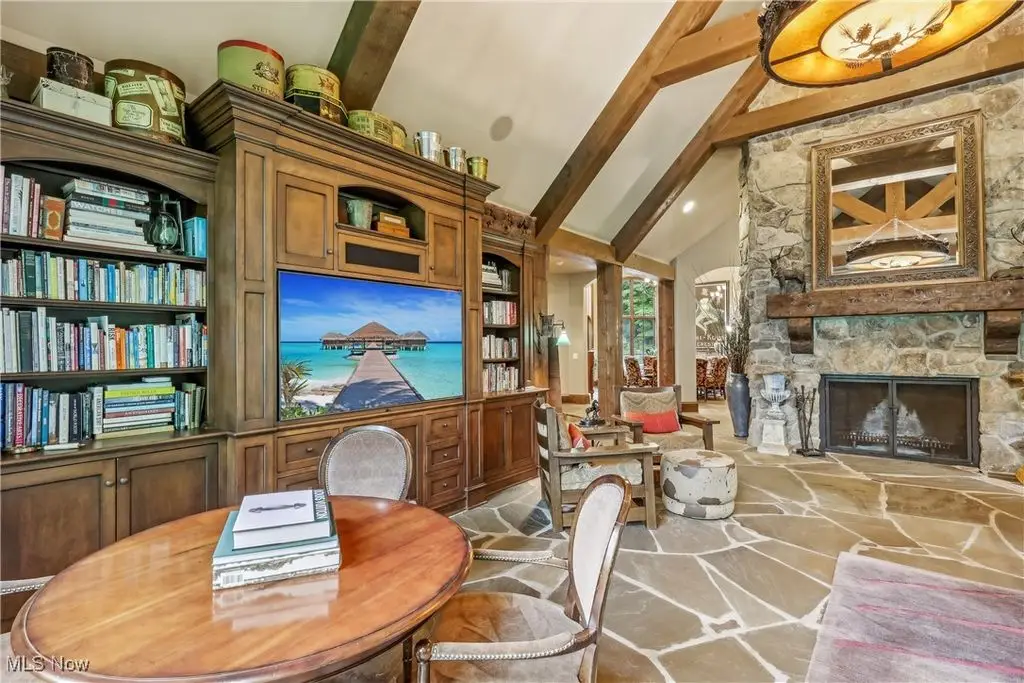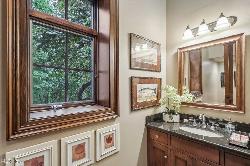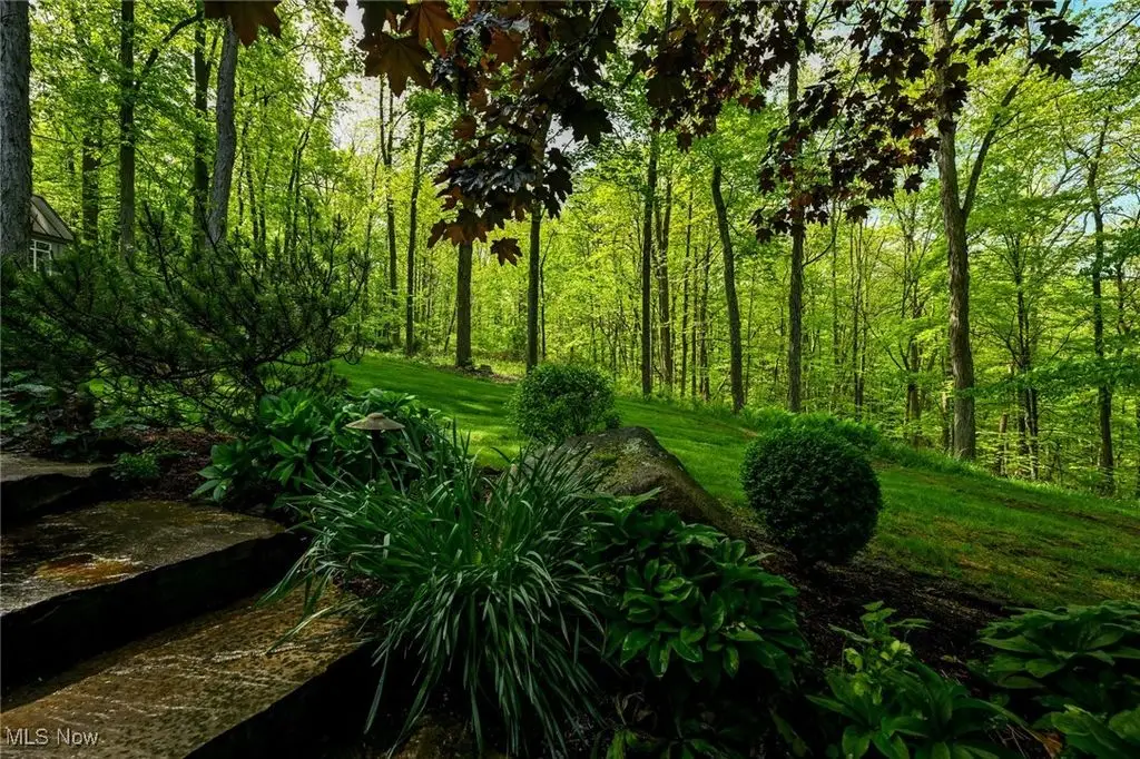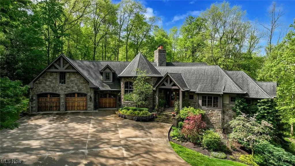 PRIVATE winding driveway over a charming bridge leads to this Spectacular property, Elevated 130 ft, breathtaking views of the Yellow Creek River Valley. Situated on 13 wooded acres w/7000+ SF of exceptional quality from building materials to custom finishes. European influences are reflected in the design of this home, offering remarkable living experiences w/natural beauty & architectural excellence. Exquisite Pennsylvania flagstone flooring runs throughout main floor warmed by radiant heat. Massive 3 sided stone FP anchors home, open to Great room w/ vaulted ceilings, beams, & wall of built-ins balanced by floor to ceiling windows flooding natural light & showcasing magnificent views. Fabulous open floor plan continues with octagonal Dining rm details including 22Ft ceiling leads to butlers pantry and bar adjoining lovely Kitchen appointed w/custom cabinets, top of the line appliances, opening to a fabulous keeping room w/ soaring ceiling. Luxurious FF primary suite, provides private retreat, w/ bathroom, sep vanities, and walk in closet. Extending the main living is a fabulous screened porch with flagstone floor & FP. FF is complete w/ laundry, mudroom and 3.5 heated garage. Ascending the second floor is a huge Guest Suite w/full bath, huge workout room, and private office. From foyer, lovely staircase designed w/huge window, presents stunning views as you descend to the walkout LL(2000SF). This incredible living space w/12 ft ceilings offers 2 generous bedrooms (ensuite), abundance of storage, Large family room w/ a stone FP, surrounded by windows leads to a charming stone patio. Completing the LL is a bar/kitchenette and separate theater rm. The property is equipped w/geothermal & radiant heating systems, ensuring comfort & energy efficiency & 50 year old grand manor shingle, generator, and garden shed. This property is one-of-a-kind and offers an incredibly private retreat unmatched in Northeast Ohio.