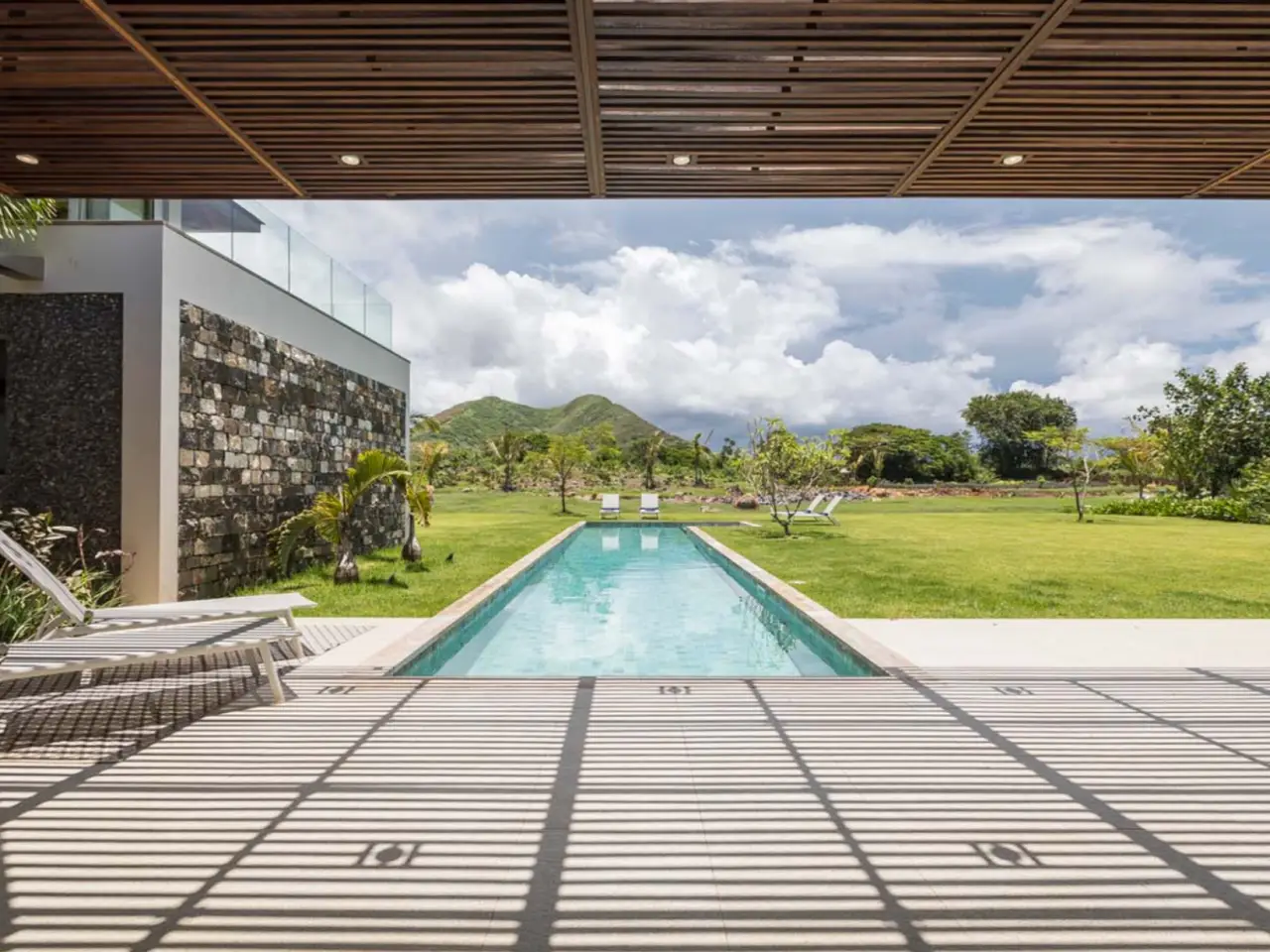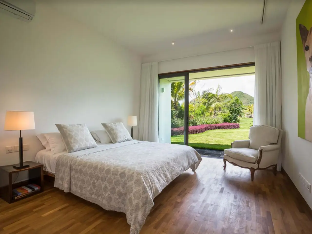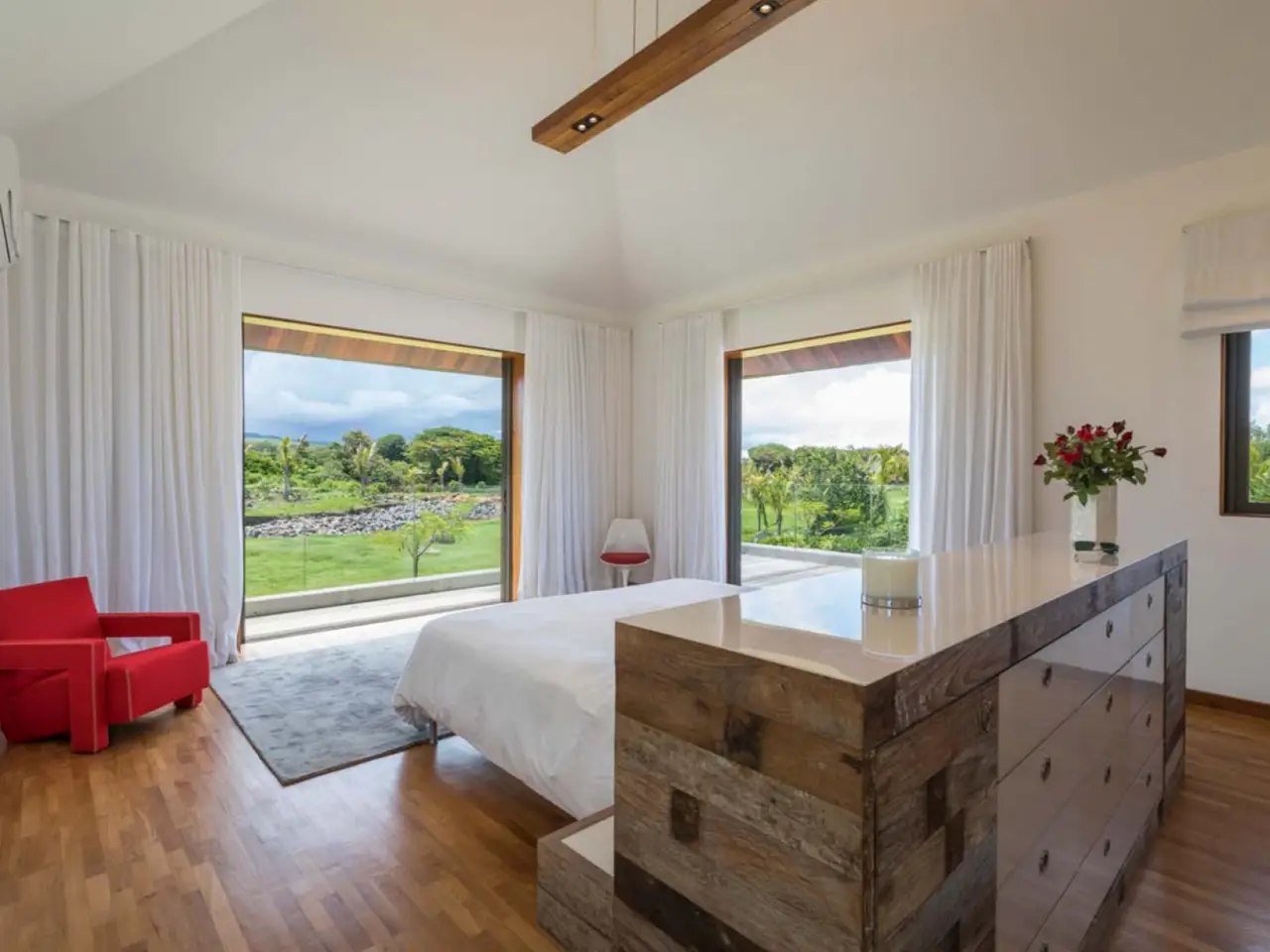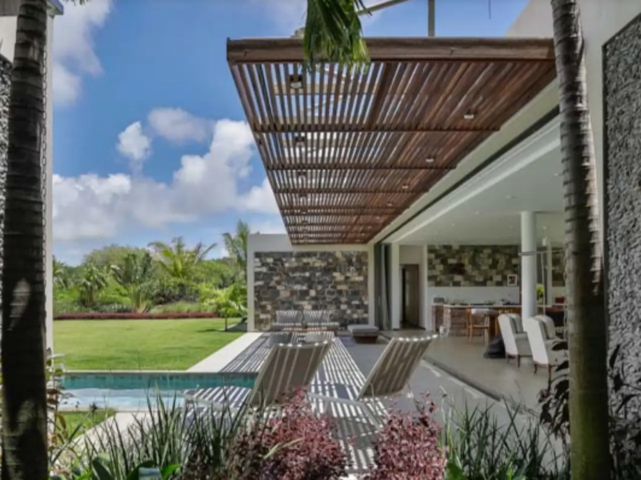 Part of a luxury Golf and Spa resort on one of the most beautiful coasts of Mauritius, this superb 510m2 contemporary villa built on a spacious 2,003m2 plot with view of the tropical landscaped garden including a long 18m swimming pool, and of the mountain chain in the back drop. The property offers 5 en suite bedrooms, out of which a master bedroom with balcony on the first floor and one in a independent pavilion, as well as a beautiful living and dining space with American kitchen. The wide sliding windows expand the width of the room (16m) allowing natural ventilation and lighting through inside all day long, thanks also to the western orientation. The contemporary style of the villa features fine organic materials such as volcanic stone and teak, and the interiors adorn elegant pieces with sober tones. Additional characteristics: home office on first floor, TV room, covered garage with double space The new owner will benefit from Mauritian residency upon acquisition of the property and will be given the opportunity to join the estates Owners Club which will allow access to all the services and facilities of the Resort: two infinity pools, a beach service, access to its exclusive beach at île aux Cerfs, access to 2 championship golf courses (including the île aux Cerfs Golf Club), 4 restaurants, the Spa by Thémaé Paris.