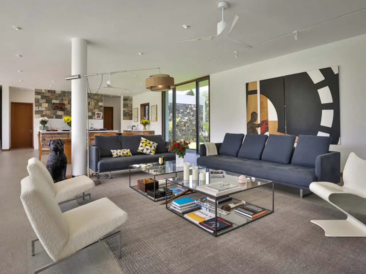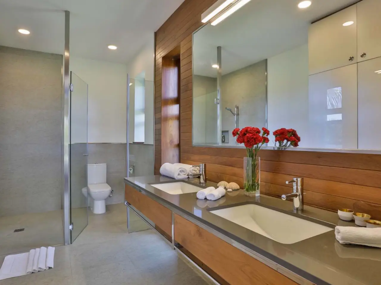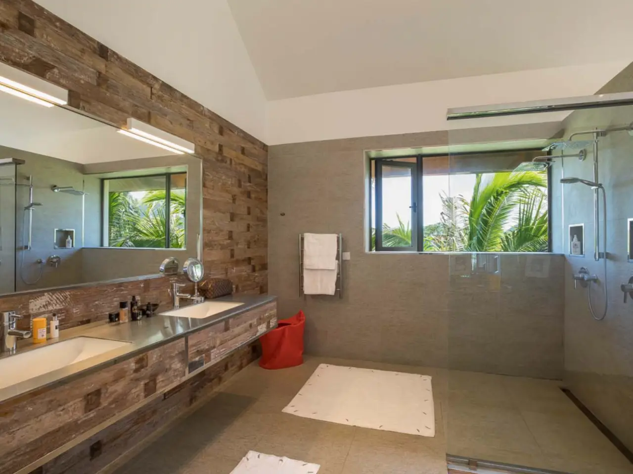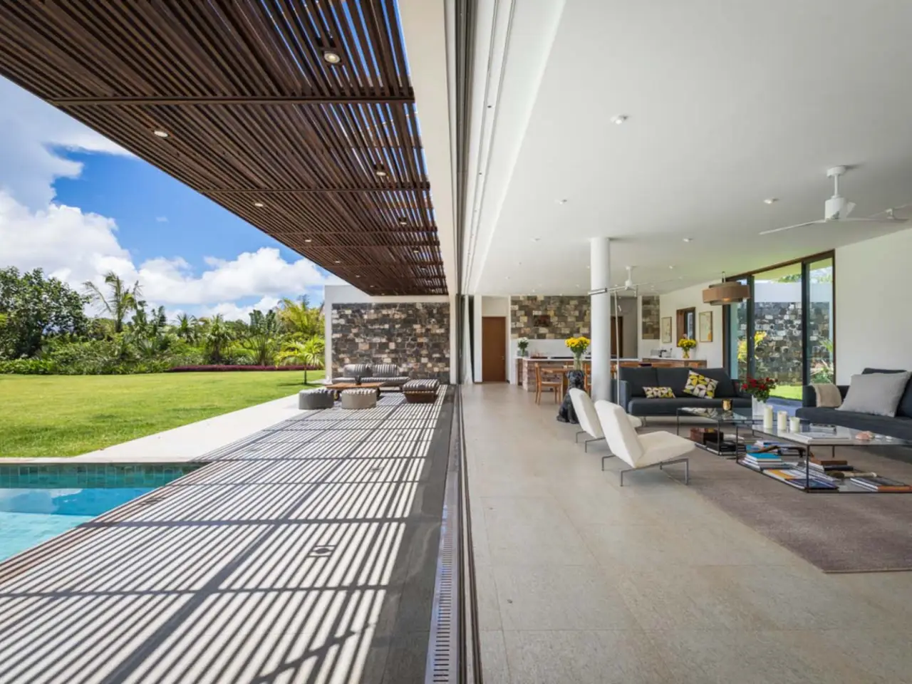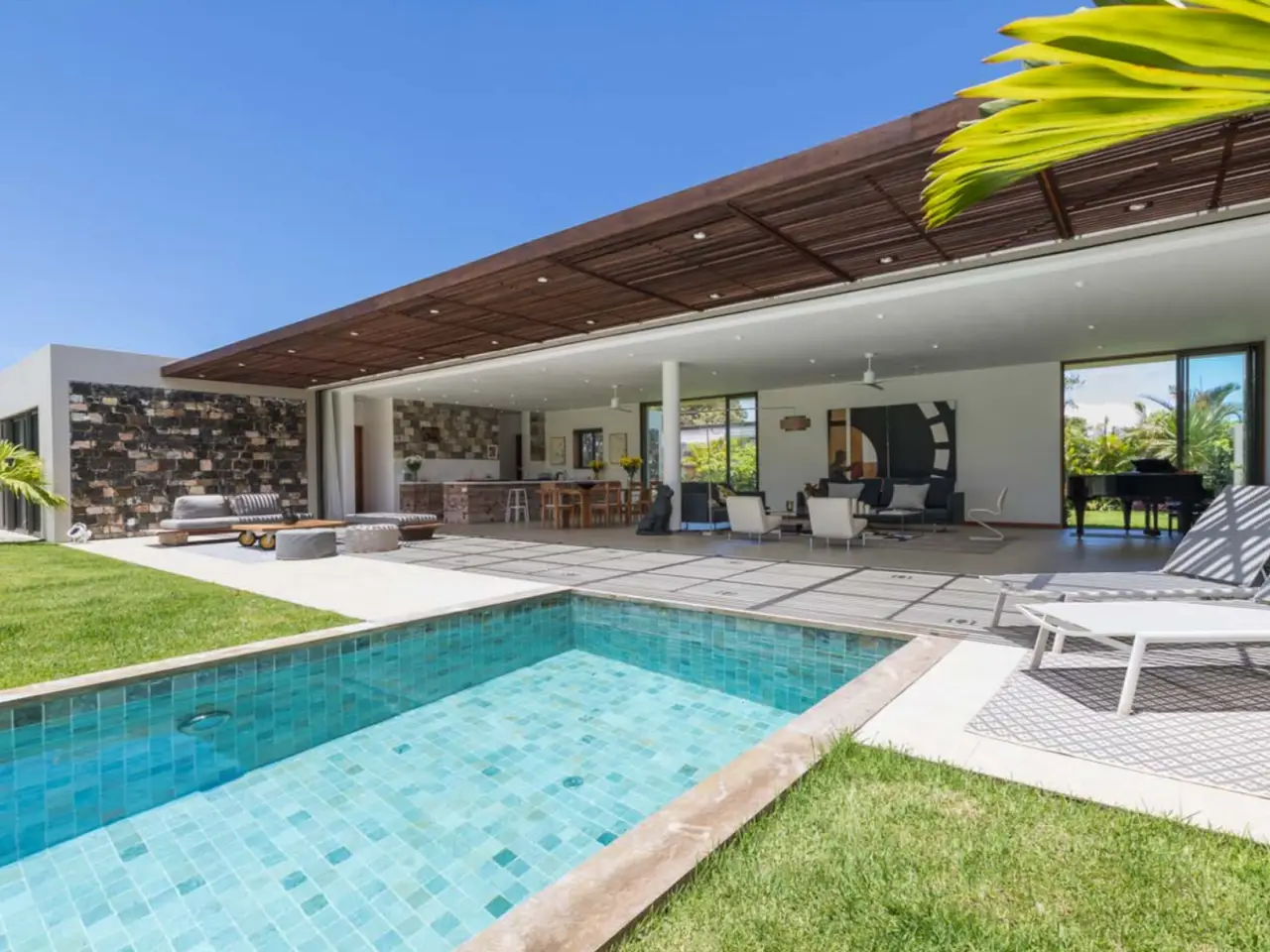 Part of a luxury Golf and Spa resort on one of the most beautiful coasts of Mauritius, this superb 510m2 contemporary villa built on a spacious 2,003m2 plot with view of the tropical landscaped garden including a long 18m swimming pool, and of the mountain chain in the back drop. The property offers 5 en suite bedrooms, out of which a master bedroom with balcony on the first floor and one in a independent pavilion, as well as a beautiful living and dining space with American kitchen. The wide sliding windows expand the width of the room (16m) allowing natural ventilation and lighting through inside all day long, thanks also to the western orientation. The contemporary style of the villa features fine organic materials such as volcanic stone and teak, and the interiors adorn elegant pieces with sober tones. Additional characteristics: home office on first floor, TV room, covered garage with double space The new owner will benefit from Mauritian residency upon acquisition of the property and will be given the opportunity to join the estates Owners Club which will allow access to all the services and facilities of the Resort: two infinity pools, a beach service, access to its exclusive beach at île aux Cerfs, access to 2 championship golf courses (including the île aux Cerfs Golf Club), 4 restaurants, the Spa by Thémaé Paris.