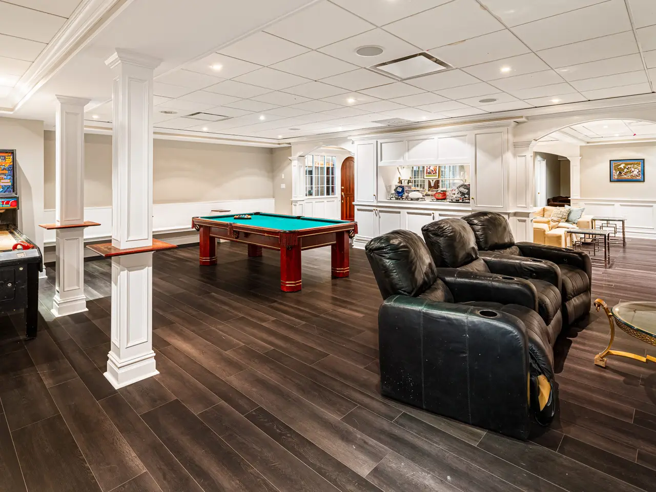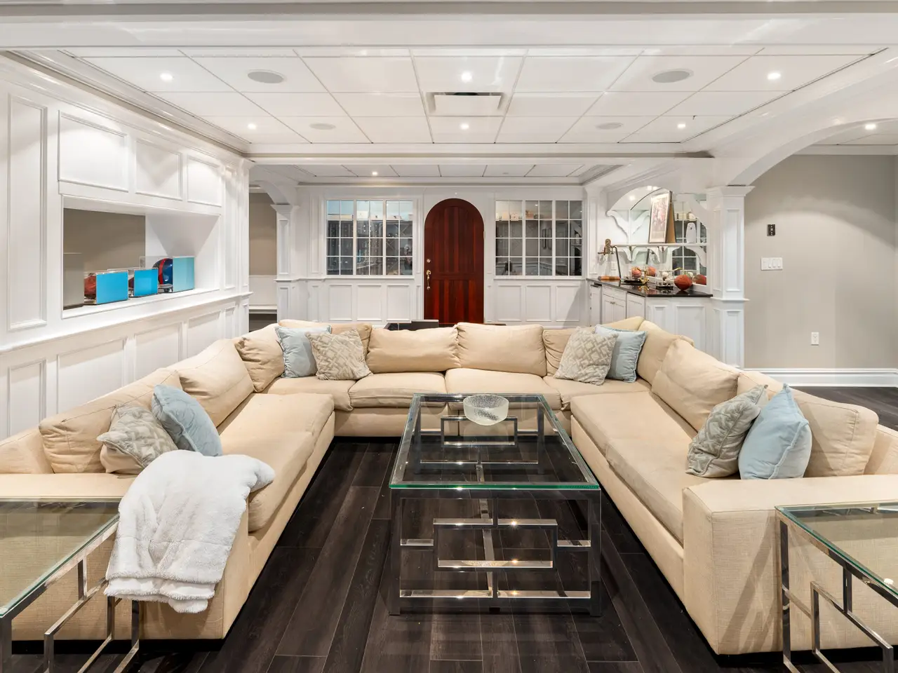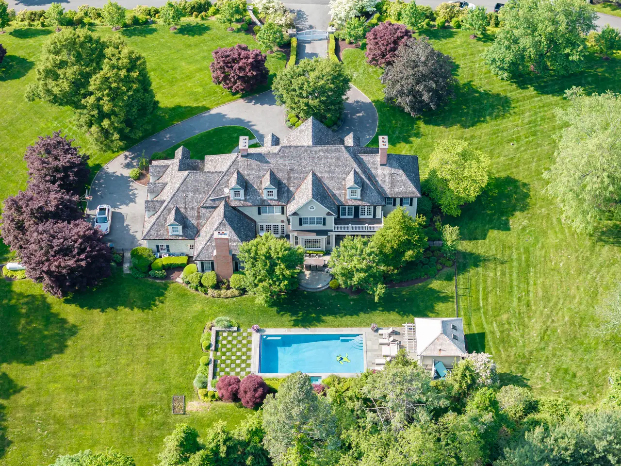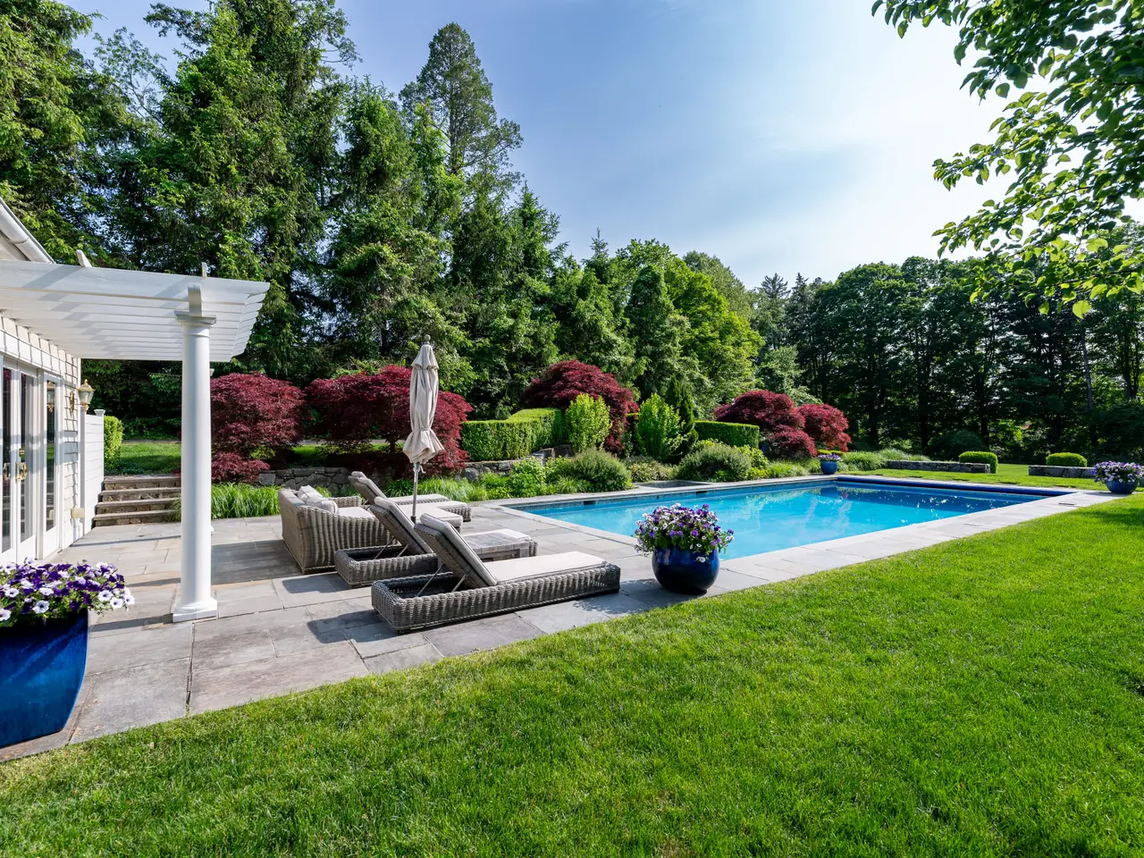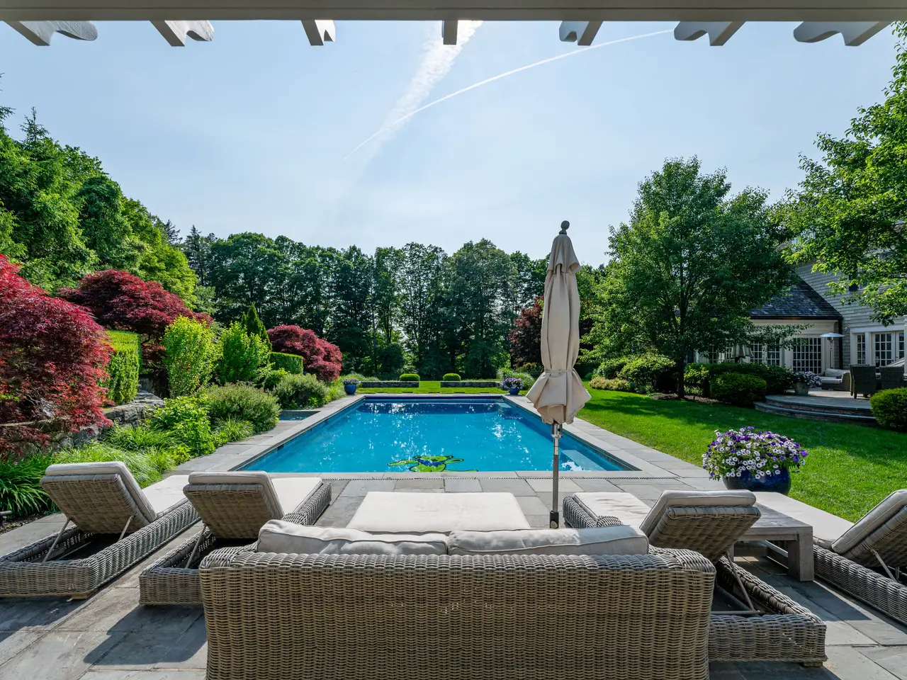 The pinnacle of Modern Colonial elegance in Pound Ridge: timeless classicism elevated to a grand scale, featuring spacious rooms, prestige amenities and luxury finishes crafted for contemporary comfort. Set on 3.7 acres on exclusive Great Hill Farms Road, its minutes from both Bedford Village and Stamford and an hour to Manhattan. Sunlight streams through the double-height entry, illuminating marble floors, custom paneling, and striking contemporary chandelier. The formal living room with wood-burning fireplace, exquisite millwork and French doors to a terrace opens to a sunroom wrapped in windows. A large dinging room also offers French doors to the private patio. The chef's kitchen dazzles with dramatic lighting, custom banquette and top-tier Wolf range and Thermador refrigerator, which is open to the family room with a beautiful stone fireplace. Upstairs, the luxurious primary suite boasts twin sets of French doors leading to a balcony, two spa-quality baths, and dual custom dressing rooms. Two additional ensuite bedrooms and two other bedrooms that share a bath complete the upper level The lower level offers everything for full-on recreation: a glass-enclosed gym, cinema room, family room, guest suite, wine cellar and full bar. Outside is a resort style escape offering spectacular landscaping, inviting pool and charming pool house and bocce court offering relaxation and recreation. This Pound Ridge paradise, with easy access to the Merritt and 684, is a rare fusion of heritage home and private luxury resort.