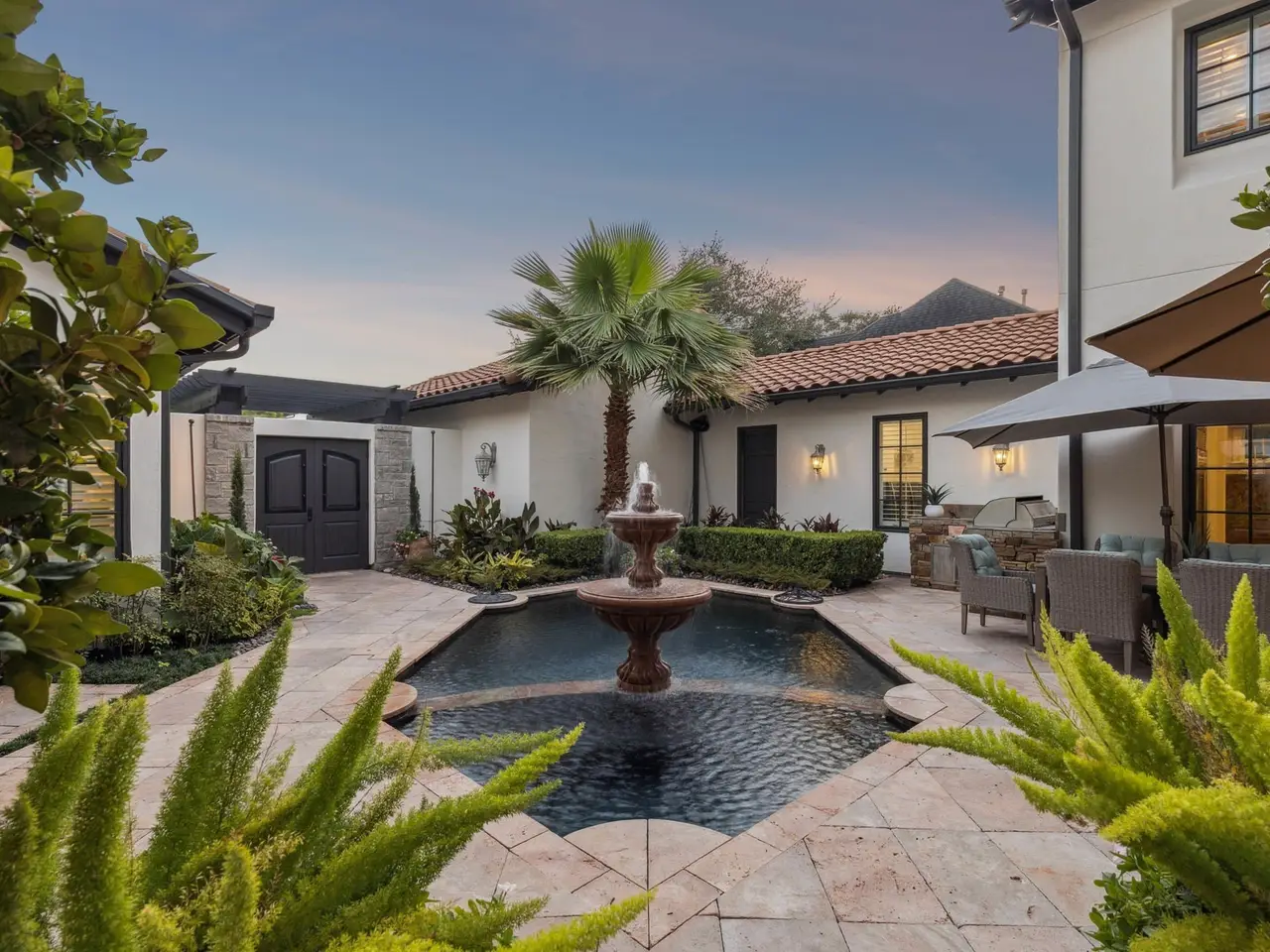 Designed and built in 2001 by acclaimed Richard Price, this home won GHBA 2003 award for design. Front, private courtyard with pool, fountain and spa wraps around the home and features a new outdoor kitchen. Stylish double height foyer welcomes you w/ designer lighting. Country style kitchen with Thermador appliances with seamless flow into family room. Water osmosis system. Private Primary Bedroom with spa style bathroom and generous closets. Sumptuous dining room with attached wine room and butler's pantry and further formal living room. 3 bedrooms up, all with ensuite - and large games room. Outside roomy back yard with new Astro Turf & Tuff Shed (both 2024). Shutters throughout the home, exposed beams, double garage and driveway parking. Outside fully painted (2025). This home is unique and has been beautifully maintained by current owners.