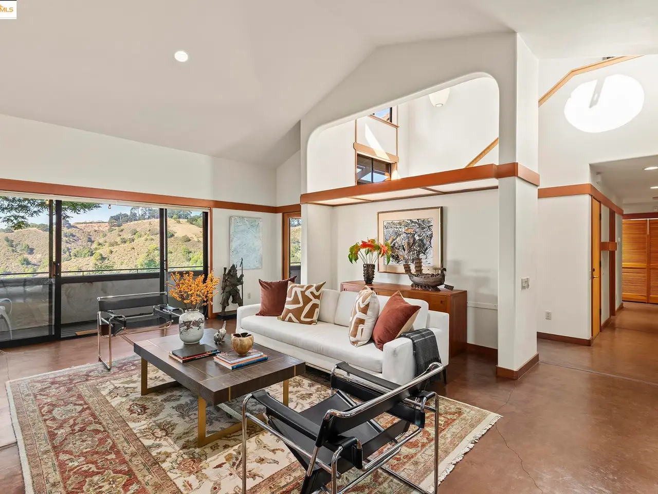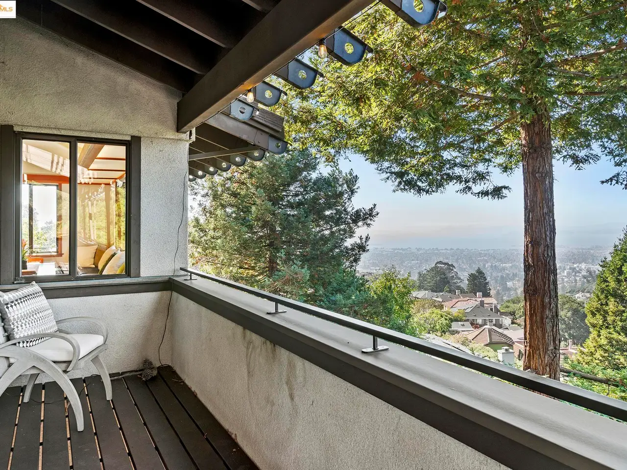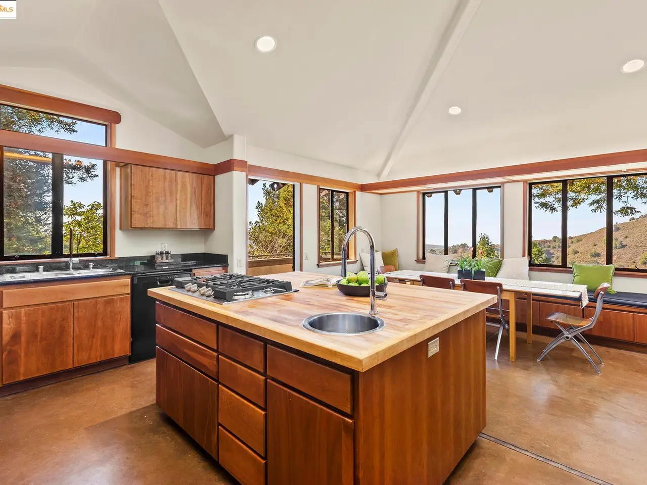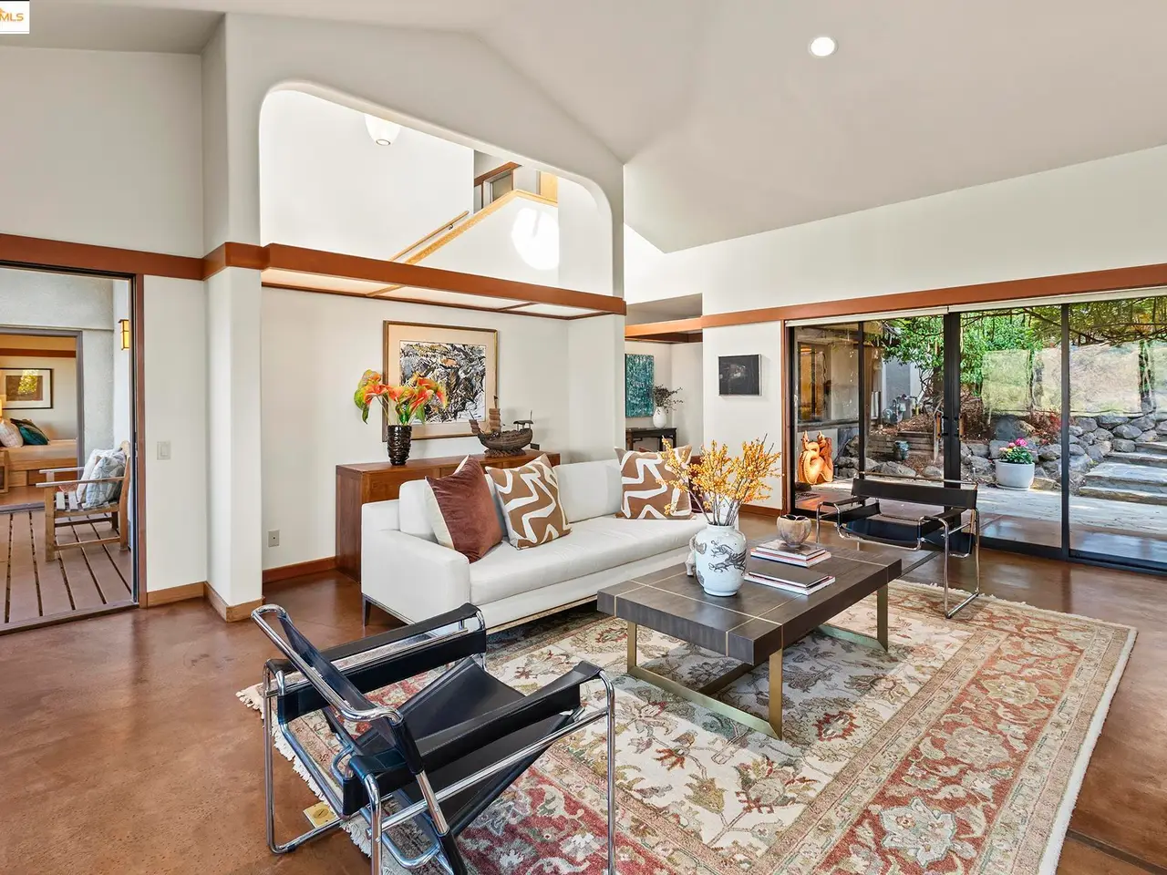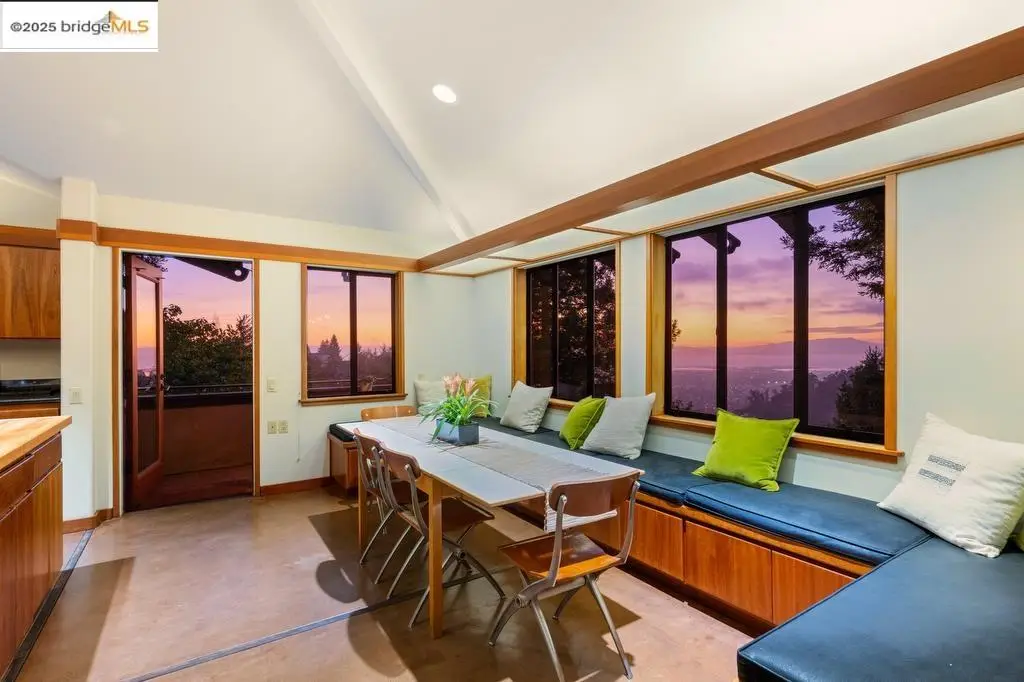 Set on a rare triple lot, together spanning just under an acre, at the end of a peaceful cul-de-sac, this expansive Japanese-influenced mid-century rebuild, offers privacy, volume & serene canyon & Bay views. Soaring double-height ceilings & integral color concrete floors define a dramatic, serene, modern interior with seamless indoor-outdoor flow. First time on the market, it is thoughtfully situated on the downslope with access directly into a 3-car garage. The 3 level design creates a strong connection to the landscape, with all levels being on grade. The main level features generous open living spaces, built-in cabinetry & a chef's kitchen. It has 3 beds and 2 ensuite baths on this level, plus a powder room. Expansive decks extend the living area and capture green and Bay vistas. An elevator services all levels, including a 1 bd. in-law with separate access, ideal for guests, multi-generational living or a creative retreat. This distinctive property blends architectural sophistication & modern comfort in one of Berkeley's most private & sought after settings. Easy access to freeways and parks.