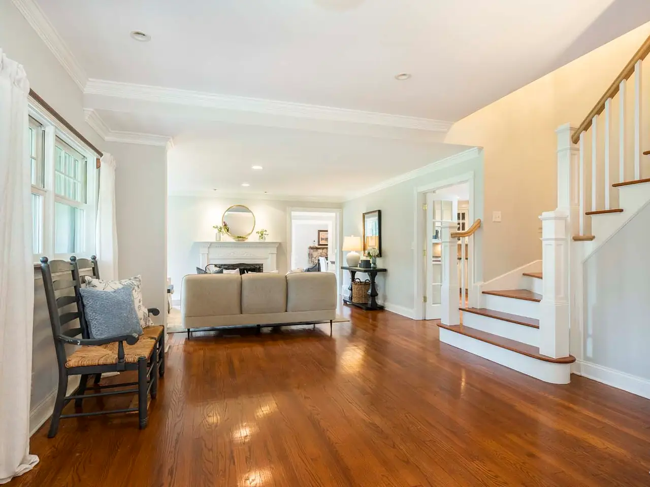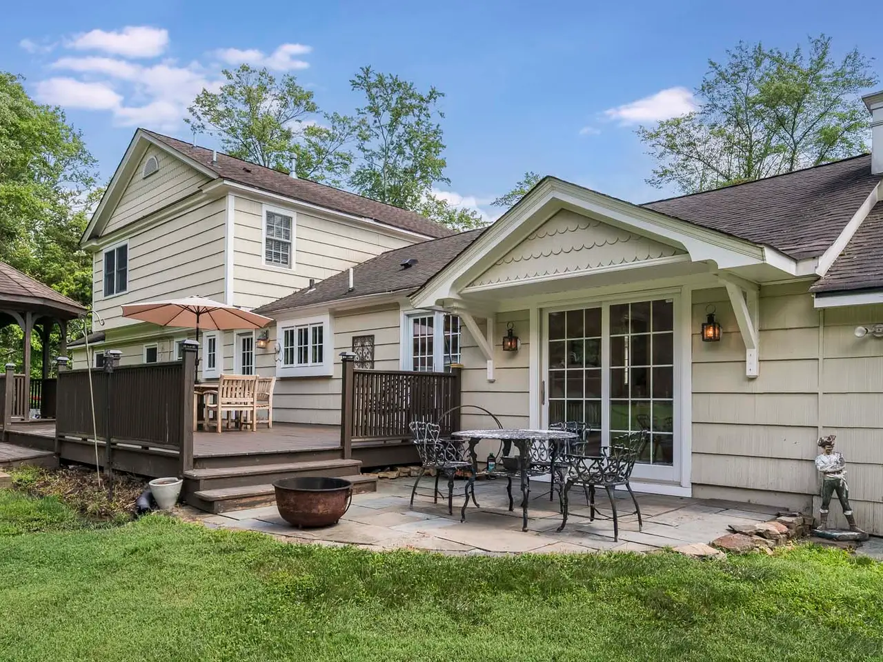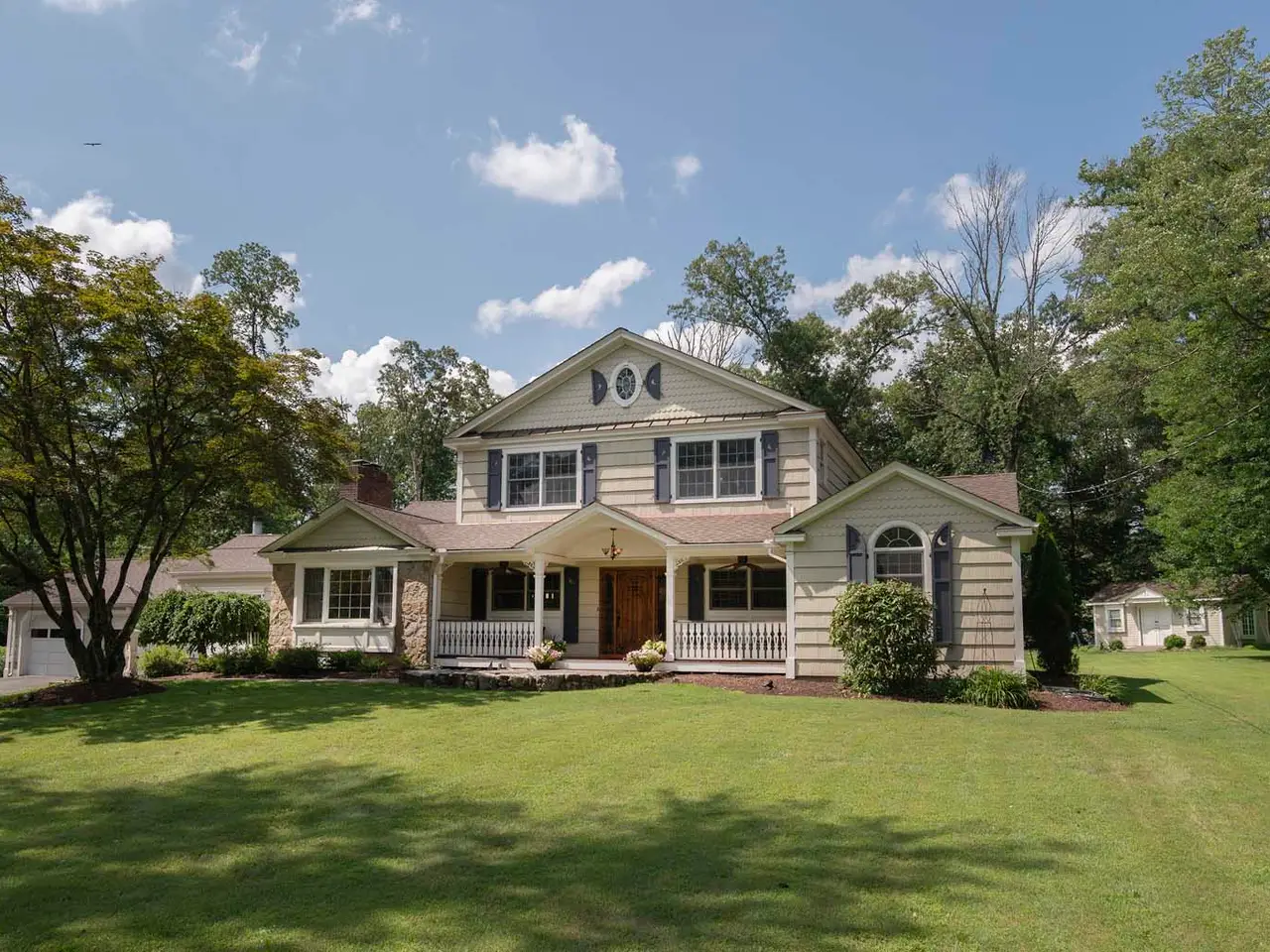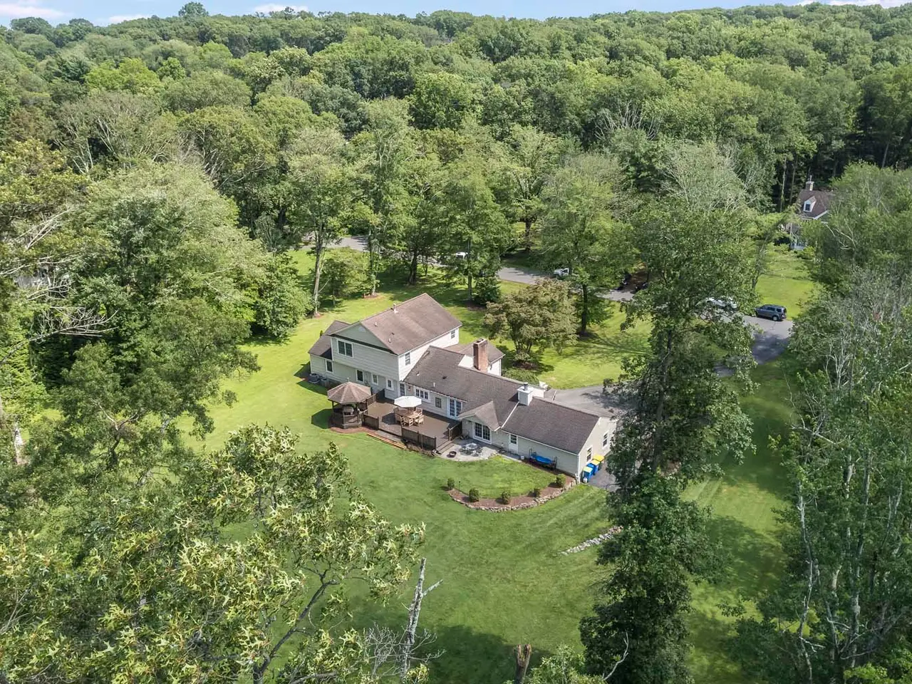 Set on nearly two picturesque acres, this beautifully maintained expanded ranch blends timeless charm with modern updates. Custom moldings, a striking stone fireplace, a newly renovated primary bath, and an open-concept layout elevate the home’s appeal. A covered porch welcomes you into this tranquil setting. Inside, an expansive foyer leads to the formal living room with a fireplace, perfect for gatherings. The dining and family rooms open to a generous deck that overlooks the vast, private backyard offering an ideal setting for entertaining or quiet outdoor enjoyment. Style and function combine effortlessly in the kitchen featuring stainless steel appliances, granite countertops, and custom cabinetry. Also on the main level is a spacious primary suite with a newly updated bath, along with a second bedroom with an adjacent full bath. A convenient powder room is located off the kitchen and near the staircase to the lower level. Upstairs, you’ll find three additional bedrooms and a full bath, offering plenty of space for the entire household and guests. Located just minutes from top-rated schools and a short drive to downtown, this special home offers the perfect combination of comfort, space, and convenience.