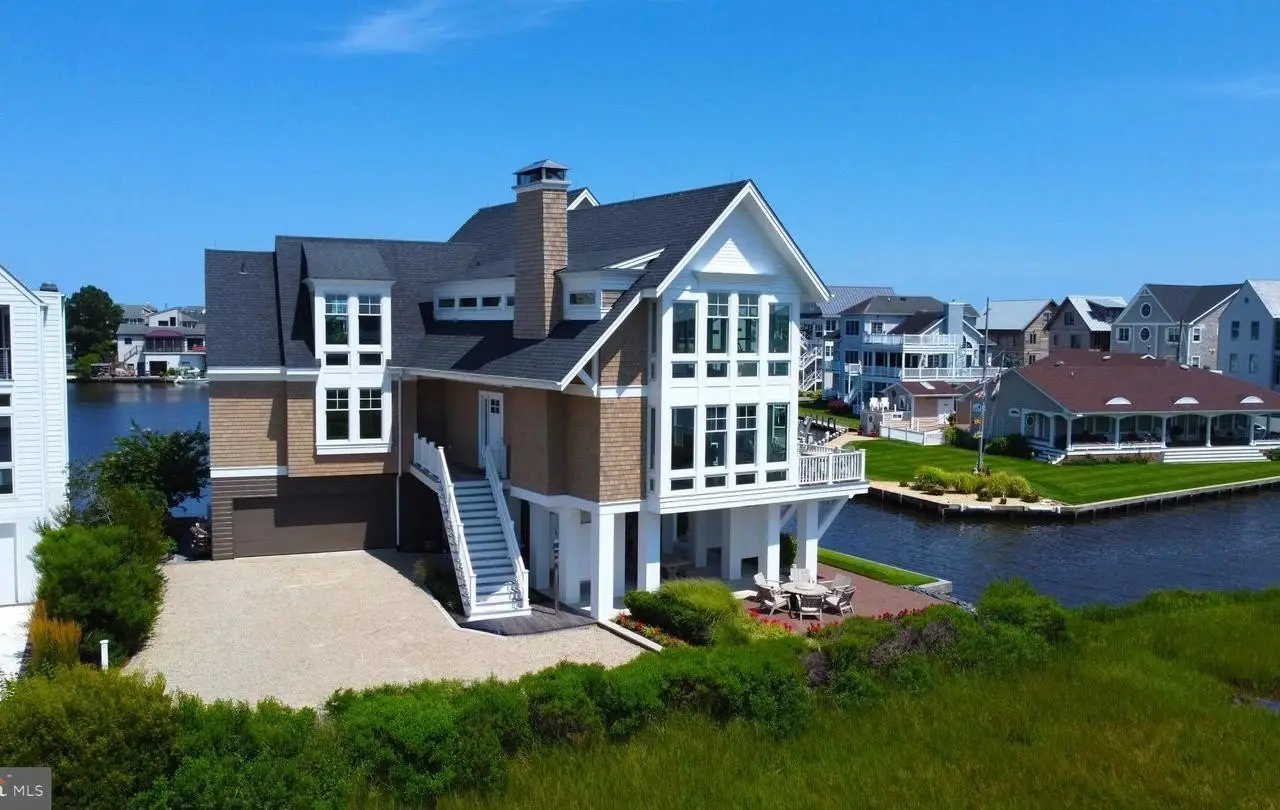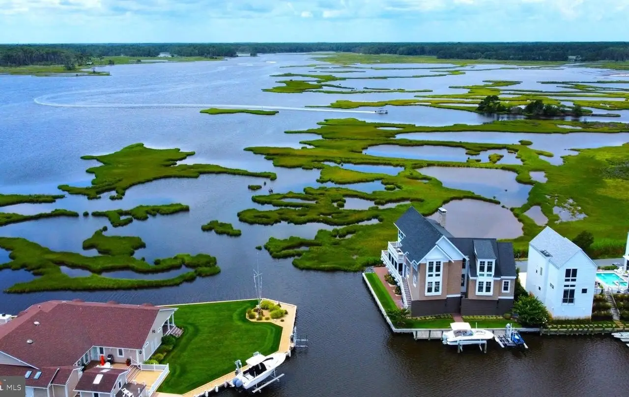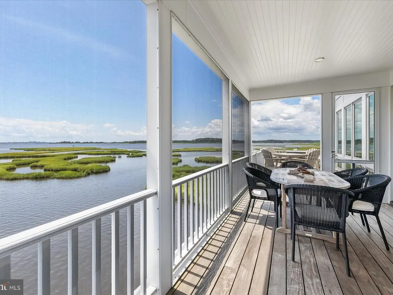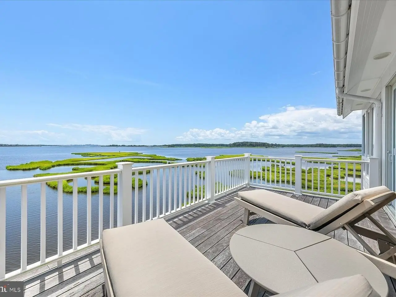 Take in unparalleled panoramic bay views from every room of this sophisticated modern beach home, ideally located on one of the most sought-after bayfront properties with water on three sides of the home. Complete with a private 50-foot dock, boat lift, and double jet ski lift, this exceptional residence was impressively designed, featuring high-end finishes and craftsmanship throughout. The expansive great room, with floor-to-ceiling windows on two sides, effortlessly frames sweeping views of the water and seamlessly blends the living, dining, and gourmet kitchen spaces. A large work island, bar with seating, and premium appliances elevate this culinary and entertaining space with easy access to a screened porch and open deck with views that are unable to be duplicated. The main level also offers a cozy family room, two guest bedrooms, and a full bathroom, along with a convenient powder room for guests. Upstairs, the bayfront primary suite is a tranquil retreat with its own private waterfront deck. Three generously-sized guest rooms each feature en-suite bathrooms, ensuring ample space and privacy for visitors. On the ground level, a spacious workshop and covered patio provide the perfect setting for crab feasts and relaxation, while the brick paver patio offers an ideal spot for evening bonfires by the water. The outdoor shower with a changing area makes clean-ups after a day on the beach or boat a breeze, and a two-car garage plus second one-car garage provide ample storage and convenience for all your vehicles, beach gear, kayaks, canoes, boating accessories, and bikes. Additional highlights include an elevator shaft for future conversion, geothermal hvac, and a location that's impossible to duplicate-situated on a peninsula with sweeping views of the bay and wetlands, yet just moments from the beach. Homes of this caliber, in such a prime location, are a rare offering.