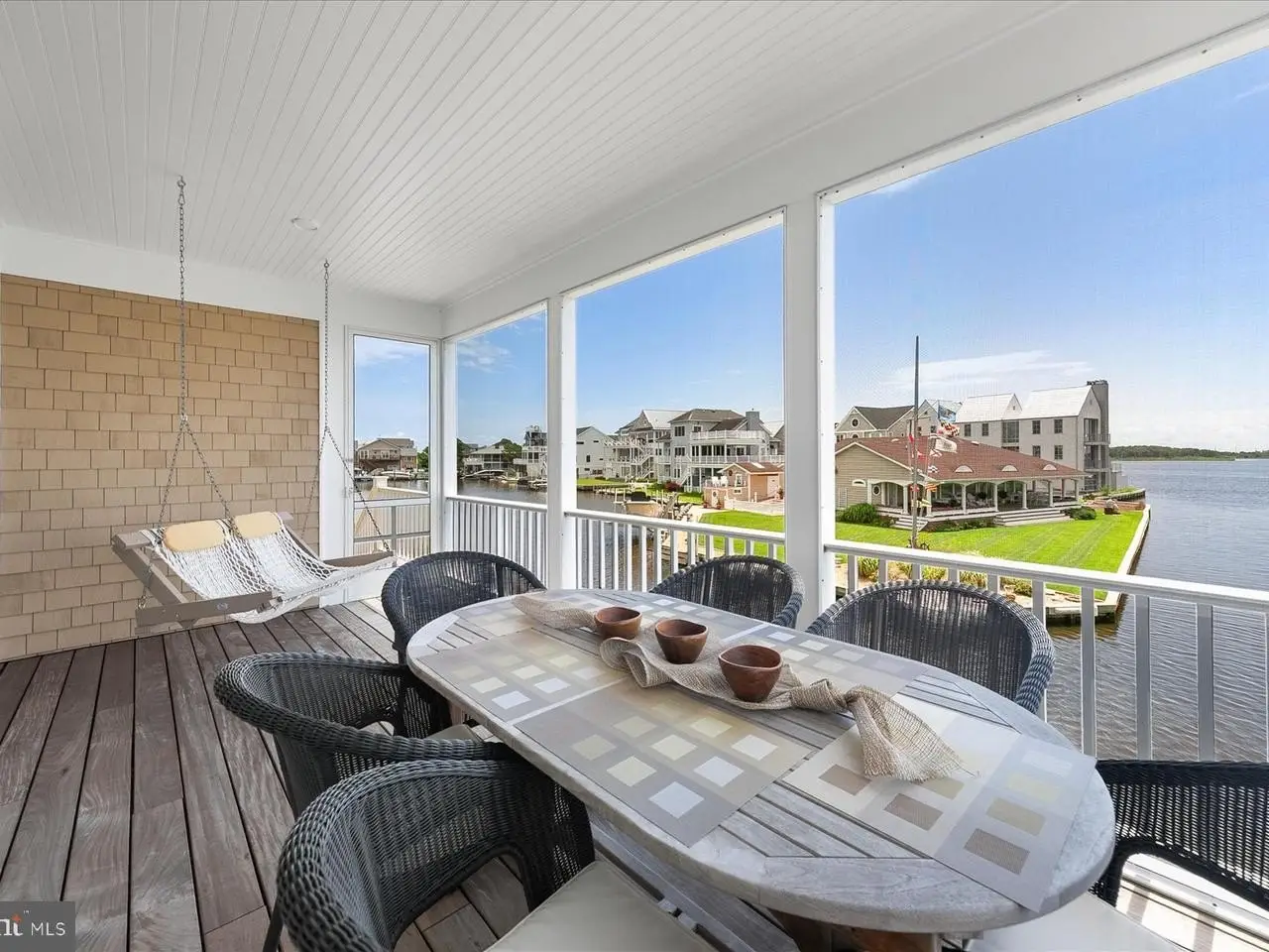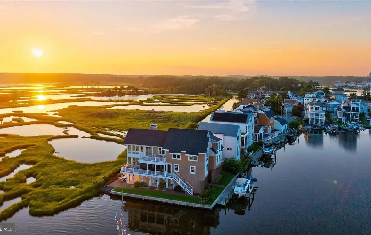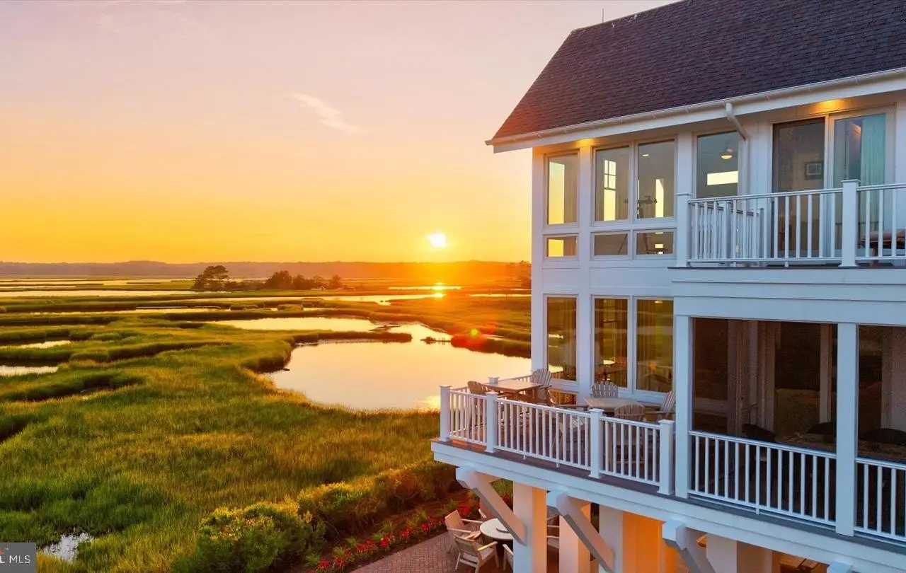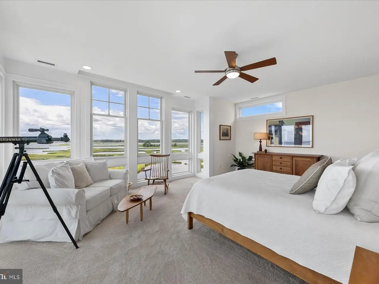 Take in unparalleled panoramic bay views from every room of this sophisticated modern beach home, ideally located on one of the most sought-after bayfront properties with water on three sides of the home. Complete with a private 50-foot dock, boat lift, and double jet ski lift, this exceptional residence was impressively designed, featuring high-end finishes and craftsmanship throughout. The expansive great room, with floor-to-ceiling windows on two sides, effortlessly frames sweeping views of the water and seamlessly blends the living, dining, and gourmet kitchen spaces. A large work island, bar with seating, and premium appliances elevate this culinary and entertaining space with easy access to a screened porch and open deck with views that are unable to be duplicated. The main level also offers a cozy family room, two guest bedrooms, and a full bathroom, along with a convenient powder room for guests. Upstairs, the bayfront primary suite is a tranquil retreat with its own private waterfront deck. Three generously-sized guest rooms each feature en-suite bathrooms, ensuring ample space and privacy for visitors. On the ground level, a spacious workshop and covered patio provide the perfect setting for crab feasts and relaxation, while the brick paver patio offers an ideal spot for evening bonfires by the water. The outdoor shower with a changing area makes clean-ups after a day on the beach or boat a breeze, and a two-car garage plus second one-car garage provide ample storage and convenience for all your vehicles, beach gear, kayaks, canoes, boating accessories, and bikes. Additional highlights include an elevator shaft for future conversion, geothermal hvac, and a location that's impossible to duplicate-situated on a peninsula with sweeping views of the bay and wetlands, yet just moments from the beach. Homes of this caliber, in such a prime location, are a rare offering.