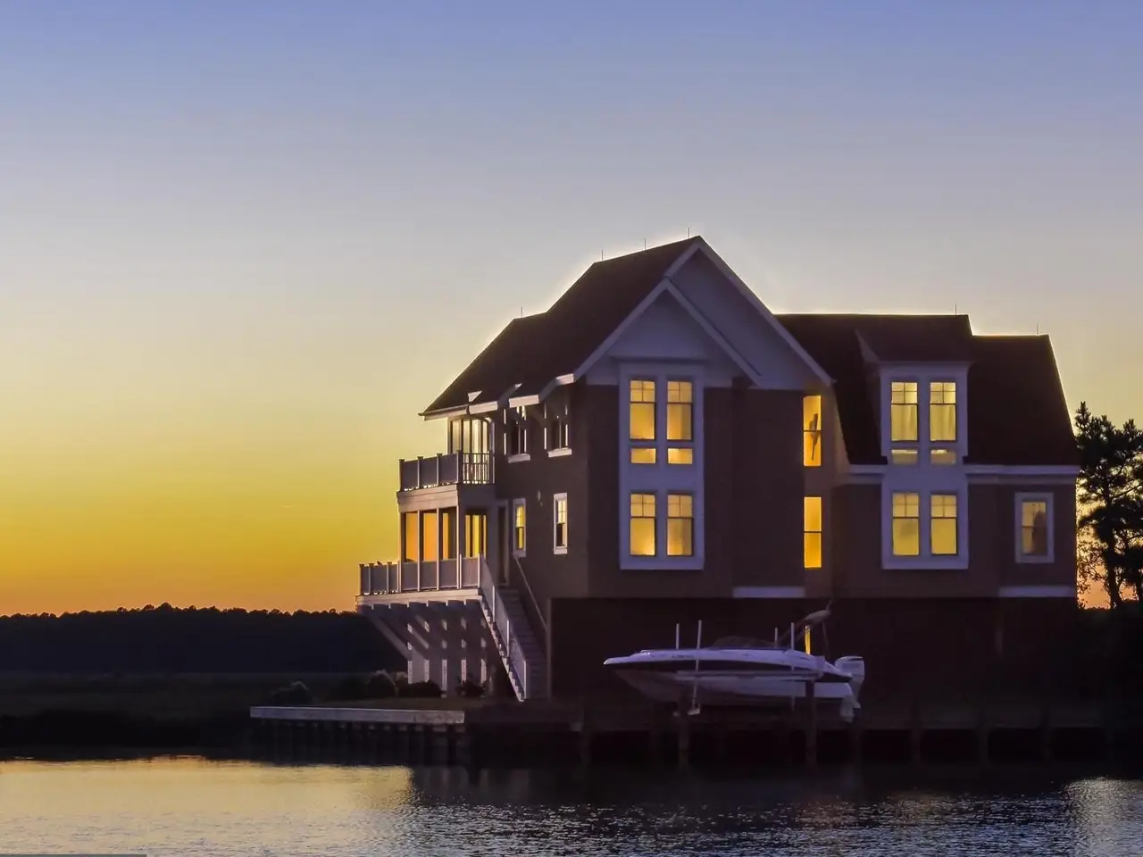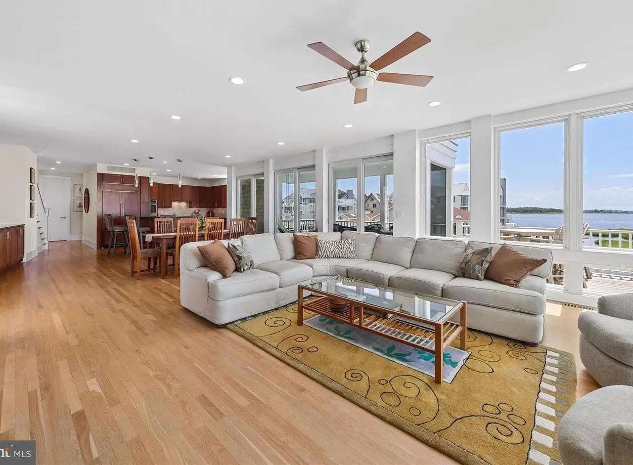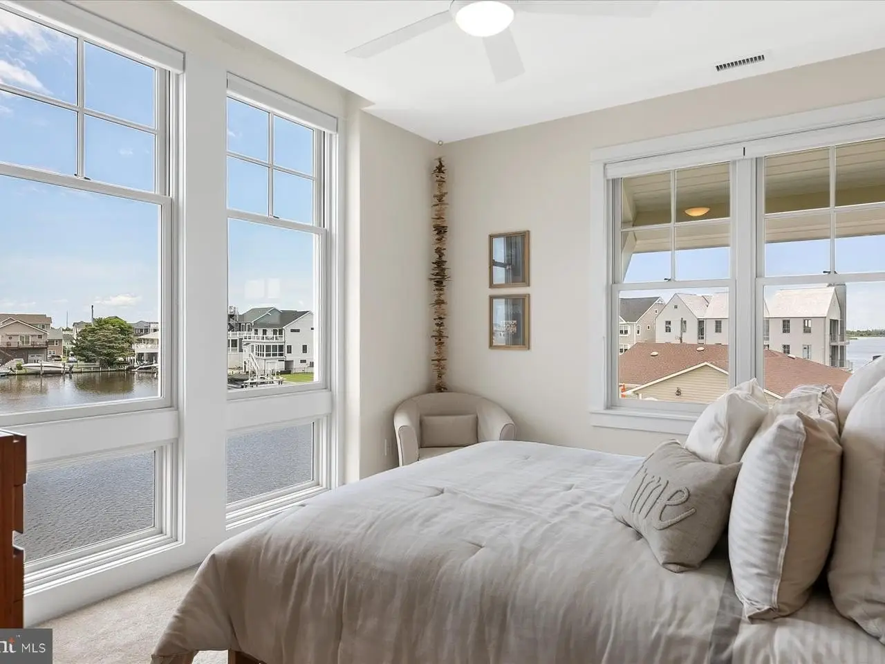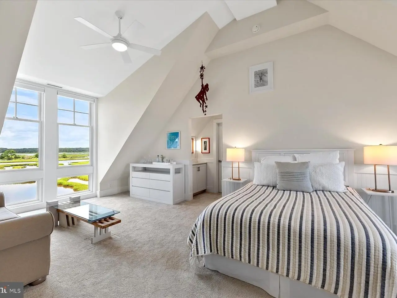 Take in unparalleled panoramic bay views from every room of this sophisticated modern beach home, ideally located on one of the most sought-after bayfront properties with water on three sides of the home. Complete with a private 50-foot dock, boat lift, and double jet ski lift, this exceptional residence was impressively designed, featuring high-end finishes and craftsmanship throughout. The expansive great room, with floor-to-ceiling windows on two sides, effortlessly frames sweeping views of the water and seamlessly blends the living, dining, and gourmet kitchen spaces. A large work island, bar with seating, and premium appliances elevate this culinary and entertaining space with easy access to a screened porch and open deck with views that are unable to be duplicated. The main level also offers a cozy family room, two guest bedrooms, and a full bathroom, along with a convenient powder room for guests. Upstairs, the bayfront primary suite is a tranquil retreat with its own private waterfront deck. Three generously-sized guest rooms each feature en-suite bathrooms, ensuring ample space and privacy for visitors. On the ground level, a spacious workshop and covered patio provide the perfect setting for crab feasts and relaxation, while the brick paver patio offers an ideal spot for evening bonfires by the water. The outdoor shower with a changing area makes clean-ups after a day on the beach or boat a breeze, and a two-car garage plus second one-car garage provide ample storage and convenience for all your vehicles, beach gear, kayaks, canoes, boating accessories, and bikes. Additional highlights include an elevator shaft for future conversion, geothermal hvac, and a location that's impossible to duplicate-situated on a peninsula with sweeping views of the bay and wetlands, yet just moments from the beach. Homes of this caliber, in such a prime location, are a rare offering.