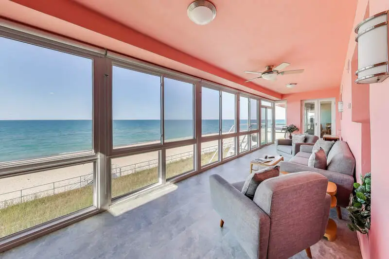 Pretty in Pink. This nearly 200 feet of frontage feels more like 1000 feet, given the separation from other homes and vacant land. If you wanted to be the Great Gatsby, this is the home to make it happen. No property taxes for the next 50 years for the person or company that takes over this lease. An art deco vibe of the glory days of Hollywood in this fully restored home from the Century of Progress World's Fair in 1933. All the work has been done for the next generation of stewards of this once-in-a-lifetime opportunity. Share this opportunity with three friends and be in this beach home 50 miles from downtown Chicago for 600K each. Maybe create a corporate retreat for your company to help retain those valuable employees or clients. The home awaits lavish parties where champagne is flowing, and the skyline of Chicago stands tall at sunset as a reminder of why we plant our flag on this part of the globe. Let's explore all the options for this estate on the big lake.