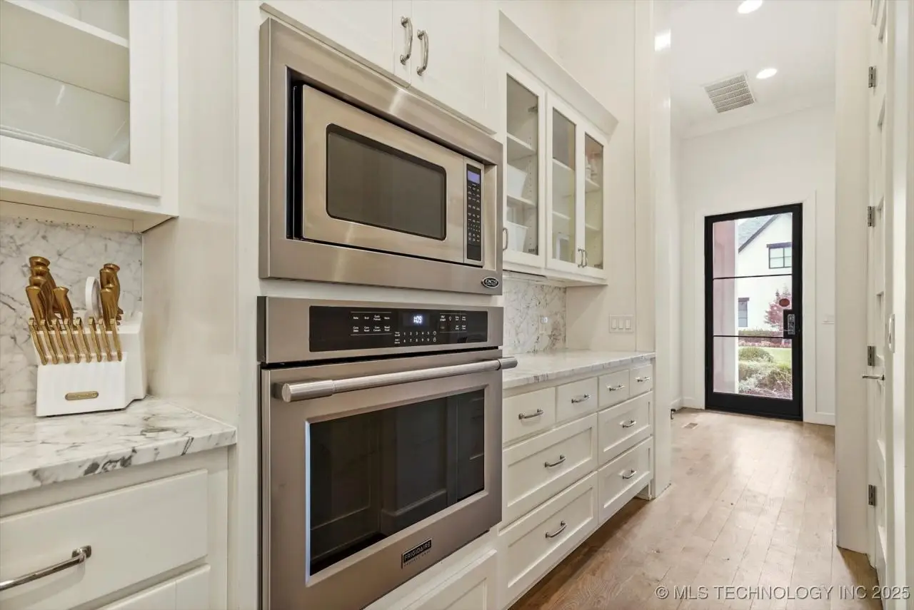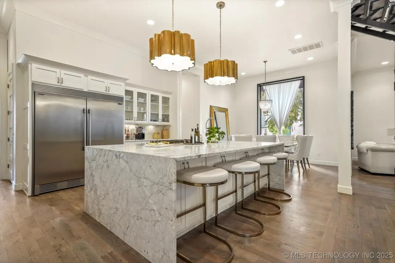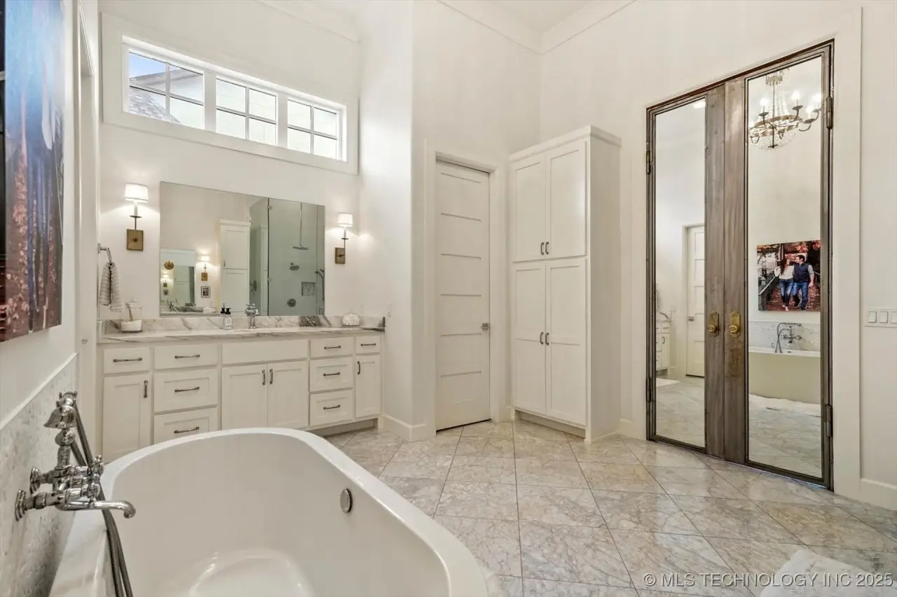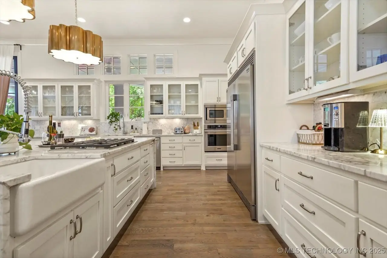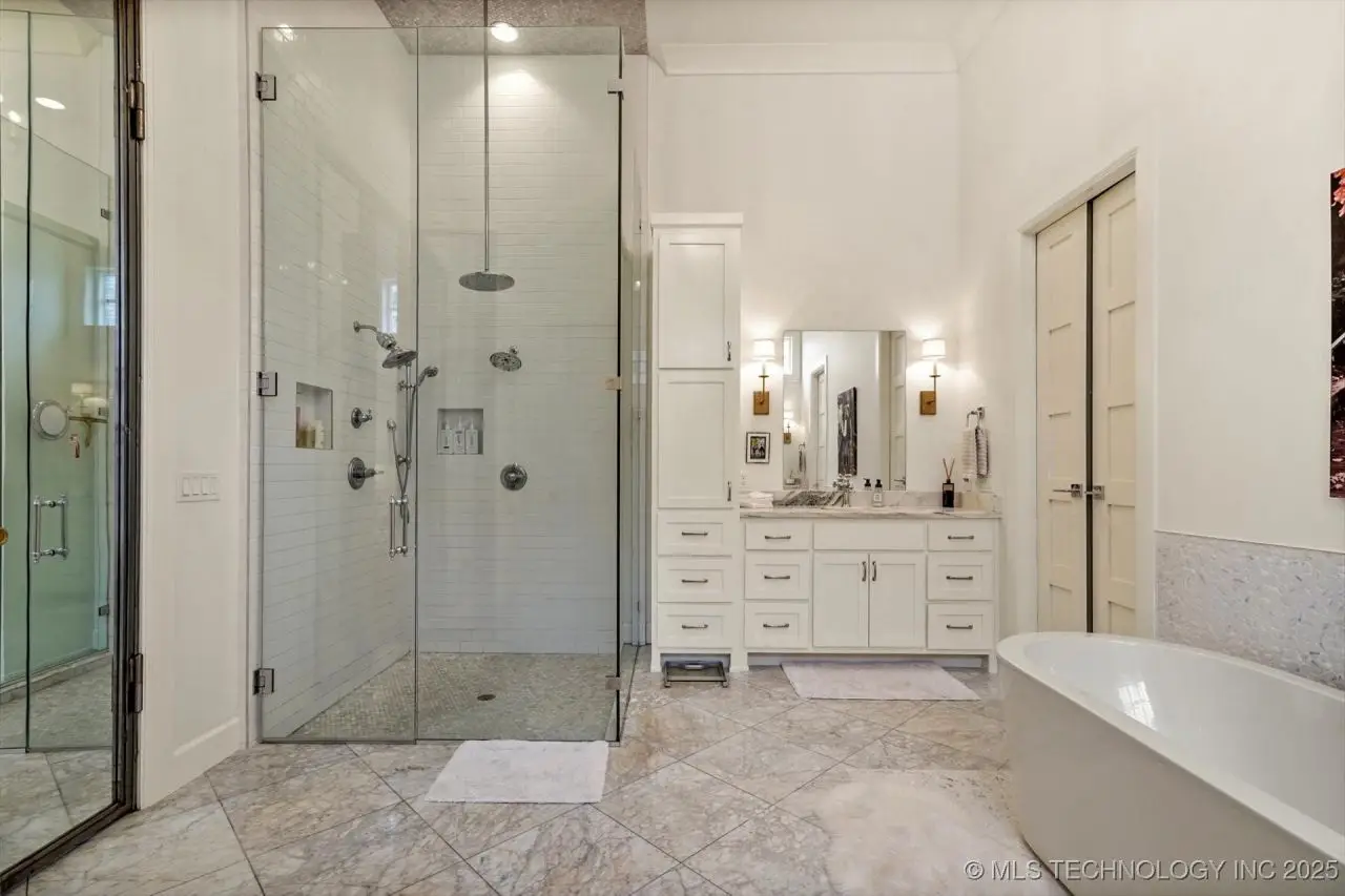 Welcome to this beautiful home in the gated community of Woodmere. This custom one-of-a-kind home, built by Rob Key with over 5,800 Square Feet (AP), features five spacious bedrooms, four Full Baths, two Half Baths, with a three Car Garage. Four of the bedrooms have their own private bath and walk-in closets. The master suite and guest bedroom are on the main floor, along with a half bath. Upstairs, you will find three more bedrooms, two with private baths and large walk-in closets, spacious fifth bedroom that could be used as a game room/gym. Separate theater room plus an open bonus area with wet bar and half bath. Soaring Ceilings throughout with 12 foot doors. It also includes a separate office off the entry. The large kitchen is the heart of the home, featuring a striking center island with marble waterfall countertop, two sinks, Sub-Zero refrigerator with a recently updated Dishwasher. The spacious laundry room has a sink with ample cabinets for storage and space for an additional refrigerator. The master bedroom is a luxurious retreat. Its bathroom includes custom his-and-hers closets, separate vanities, a soaking tub, and a walk-in shower with multiple showerheads, including a rainfall feature. The doors to the master suite are made from reclaimed cypress wood from Louisiana. High-end lighting from Visual Comfort illuminates every area of the home. Enjoy the outdoors on two large balconies in the front and back of the house. The home has elegant 12-foot iron exterior doors with a stunning Iron staircase with a built-in wine cellar. The backyard has two separate patios, off the Master & Living with a fireplace. Built in Sonos speakers outside and a custom 36x30 Basketball Court with turf. Eight foot Full Privacy fence on a corner Lot in a cul-de-sac. A must-see home in the heart of South Bixby. Schedule your appointment today.