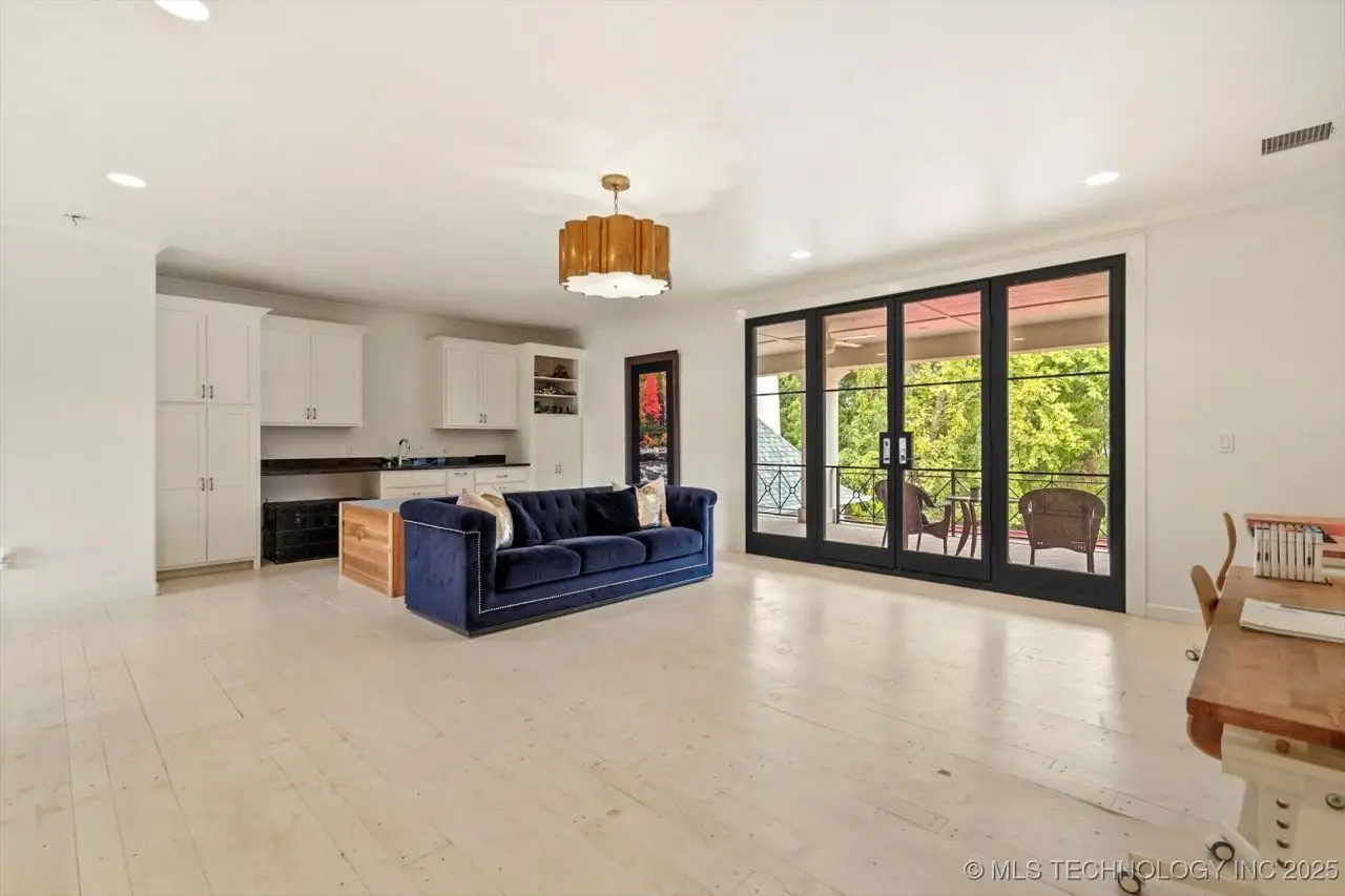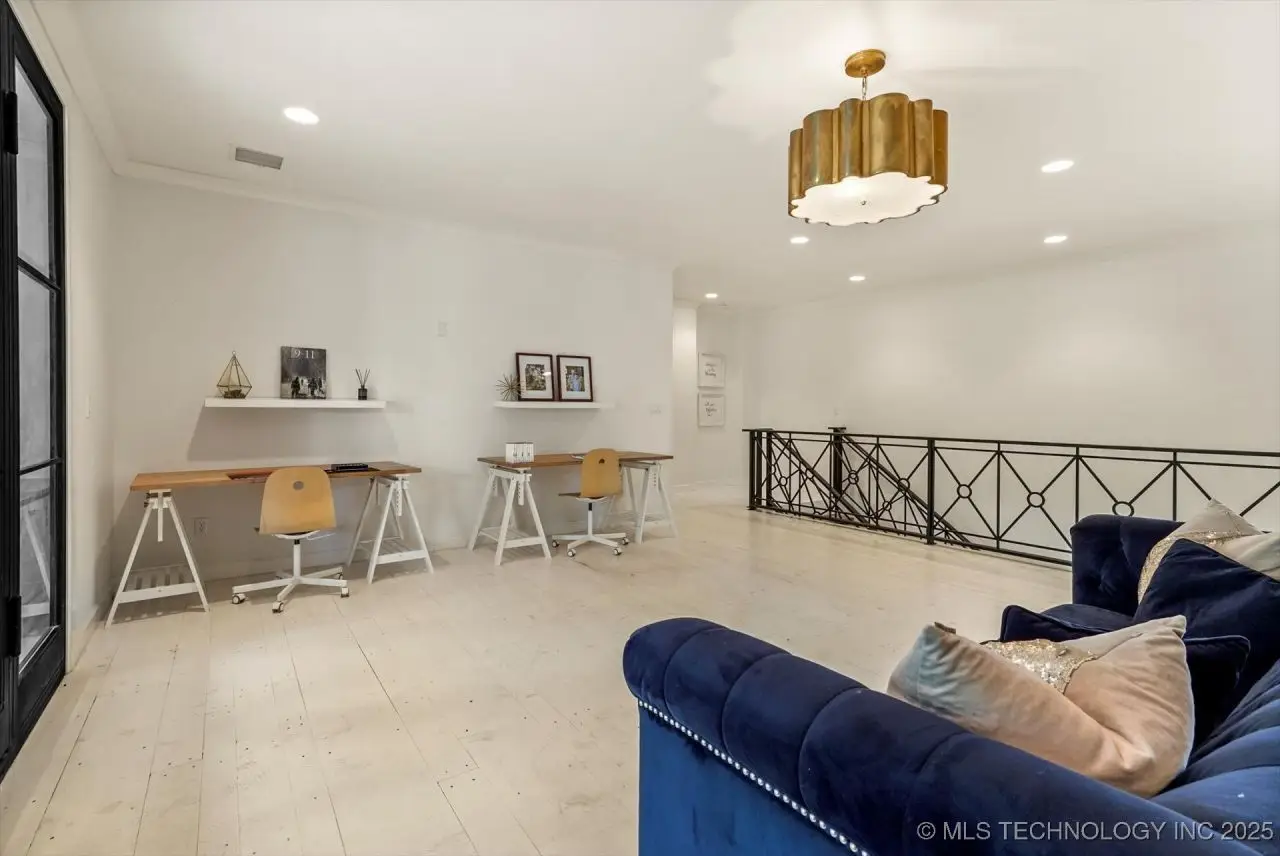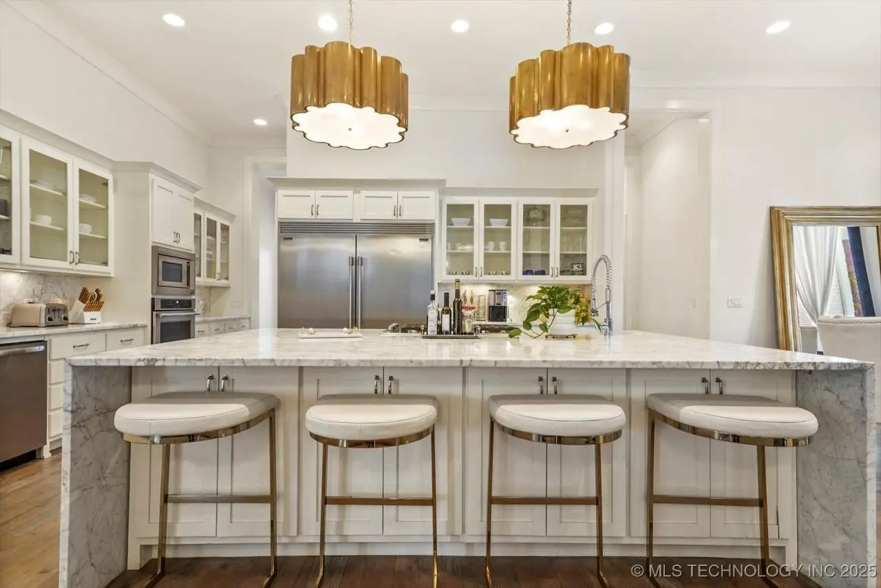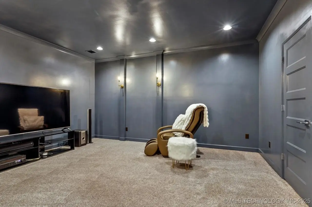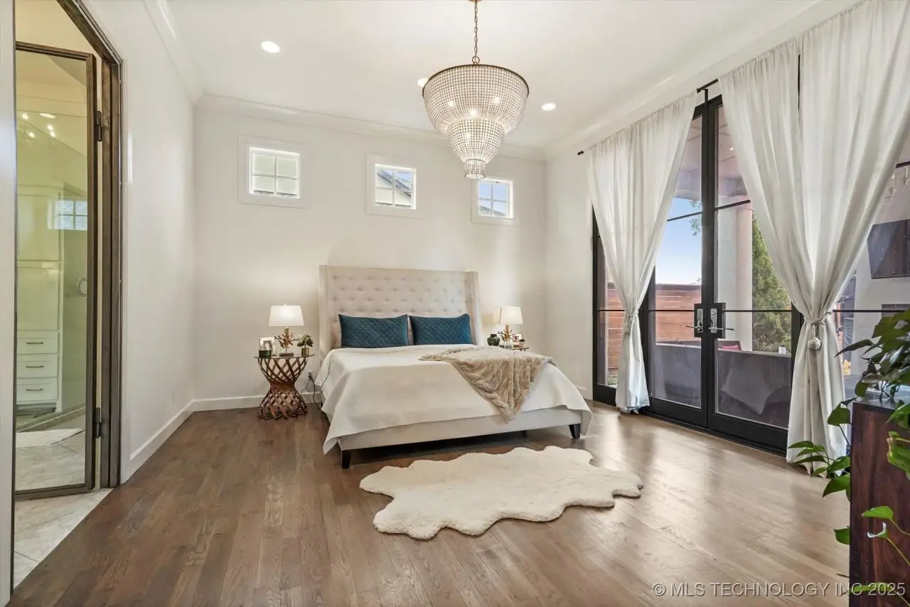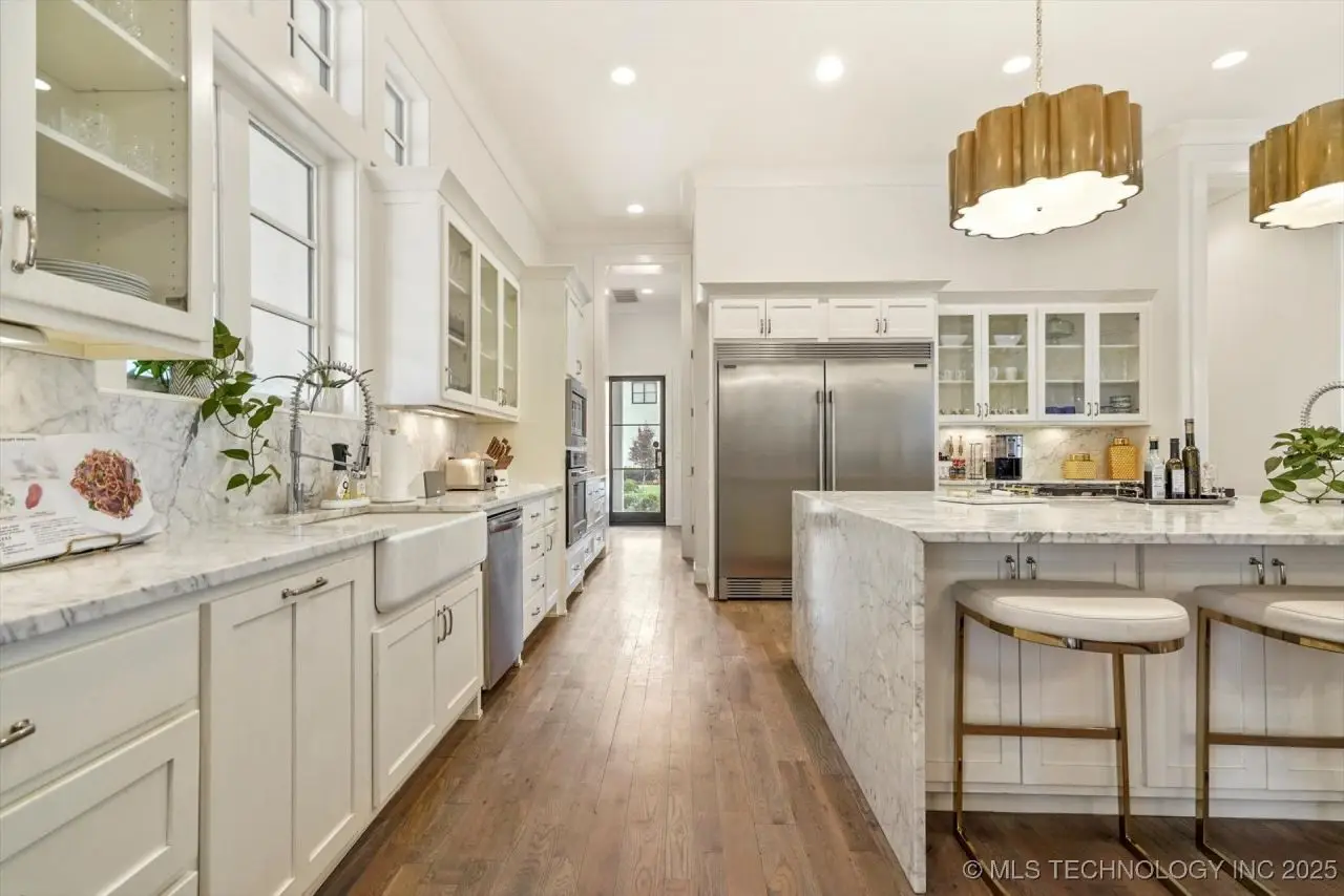 Welcome to this beautiful home in the gated community of Woodmere. This custom one-of-a-kind home, built by Rob Key with over 5,800 Square Feet (AP), features five spacious bedrooms, four Full Baths, two Half Baths, with a three Car Garage. Four of the bedrooms have their own private bath and walk-in closets. The master suite and guest bedroom are on the main floor, along with a half bath. Upstairs, you will find three more bedrooms, two with private baths and large walk-in closets, spacious fifth bedroom that could be used as a game room/gym. Separate theater room plus an open bonus area with wet bar and half bath. Soaring Ceilings throughout with 12 foot doors. It also includes a separate office off the entry. The large kitchen is the heart of the home, featuring a striking center island with marble waterfall countertop, two sinks, Sub-Zero refrigerator with a recently updated Dishwasher. The spacious laundry room has a sink with ample cabinets for storage and space for an additional refrigerator. The master bedroom is a luxurious retreat. Its bathroom includes custom his-and-hers closets, separate vanities, a soaking tub, and a walk-in shower with multiple showerheads, including a rainfall feature. The doors to the master suite are made from reclaimed cypress wood from Louisiana. High-end lighting from Visual Comfort illuminates every area of the home. Enjoy the outdoors on two large balconies in the front and back of the house. The home has elegant 12-foot iron exterior doors with a stunning Iron staircase with a built-in wine cellar. The backyard has two separate patios, off the Master & Living with a fireplace. Built in Sonos speakers outside and a custom 36x30 Basketball Court with turf. Eight foot Full Privacy fence on a corner Lot in a cul-de-sac. A must-see home in the heart of South Bixby. Schedule your appointment today.