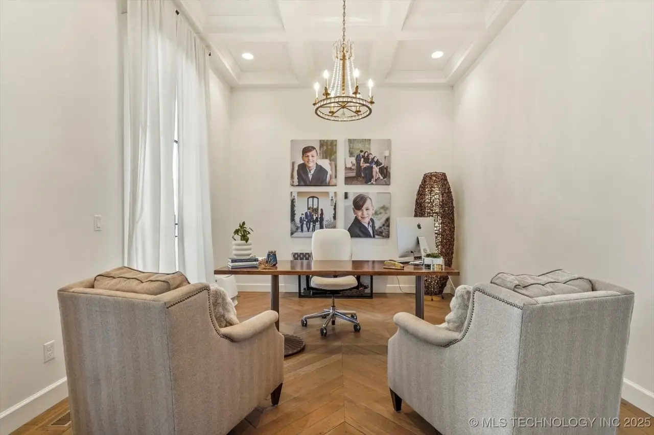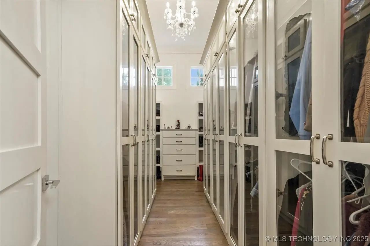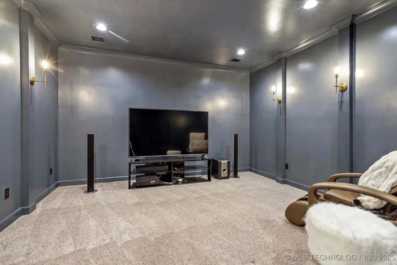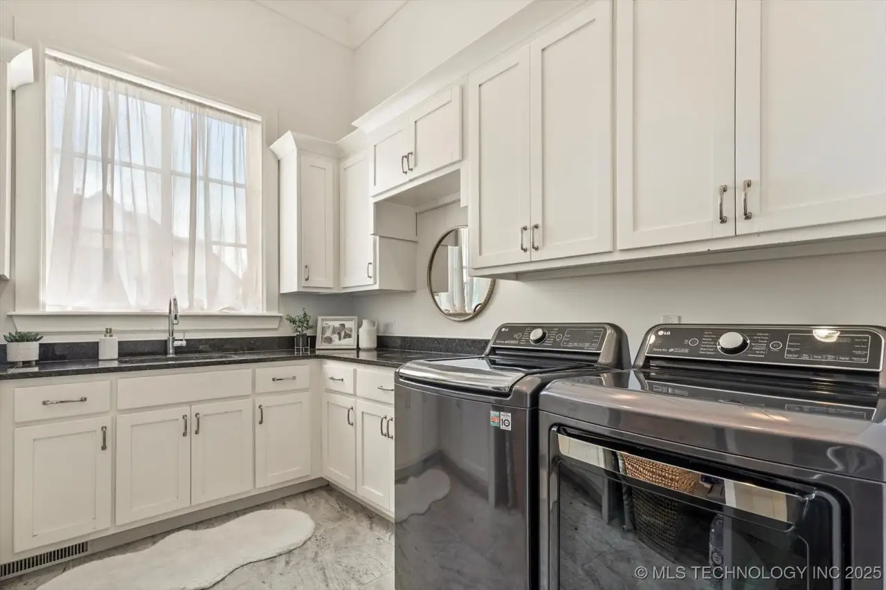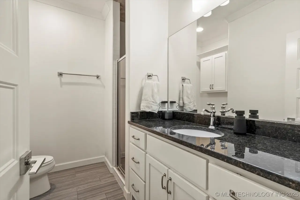 Welcome to this beautiful home in the gated community of Woodmere. This custom one-of-a-kind home, built by Rob Key with over 5,800 Square Feet (AP), features five spacious bedrooms, four Full Baths, two Half Baths, with a three Car Garage. Four of the bedrooms have their own private bath and walk-in closets. The master suite and guest bedroom are on the main floor, along with a half bath. Upstairs, you will find three more bedrooms, two with private baths and large walk-in closets, spacious fifth bedroom that could be used as a game room/gym. Separate theater room plus an open bonus area with wet bar and half bath. Soaring Ceilings throughout with 12 foot doors. It also includes a separate office off the entry. The large kitchen is the heart of the home, featuring a striking center island with marble waterfall countertop, two sinks, Sub-Zero refrigerator with a recently updated Dishwasher. The spacious laundry room has a sink with ample cabinets for storage and space for an additional refrigerator. The master bedroom is a luxurious retreat. Its bathroom includes custom his-and-hers closets, separate vanities, a soaking tub, and a walk-in shower with multiple showerheads, including a rainfall feature. The doors to the master suite are made from reclaimed cypress wood from Louisiana. High-end lighting from Visual Comfort illuminates every area of the home. Enjoy the outdoors on two large balconies in the front and back of the house. The home has elegant 12-foot iron exterior doors with a stunning Iron staircase with a built-in wine cellar. The backyard has two separate patios, off the Master & Living with a fireplace. Built in Sonos speakers outside and a custom 36x30 Basketball Court with turf. Eight foot Full Privacy fence on a corner Lot in a cul-de-sac. A must-see home in the heart of South Bixby. Schedule your appointment today.