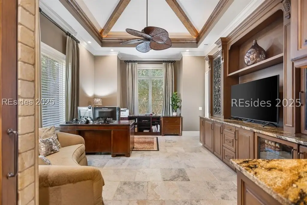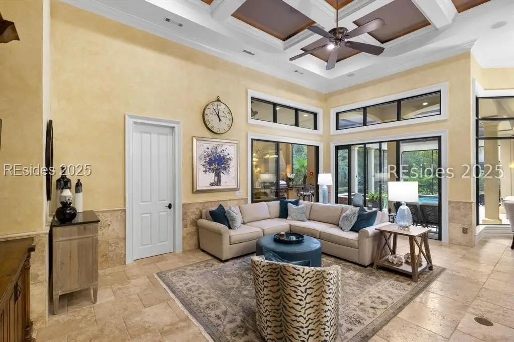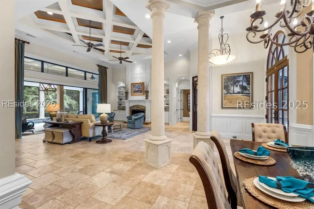 Discover an exceptional opportunity to own a custom-built home in the heart of Berkeley Hall Club, offered well below today's cost of comparable new construction homes! Designed with timeless Lowcountry elegance and every detail in mind, this residence combines luxurious interiors with an unmatched outdoor lifestyle. The home welcomes with dramatic soaring ceilings of backlit coffered trays and extensive custom millwork that set the tone for its refined style. Multiple living areas flow seamlessly for both entertaining and everyday comfort. A private office offers the perfect retreat for work, while a separate in-law suite provides guests with comfort and privacy. The gourmet kitchen and full bar area feature multiple built-in full-sized wine coolers, enhancing both function and sophistication. Step outside to experience one of the homes true highlights: a private saltwater pool and spa surrounded by an oversized covered lanai. Here, an outdoor kitchen, dining space, and sitting area with fireplace create an inviting year-round retreat for entertaining or relaxing in total privacy. With 4 spacious bedrooms, 4 full baths, and 2 half baths, the home offers flexibility for family and guests alike. The owners' suite is a sanctuary, complete with a spa-like bath, private fountain, and direct access to the lanai. Secondary bedrooms are generously sized, and every detail has been carefully crafted to enhance comfort including ensuite baths for each. Perfectly positioned on a private lot yet just a short stroll to the Clubhouse, fitness center, and world-class golf, this home offers both convenience and seclusion. Whether hosting friends for cocktails poolside, enjoying a quiet morning coffee on the lanai, or retreating to the elegance of the great room, this home delivers a lifestyle difficult to recreate.