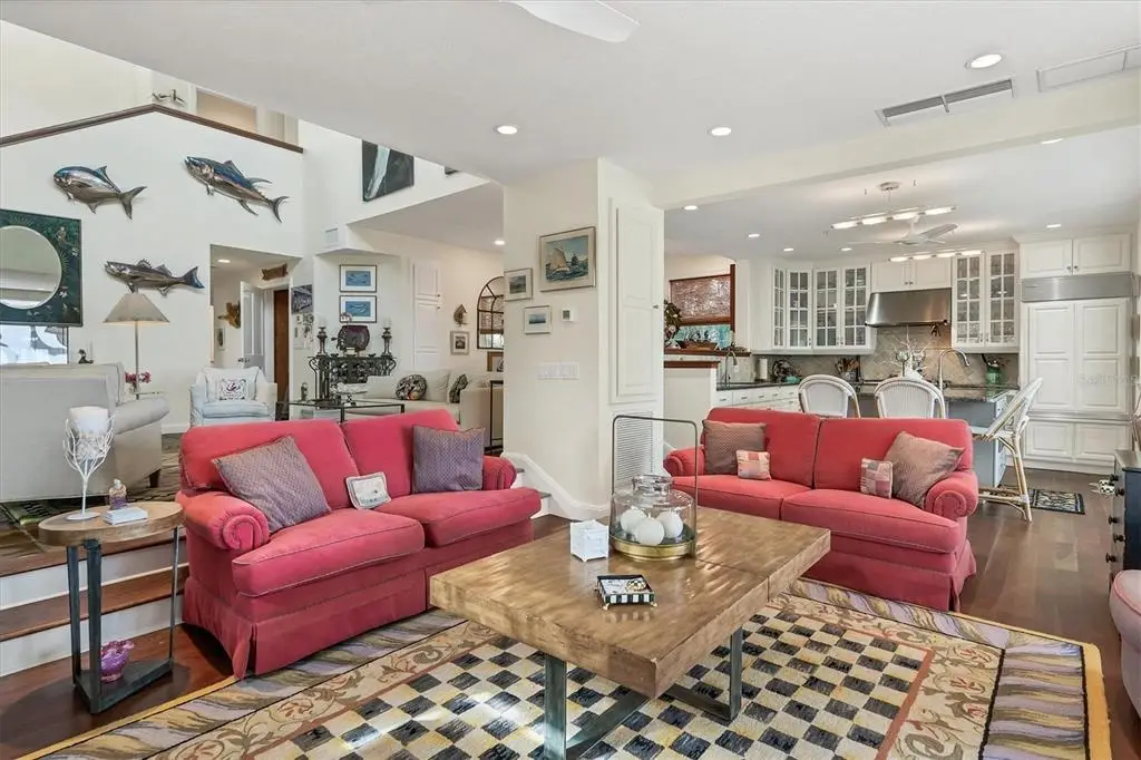 This unique bayfront home offers stunning sunrises and moonscapes over Charlotte Harbor. The spacious open main floor begins with an entry leading into the two-story living room with hand painted coffered ceiling. This space is accented by the hand painted staircase, custom tera cotta tile floors and a fireplace surrounded by a hand carved pecky cypress mantle. The adjoining dining room continues into the heart of the home providing quiet dining and harbor views. Step down into the kitchen and open family room. The kitchen is completely updated with stainless appliances, granite countertops and a spacious island with a second sink. Both rooms feature cherry flooring, custom woodwork and designer cabinetry with storage features. Adjacent to the kitchen and family room, a waterfront sunroom spans the width of the home, leading to a custom, window filled stairwell to the first-floor storerooms, doubled garage spaces and a garden patio. The property finishes with a garden view leading to the mangrove coastline. There are two large main level guest rooms, one en-suite and a second with an adjacent full bath. The upstairs primary suite welcomes you with built-in shelving and desk, vaulted ceiling and expansive windows facing Charlotte Harbor. The open Roman bath, large walk-in closet and laundry room complete the space. Open the large French doors in the primary bedroom to enter a private deck with amazing harbor views. To complete the deck, a circular staircase leads to a widow's walk with a panoramic view of Gasparilla Island and beyond. Additional highlights include a finished elevator to the first floor, impact glass on all windows and doors, a new metal roof installed in 2023 and all interior walls freshly painted. This North Bay gem, in the amenity rich Boca Bay community, is a true sanctuary combining location, style and natural beauty.