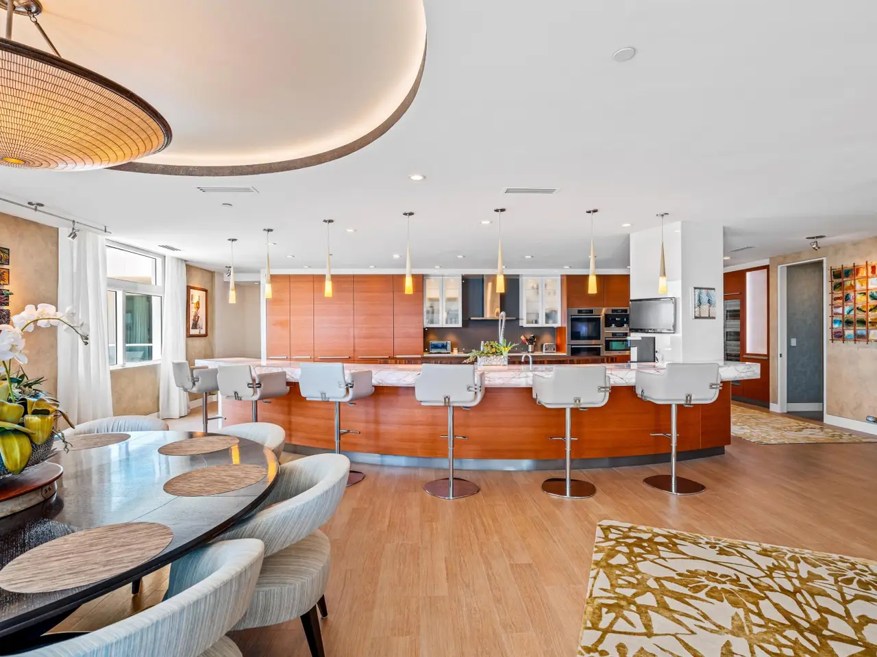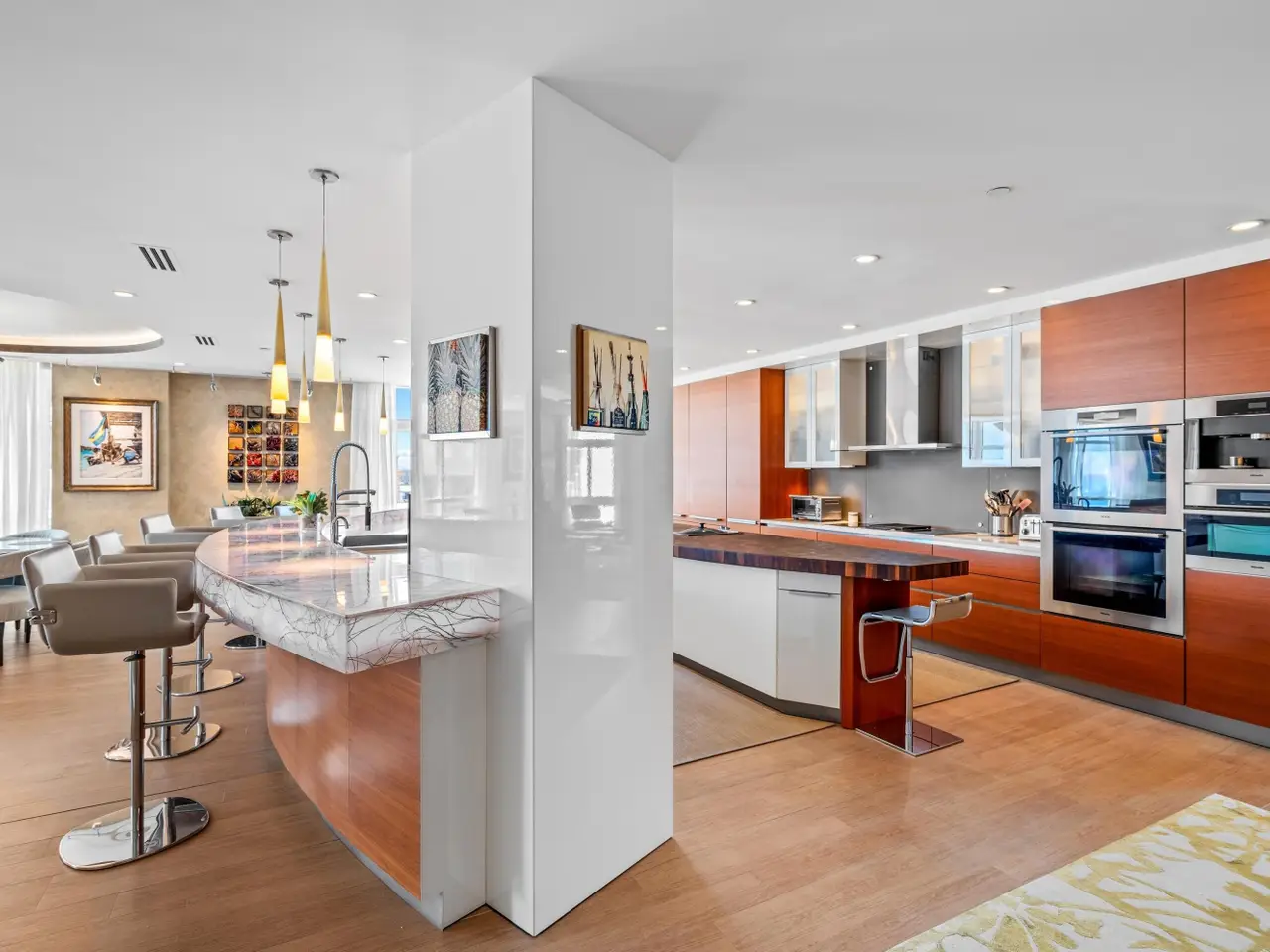 Custom-designed direct oceanfront, fully-furnished 4-bedroom double residence at The Aragon with an oceanfront cabana. Designed, executed and furnished with the finest detail by decorators unlimited. Stunning water views immediately upon entry from the private elevator. Oceanfront living room with adjoining den and library opens to a large oceanfront balcony. Limestone floors, detailed ceilings, Crestron home automation system, custom finishes and furnishings compliment stunning architecture. Chef’s kitchen with double islands, custom cabinetry and commanding views. A well-appointed primary suite offers ocean and city views, a fabulous bath with sauna and a great office overlooking the water. Three additional bedroom suites plus a media room. Aragon is a full-service, concierge building.
