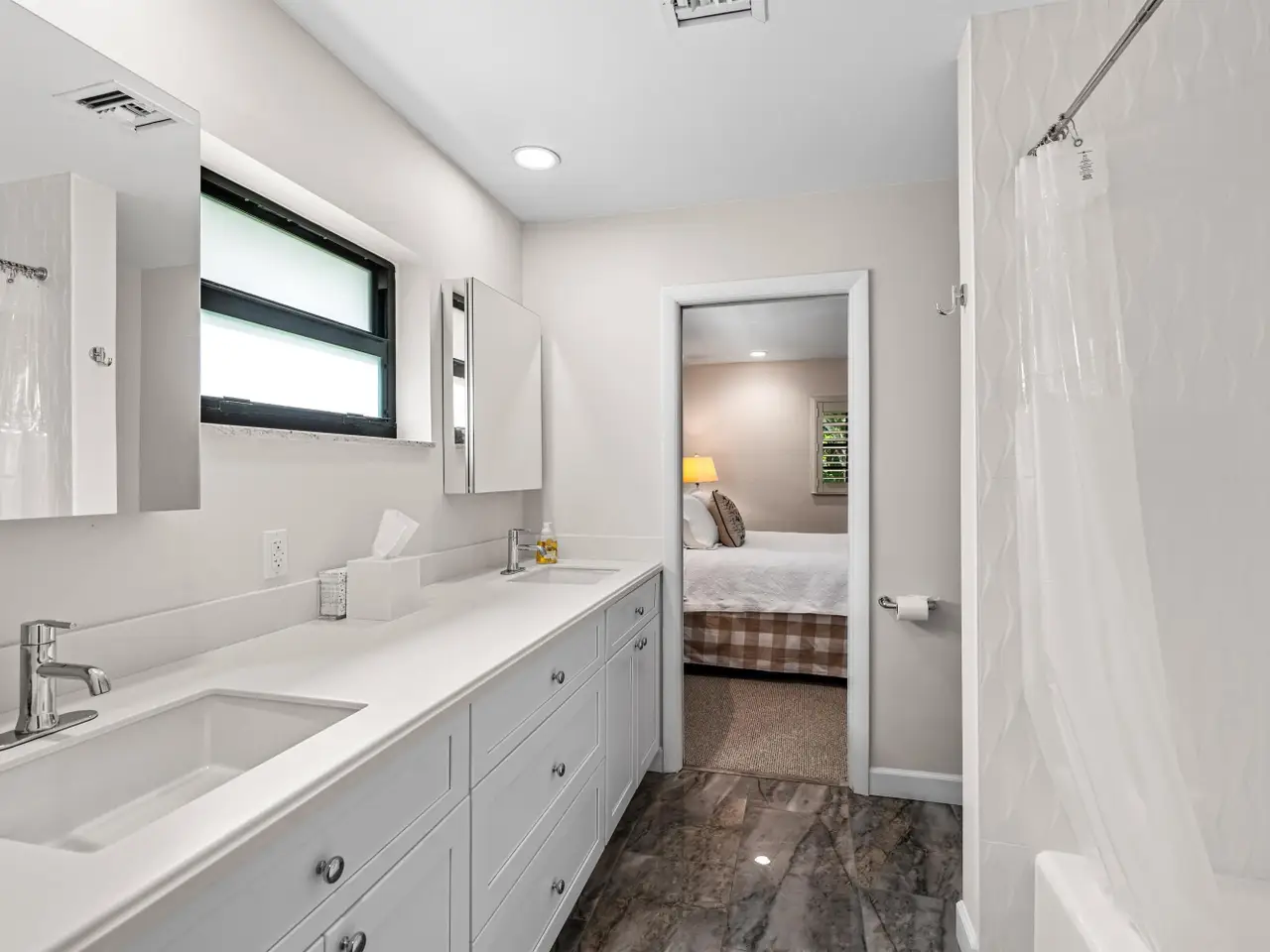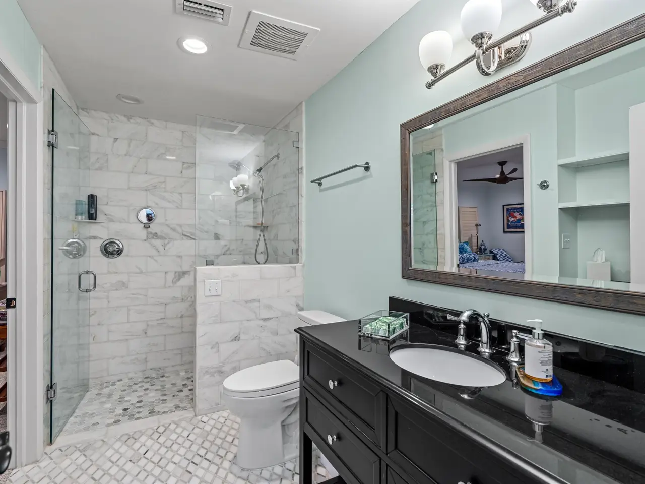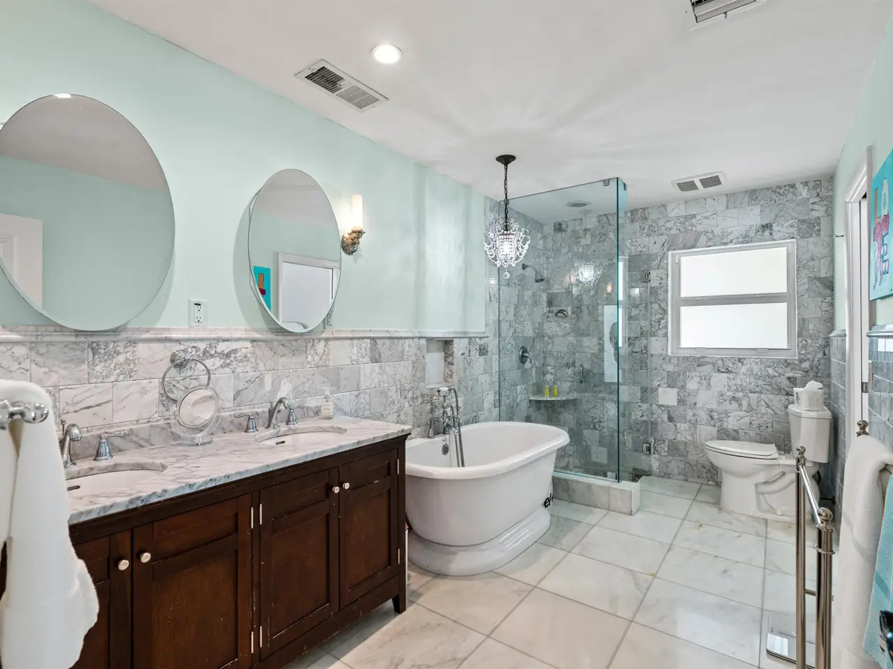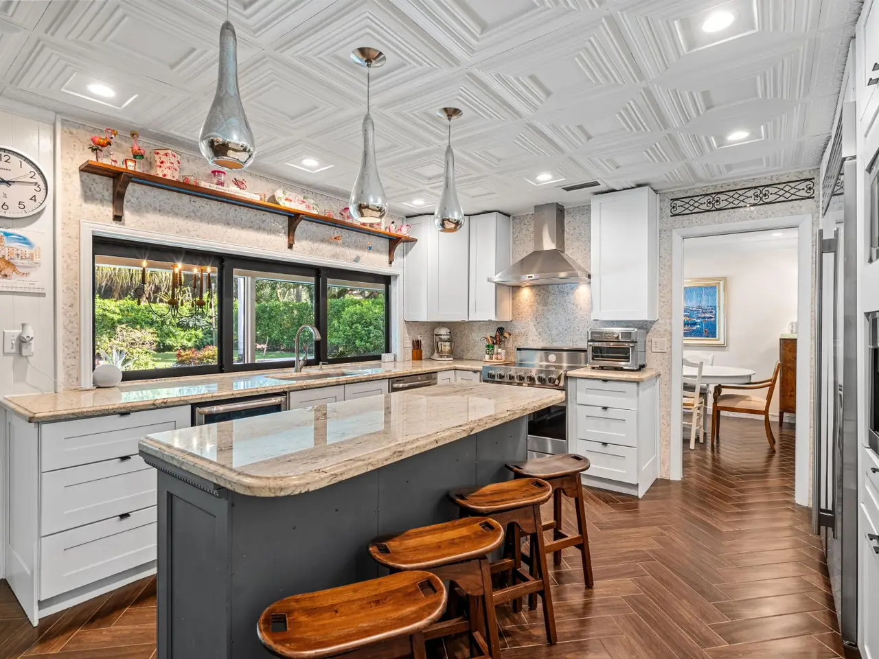 On a coveted park-like 0.4+/- acre corner lot in the heart of Old Floresta, this light-filled split-plan one-story features a reimagined primary suite with Carrara marble spa bathroom and oversize boutique closet, gourmet breakfast bar island kitchen w/top appliances, light-infused living room, formal dining room, family room, 3 guestrooms, office, impact windows/doors; 34'x16' heated saline pool.
