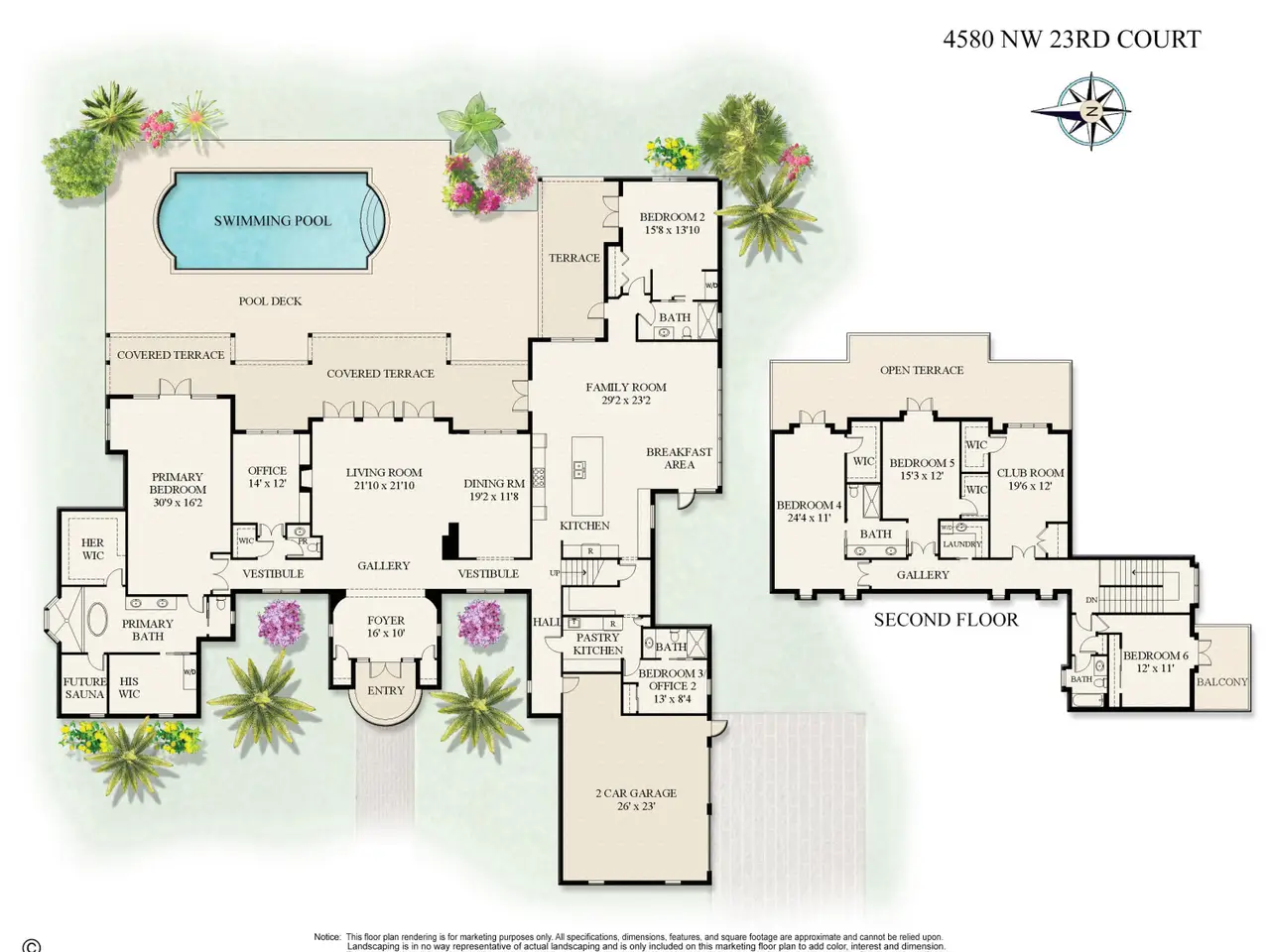 Six bedroom/5.1 bath Palm Beach-Inspired Stately residence in LES JARDINS, a highly coveted enclave within five minutes of Pine Crest and St. Andrews Schools and within Spanish River HS district. Evoking timeless grandeur, the hallmarks of this home are high ceilings, impressive room sizes, and floor to ceiling windows.This residence has been completely renovated with exquisite materials and master craftmanship & NEVER OCCUPIED.The thoughtful floor plan includes an expansive kichen/family room/dining area, a catering kitchen, 2 first floor offices w/custom built-ins (one of the offices could be the 6th bedroom), a Club Room, 3 laundry areas, & ensuite w/separate entrance. Les Jardins offers a 24-hour manned gate, 1/2 acre lots,Tennis Courts and Clubhouse with gym.