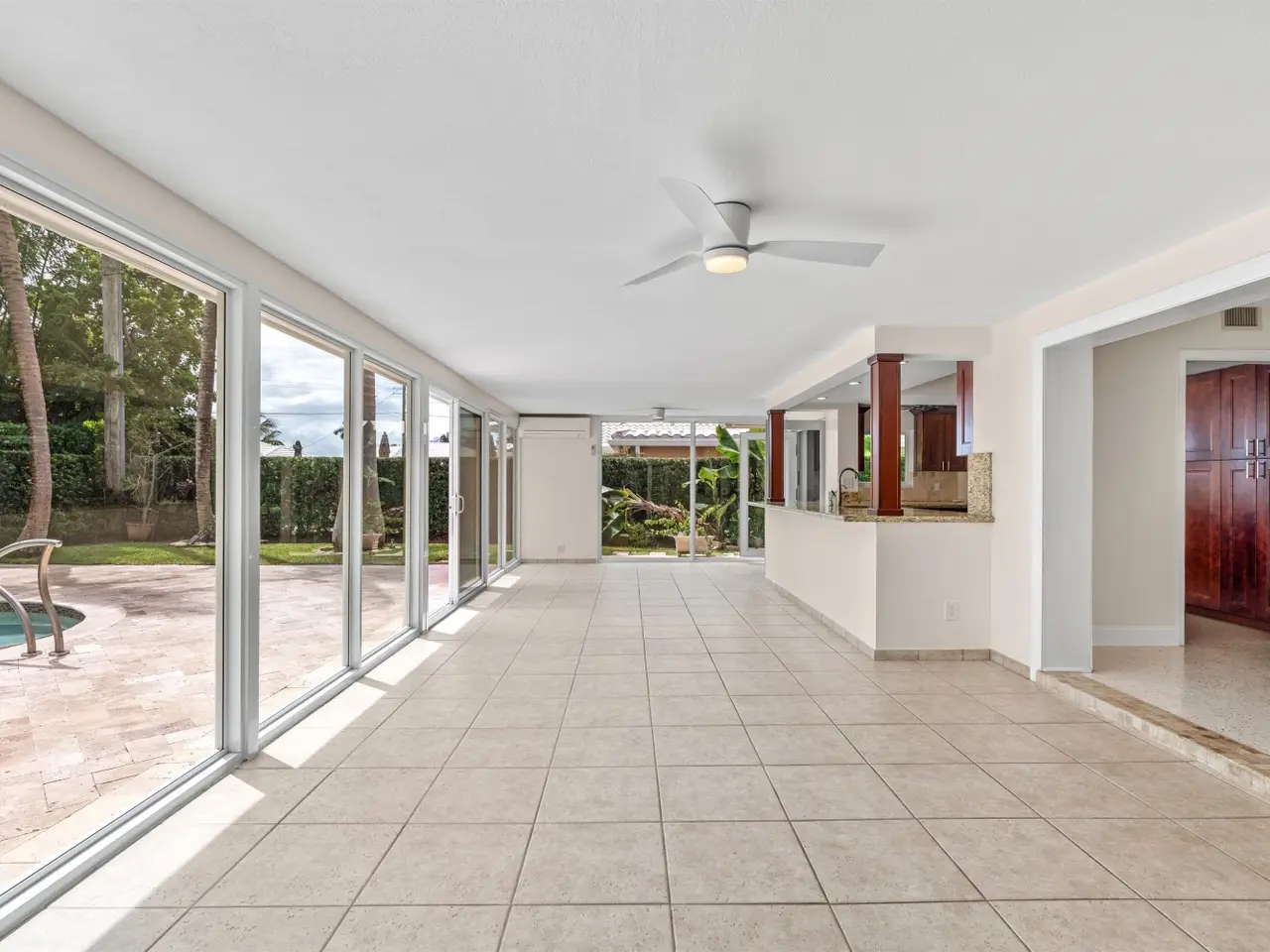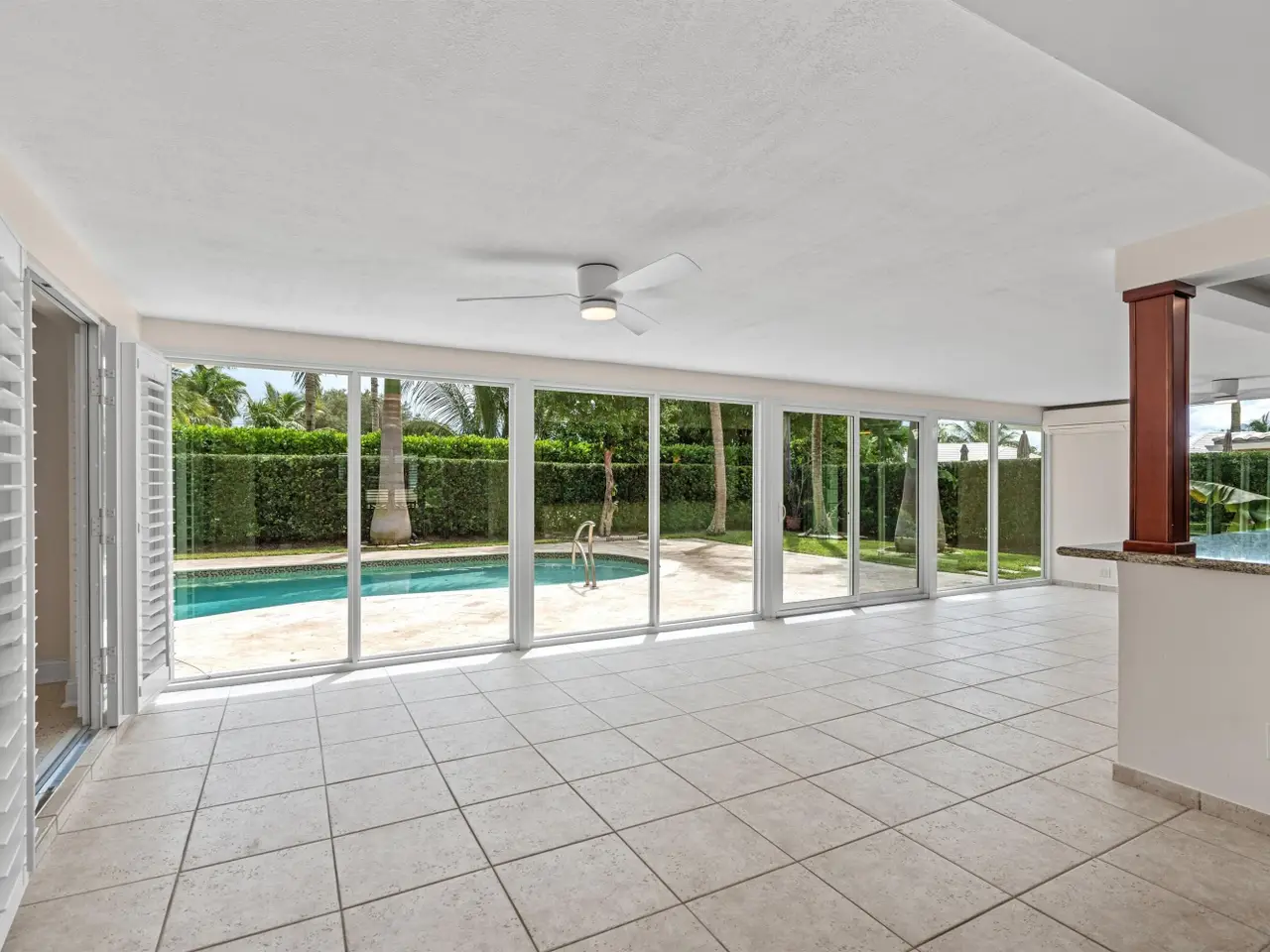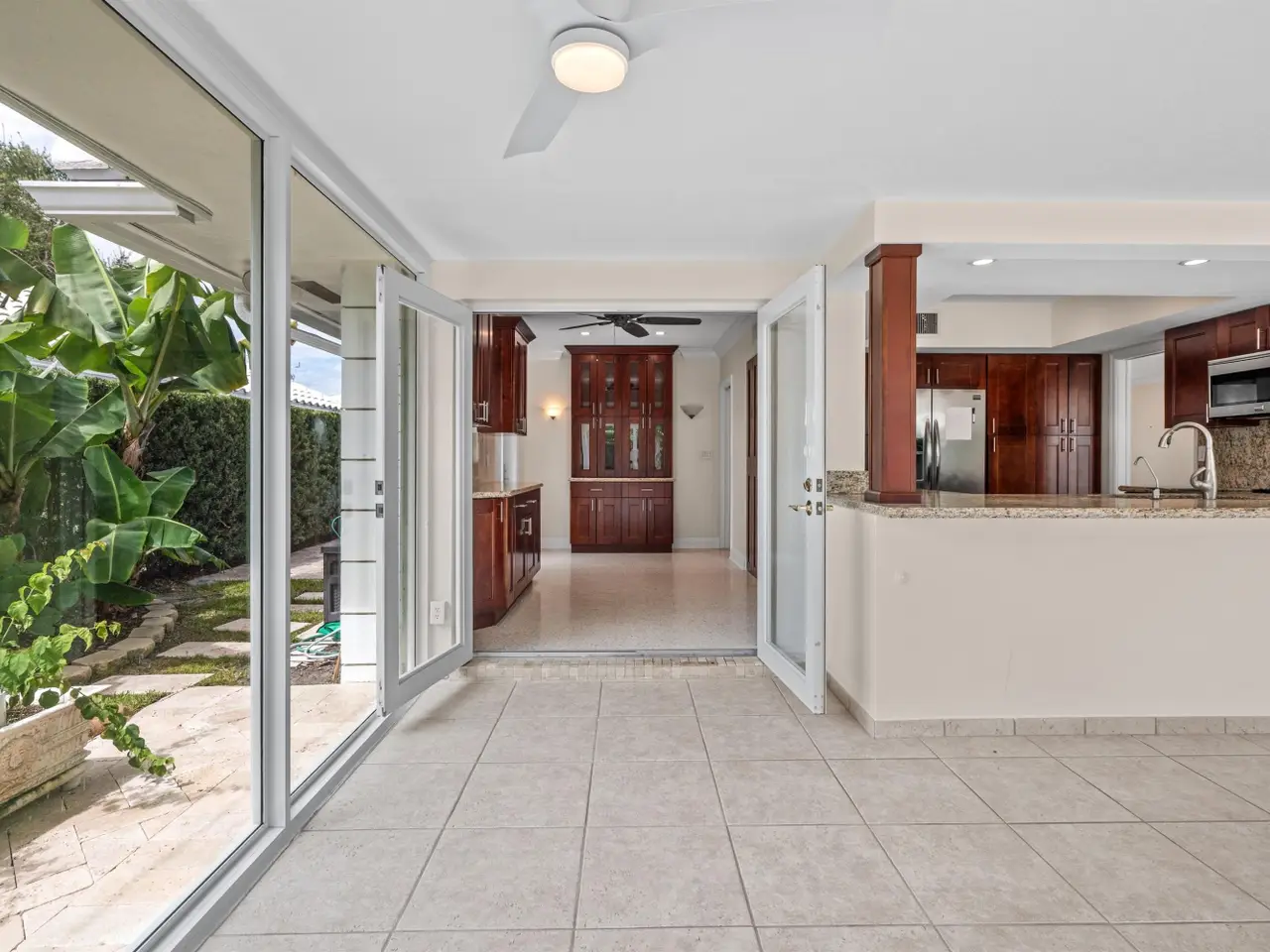 Located in desirable Camino Gardens, this classic Bermuda-style residence presents a harmonious blend of tropical character and modern sophistication, featuring an updated gourmet kitchen and designer bathrooms. The light-filled interiors span 2,539 +/- total square feet in a free-flowing, open floor plan. Architectural details include crown moldings and elegant plantation shutters. The central great room is perfectly situated for entertaining, serviced by a spacious bar connecting it to the kitchen. The kitchen is equipped with Mahogany Shaker cabinetry, granite countertops, and stainless-steel appliances. The adjoining breakfast nook offers a built-in buffet with glass showcase cabinetry.