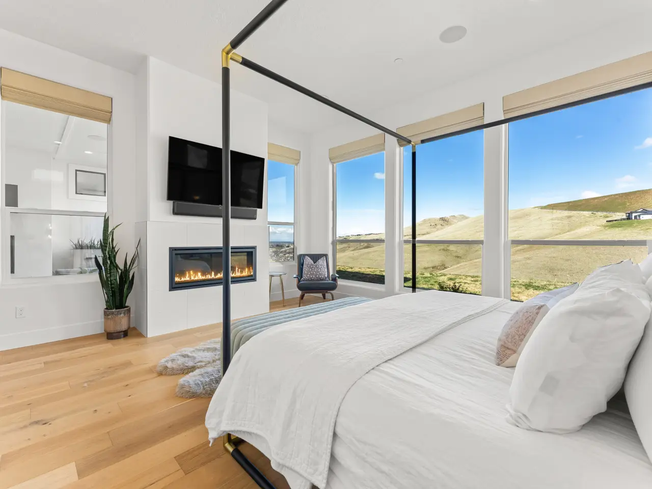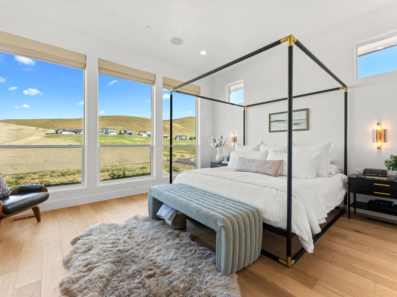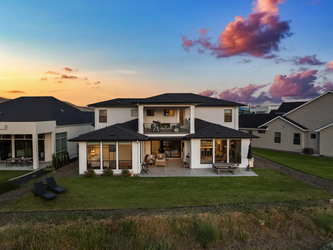 Poised at the end of a quiet cul-de-sac in the prestigious Pinnacle at Harris North community, this architectural masterpiece blends bold modern design with the natural beauty of the foothills. Perfectly positioned on a premier rim-lot, the home captures ever-changing skies & sparkling city lights. Spanning an impressive footprint, this home boasts 6 true bedrooms, dedicated office, expansive bonus room, & generous open-concept living areas. The chef’s kitchen stuns with a dramatic 12-foot island, ceiling-height custom cabinetry, a full-wall tile backsplash, & a premier suite of Bosch appliances. The main-level master is a private sanctuary, lined with picture windows that frame panoramic foothill views. Enjoy a cozy fireplace, spa-inspired en suite bath, & dual walk-in closets. Upstairs, a flexible bonus room with a wet bar and balcony takes advantage of the setting with 4 additional bedrooms to spread out. Enjoy fabulous community amenities with a pool & miles of trails right outside your front door!