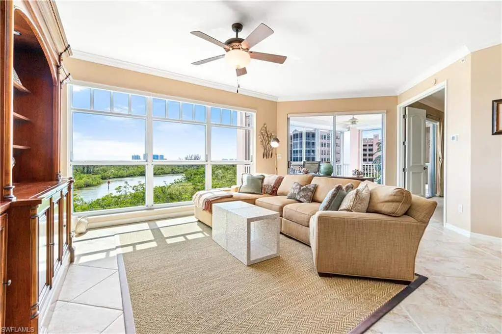 Beautiful unit with spectacular Bay views in coveted "Barefoot Beach Club"! This 3 bed/2 bath unit is located steps from the beach! Enjoy spectacular views of boats sailing by & dolphin, manatee & osprey enjoying the Bay waters from your spacious lanai with hurricane impact windows, electric storm shutters & a brand-new screen. This spectacular unit features an open floor plan, over 1,700 sq ft under air, tile flooring and wet bar with a built-in Sub-Zero wine cooler & refrigeration drawers. Spectacular entertainer's kitchen offers stunning custom wood cabinetry, granite countertops & high-end appliances including Thermador refrigerator, warmer, induction cooktop, double oven & microwave. Primary bedroom has stunning views of the Bay & a spacious bath offering dual vanities, a large frameless glass shower & ample amounts of storage space. Other features include under cabinet lighting, new automated Hunter Douglas blinds in living room & primary bedroom and a UV air purifying system in 2018. Nearby to the BRAND-NEW CLUBHOUSE with state-of-the-art fitness center & resort-style pool. Barefoot Beach residents enjoy 3 miles of beach, 2 pools/spas, manned/gated entry & on-site mgmt. OPTIONAL "Club at Barefoot" offers tennis, 2 restaurants & beachside food/bev/chair service. Excellent Collier County location minutes to Mercato, Waterside & easy access to RSW Airport.