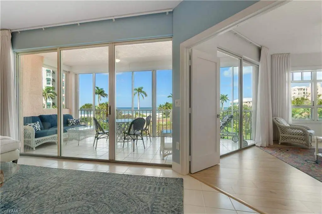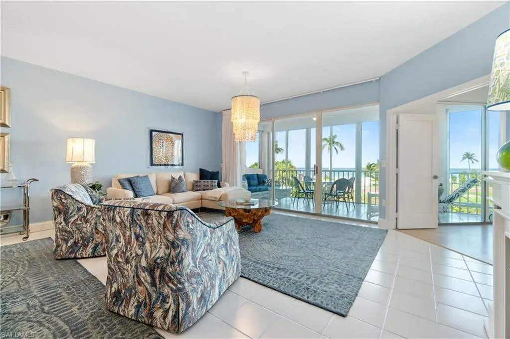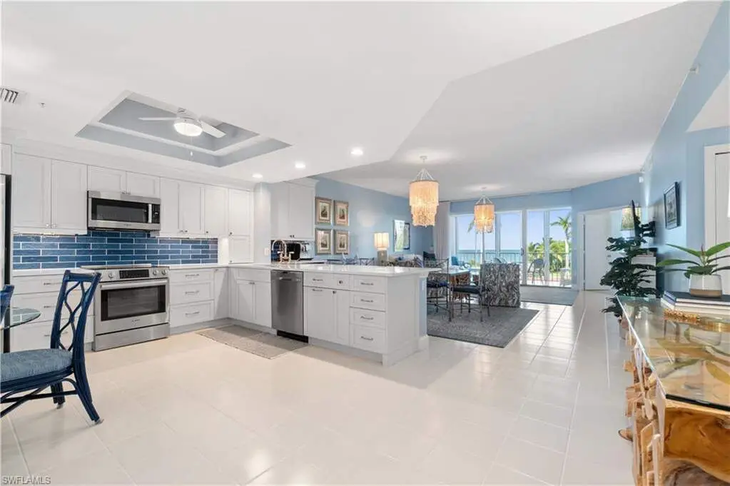 Beautifully renovated condo with spectacular Gulf views offered in coveted Barefoot Beach Club! Uniquely located in the only building on the bayside of Barefoot Beach with unobstructed Gulf views AND West-facing balconies for breathtaking sunsets over the Gulf of Mexico. This 2 bed/2 bath coastal delight features an open floor plan, electric storm shutters, and tile flooring. The screened-in lanai invites in the sound of the surf from the Gulf of Mexico and offers breathtaking sunsets from the comfort of your own home. The expansive chef's kitchen offers white quartz countertops, white cabinetry, ocean blue tiled backsplash, high-end Bosch appliances, breakfast bar and has an open concept for endless Gulf views. Perfect for entertaining, this condo offers dual dining areas & an adjacent built-in bar with wine cooler. The spacious primary bedroom has breathtaking views of the Gulf, private entry to the lanai, an office nook, and a beautifully updated bathroom with dual vanities, a large closet, and a frameless glass shower enclosure with multiple showerheads. Nearby to the NEW CLUBHOUSE with state-of-the-art fitness center & resort-style pool. Barefoot Beach residents enjoy 3 miles of beach, 2 pools/spas, manned/gated entry & on-site mgmt. OPTIONAL "Club at Barefoot" offers, tennis, 2 restaurants & beachside food/bev/chair service. Excellent Collier County location minutes to Mercato, Waterside & easy access to RSW Airport.