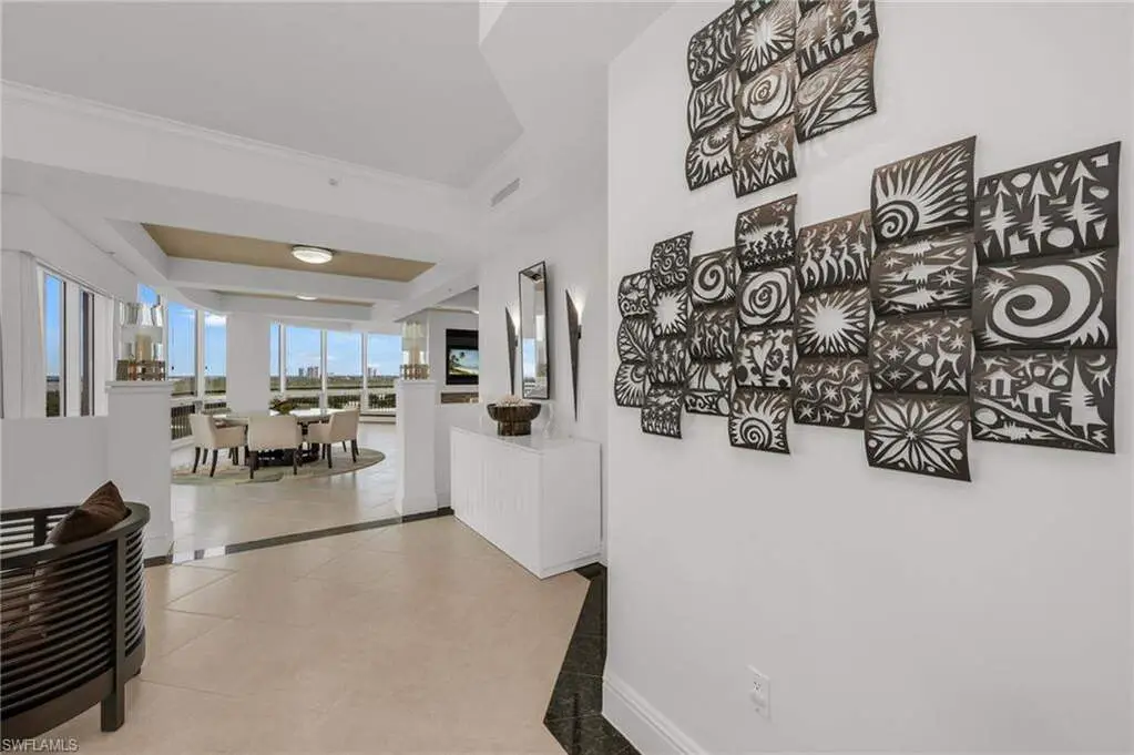 Azure is one of Bonita Bay's finest luxury high-rises situated on a premier site next to Estero Bay Park. This corner residence with 3 ensuite bathrooms, with 2 built-out walk in closets, plus den and has a beautifully appointed private elevator entry foyer. 270-degree floor to ceiling windows provide views of sunrise and sunsets over the gulf, bay, lake, and golf courses. This spacious floor plan with 10' ceilings and chef's kitchen with gas stove top, makes entertaining friends and family a pleasure. Superb finishes typical of this price range were selected and coordinated by the owner. PRIVATE ENCLOSED TWO CAR GARAGE. Azure offers updated communal areas, live-in manager, 2 guest suites, fitness & massage room, club & card room. saltwater pool, spa, two fire pits, covered screened social area with outside grilling. Bonita Bay has 5 golf courses, 18 court tennis, 18,000 sf. fitness, 8,000 sf. Lifestyle spa & salon, full-service marina, Gulf front beach park, 5 restaurants, 10 pickle ball courts, crochet, bocce ball, canoeing, Life Enrichment Center & 3 parks.