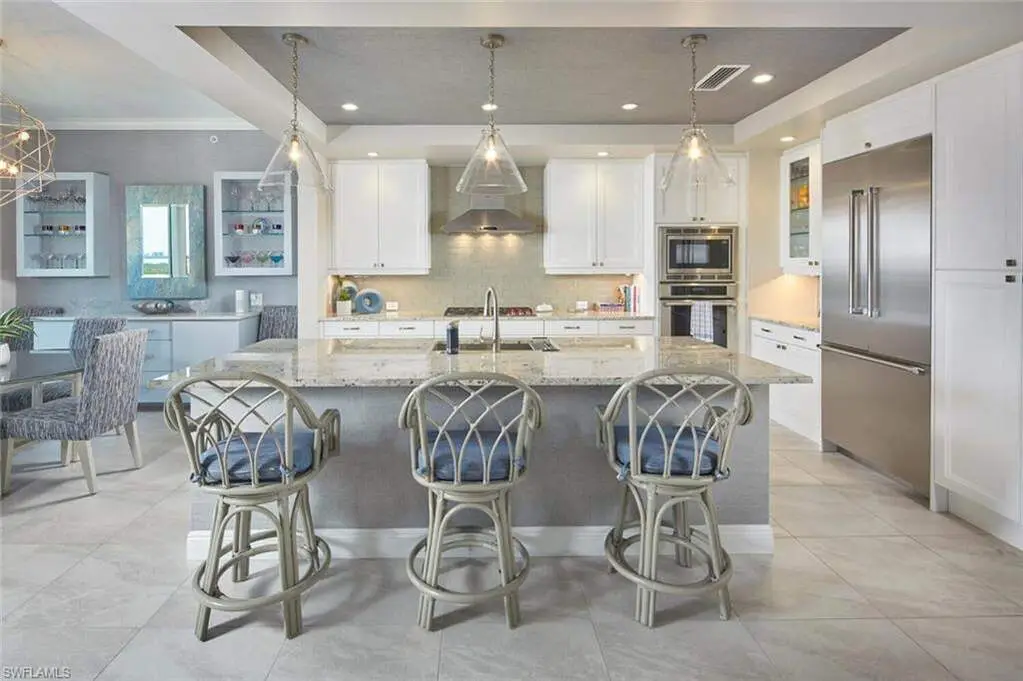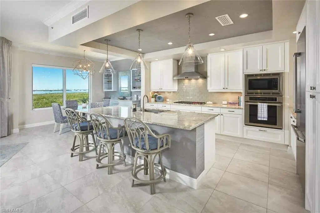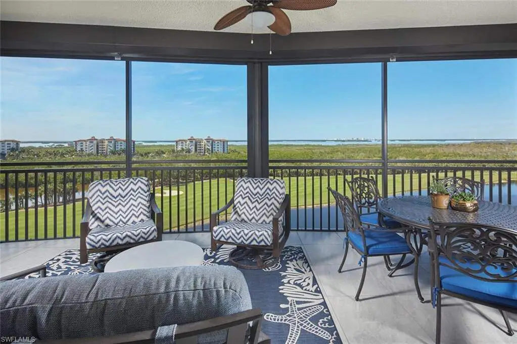 Sweeping views of Estero Bay & the Gulf - Luxury living at Altaira! Wake up to breathtaking panoramic views of Estero Bay and the Gulf of Mexico from this elegantly designed residence in Altaira at The Colony. A private elevator opens directly into over 3,300 square feet of luxurious living space, masterfully designed by Clive Daniel. The light, sophisticated palette complements the expansive great room layout-ideal for both entertaining and everyday relaxation. This residence features three spacious en suite bedrooms, a dedicated den or home office, and an elegant powder room. The open-concept living and dining areas flow seamlessly into the kitchen outfitted with an oversized island, glass tile back splash, custom beverage station, and premium Thermador appliances-including a gas cooktop. Additional highlights include automatic storm shutters and two assigned spaces in the enclosed garage. Altaira's exceptional amenities include a 24-hour front desk privacy officer, a lavish infinity-edge pool with pavilion and cabanas, three guest suites, a state-of-the-art fitness center, a 3,000 sq. ft. social room, a designated dog walk area, a fire pit, and a rooftop observatory. As part of The Colony at Pelican Landing, residents also enjoy exclusive access to private waterfront dining at The Bay Club, a 34-acre island beach park accessible by boat shuttle, canoe and kayak parks, pickle ball, a robust tennis program, sailing, bocce, and a variety of engaging social events. All this is located just minutes from upscale shopping, fine dining, sports venues, performing arts centers, world-class beaches, and Southwest Florida International Airport.