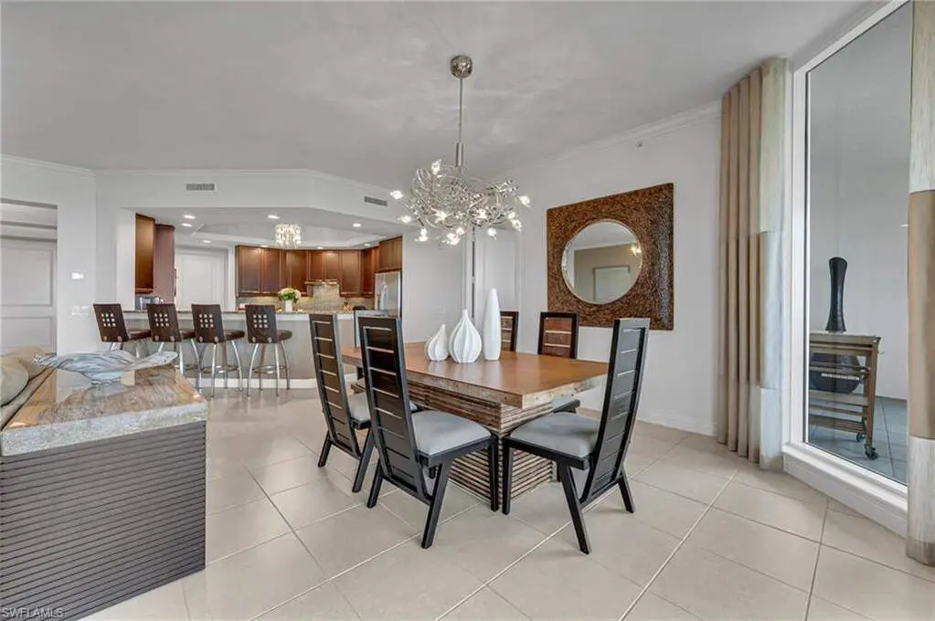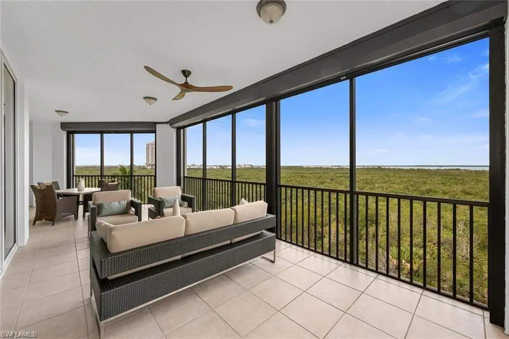 Enjoy the sunset views of a high-rise with the quiet privacy and convenience of a mid-rise. Offered furnished, this exquisite upper floor residence boasts panoramic views of lush nature preserves, sparkling Estero Bay waters, and the barrier island known as Lover's Key. The building's open-air atrium entry provides a warm and welcoming touch, blending indoor sophistication with the serenity of lush greenery, soft natural light, and the gentle breeze wafting in from outside.Meticulously updated with designer lighting, fans, elegant window treatments and modern furnishings, this serene property offers an elegant yet relaxed atmosphere. The chef's kitchen features luxurious wood cabinets, stylish backsplash, breakfast bar, center island, and premium appliances such as a Sub-Zero wine cooler. Ideal for entertaining or just relaxing with family, the inviting living and dining areas open to the spacious wrap around lanai with floor to ceiling glass doors and electric hurricane shutters. A restful primary suite offers a spa-like bath, an enormous custom closet, and direct access to outdoor living. Enjoy unparalleled community amenities including a private beach pavilion, bocce, private restaurant, tennis, fitness center, and a tropical resort-style pool and spa. Castella offers a quiet tropical setting on 11 acres with resort level amenities including exclusive access to The Bay Club offering unparalleled luxury while dining and enjoying the beaurtiy of Estero Bay and beyond. The Colony at Pelican Landing is just moments away from Bonita Beach, Coconut Point Mall, and SWFL International Airport.