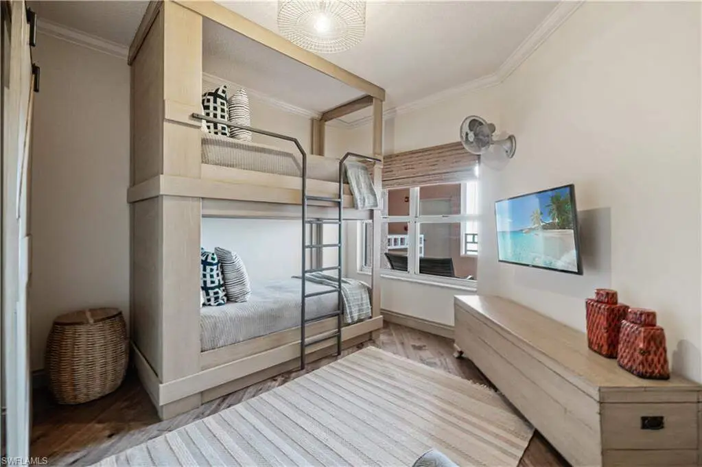 RENOVATED & COASTAL CONTEMPORARY DIRECT BEACHFRONT END-UNIT in North Naples' coveted Barefoot Beach Club! Perfectly positioned on the desirable south end of the building, this residence enjoys unobstructed WEST and SOUTH views that stretch all the way to Vanderbilt Beach. Enjoy pristine white sands and sparkling turquoise water of the Gulf as your everyday backdrop. This 3 bed/3 bath coastal retreat offers an open floor plan with over 2,000 sq ft under air, hurricane impact sliders, electric storm shutters, and elegant wood-look tile flooring. Rare end-unit windows bathe the interior in extraordinary natural light. Step outside to your expansive wraparound screened lanai with panoramic Gulf views and breathtaking sunsets. The chef's kitchen boasts a wood-paneled ceiling, custom cabinetry with glass-front details, granite countertops, and an oversized island with range hood. The primary suite is a private sanctuary with Gulf views, lanai access, and a spa-like bath with dual vanities and a large glass-enclosed shower with rainfall showerhead. Nearby to the BRAND-NEW CLUBHOUSE with state-of-the-art fitness center & resort-style pool. Barefoot Beach residents enjoy 3 miles of beach, 2 pools/spas, manned/gated entry & on-site mgmt. OPTIONAL "Club at Barefoot" offers tennis, 2 restaurants & beachside food/bev/chair service. Excellent Collier County location minutes to Mercato, Waterside & easy access to RSW Airport.