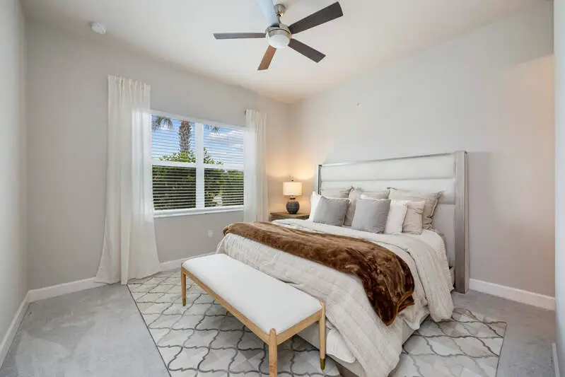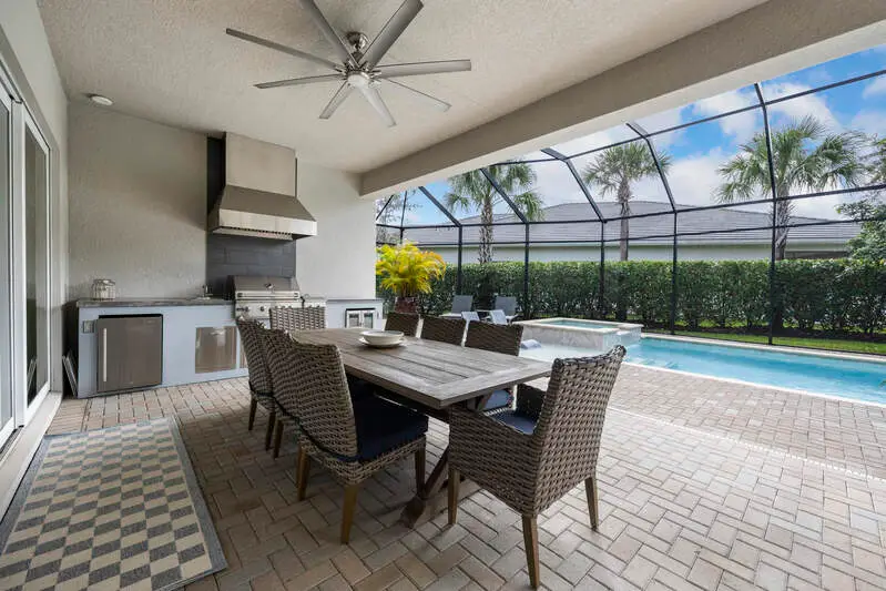 Built in 2020, this Carolina model is being offered turnkey furnished and showcases extensive upgrades throughout. Situated on a corner lot with a spacious side yard, this home is ideally located - close enough to walk to the clubhouse, yet far enough away to avoid the sound of the pickleball courts. Located in Flood Zone X, No Flood Insurance required. Features include Impact Doors and Windows, a 3-car garage with epoxy flooring, and a heated pool and spa. The outdoor kitchen is equipped with a grill, vented hood, wine cooler, and refrigerator, creating the perfect space for entertaining. Inside, the gourmet kitchen offers a gas cooktop, built-in microwave, quartz countertops, large pantry, and under/over cabinet lighting. Additional highlights include an upgraded washer and dryer, oversized laundry room with abundant storage, and custom closets throughout. Elegant finishes include a neutral color palette, crown molding, upgraded front doors, designer chandeliers, window treatments, blinds on every window, and shiplap/woodwork in the living, dining, and master bedroom. The formal dining room and separate breakfast area with coffee bar provide versatile dining options . The primary suite features a large soaking tub, separate custom glass shower, upgraded flooring, and custom closet systems. A custom living room wall unit, two smart TVs, and Bose sound bar are included. Exterior landscaping is enhanced with up-lighting under palms and trees, front and back. Valencia Bonita is a 55+ community with resort-style amenities, including a 45,000 sq. ft. clubhouse, pools, pickleball, tennis, fitness center, spa, dining, and more.