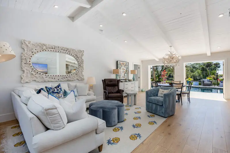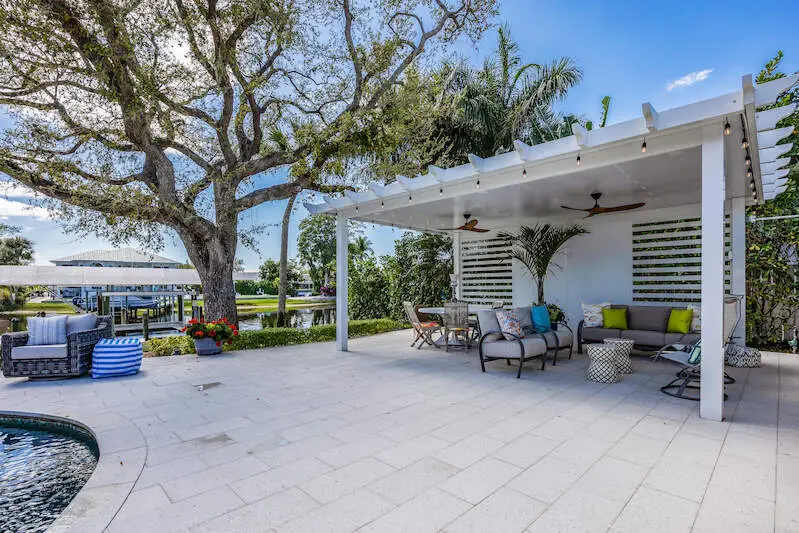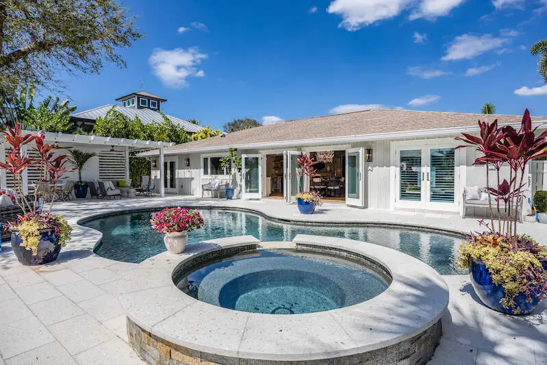 NEW metal roof was just installed in May! Discover this truly exceptional waterfront oasis perched on the Imperial River in Bonita Springs! This stunning 3-bedroom, 3-bathroom home offers 2,239 square feet of thoughtfully designed living space on a sprawling 0.46-acre lot, providing Gulf access for boating enthusiasts. Step inside to find a spacious and airy layout featuring vaulted ceilings, wide-plank European oak flooring, and French doors that fill the home with natural light. The French Country-inspired kitchen boasts high-end appliances, custom solid maple cabinetry, Cambria quartz countertops, a butcher block island, floating shelving, and a luxurious butler's pantry. The open-concept living and dining area showcases vaulted ceilings, a custom-built feature wall with an electric fireplace, and stylish lighting accents. The primary suite is a true retreat, featuring basketweave Carrara marble floors, walk-in shower, and double vanity. Two spacious walk-in closets with custom built-ins by Inspired Closets finish the space with plenty of organization. The guest bedrooms are designed for comfort and privacy, each with designed closets and beautifully appointed bathrooms. The floor plan has been thoughtfully reimagined to include a functional laundry room and a cozy office or reading nook. Step outside and immerse yourself in serene surroundings, featuring a breathtaking pool and spa, a shaded cabana, a cozy fire pit, elegant travertine pavers, and multiple seating and lounging areas-all with picturesque views of the Imperial River. Enjoy the convenience of your own private dock, complete with a new 14,000-lb covered boat lift and a boat ramp for easy access to the Gulf. Fresh water and electricity are also available on the dock for added convenience. Nestled on a peaceful cul-de-sac within the desirable Bonita Farms community, this home offers both tranquility and accessibility. It's just minutes from world-class beaches, shopping, dining, and everything Southwest Florida has to offer. Whether you're seeking adventure on the water or a serene retreat, this exceptional property delivers the ultimate Florida lifestyle. Don't miss this rare opportunity to own a piece of paradise on the Imperial River!