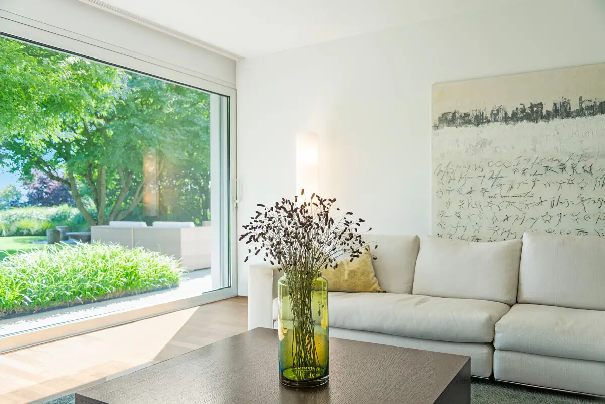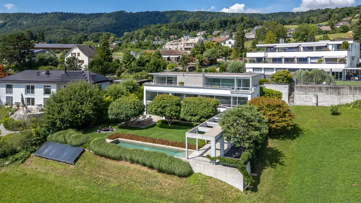 This out-of-the-ordinary property in Boppelsen has undeniable impact with its seamless blend of timeless architecture, a well-conceived interior arrangement and refined elegance. Designed by architect Fausto Form, the detached house features high ceilings, open-plan spaces and an adaptable layout. The integral Bulthaup kitchen connects directly to the bright living and dining area with fireplace and opens across the full width to the beautifully landscaped garden with pool by means of full-height, sliding patio doors. The master suite with sauna, steam bath, fitness zone and generous dressing area provides an unparalleled degree of comfort. A separate studio with kitchenette can be converted into a self-contained flat if required. The choice of finishes is particularly attractive, with warm wood floors and natural stone reflecting the consistently high quality inside and out. The garden, designed by Atelier Enea, is a highlight in itself – with Japanese maple trees, bamboo and blooming hydrangeas forming an elegantly refined outdoor setting. The property - Approx. 371m² of living area - Superior quality of finish - Fireplace - Bulthaup designer-kitchen - Above-average room heights - Wellness zone with spa and steam room - Fabulous, landscaped garden including outdoor pool - Captivating views - Quiet setting with sunny aspect - 2 garage parking spaces fitted with an EV charging point