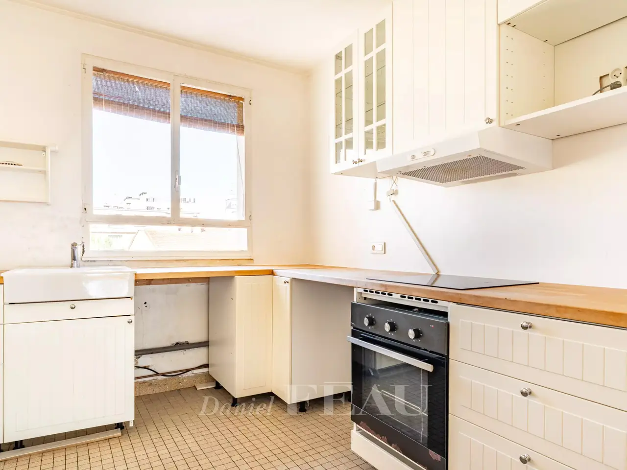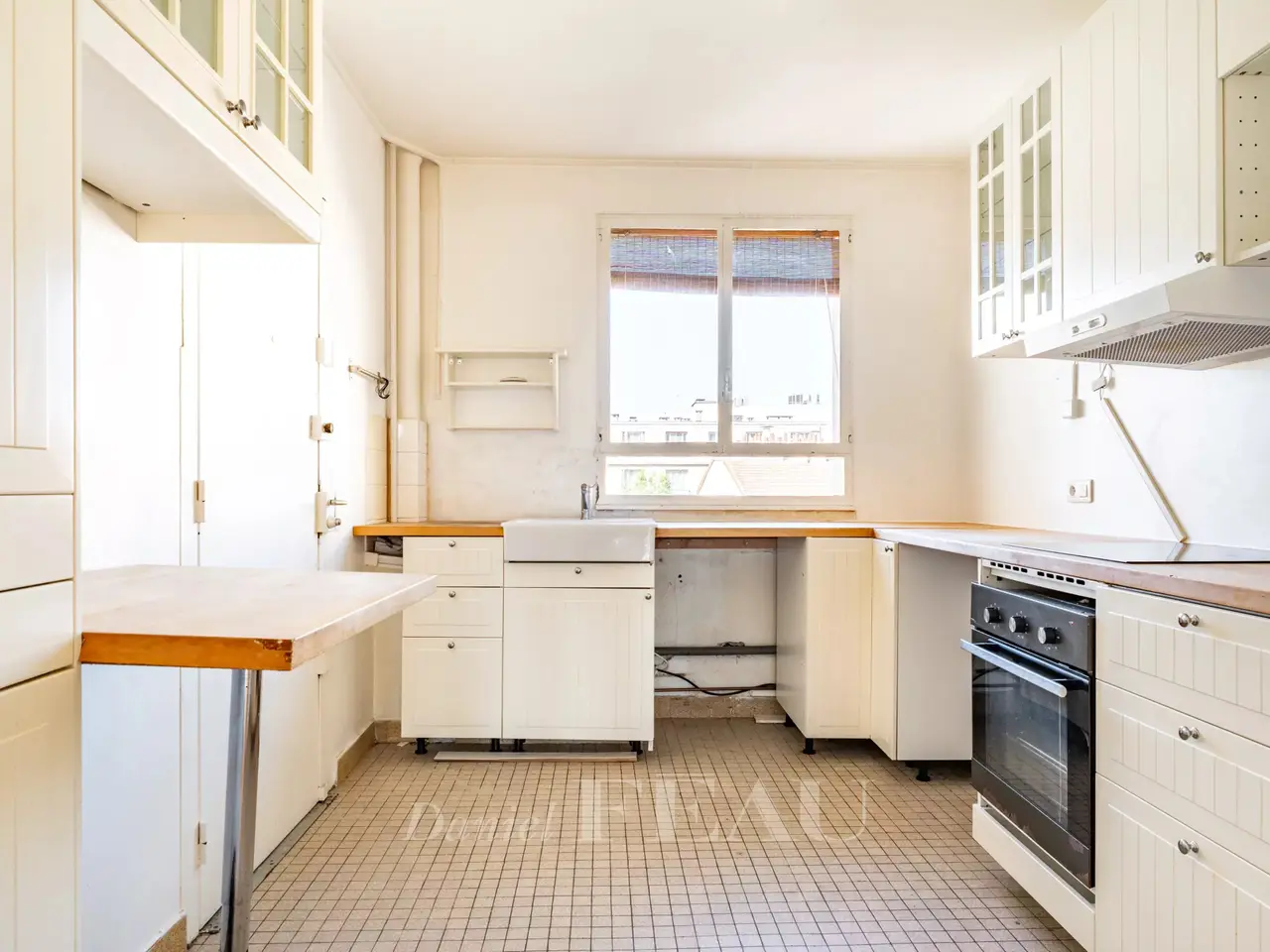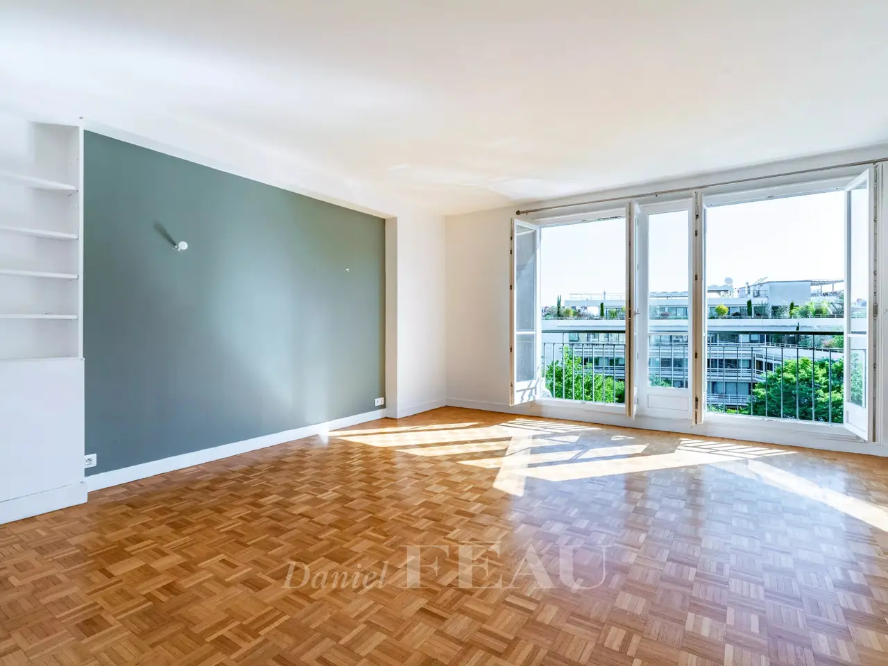 This dual-aspect apartment offering 97.80 sqm of living space as defined by the Carrez Law is on the 4th floor of a luxurious mid 20th century building located in a peaceful street near Porte de Saint Cloud. East and west facing, it includes a spacious living/reception room enjoying open views over leafy greenery, a kitchen, three bedrooms (two overlooking a garden), a bathroom and a separate wc. Fitted storage space. With a cellar. A courtyard lock-up garage may be acquired for a further 30000€.