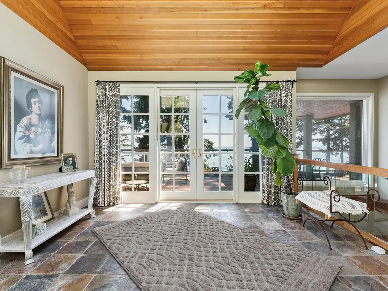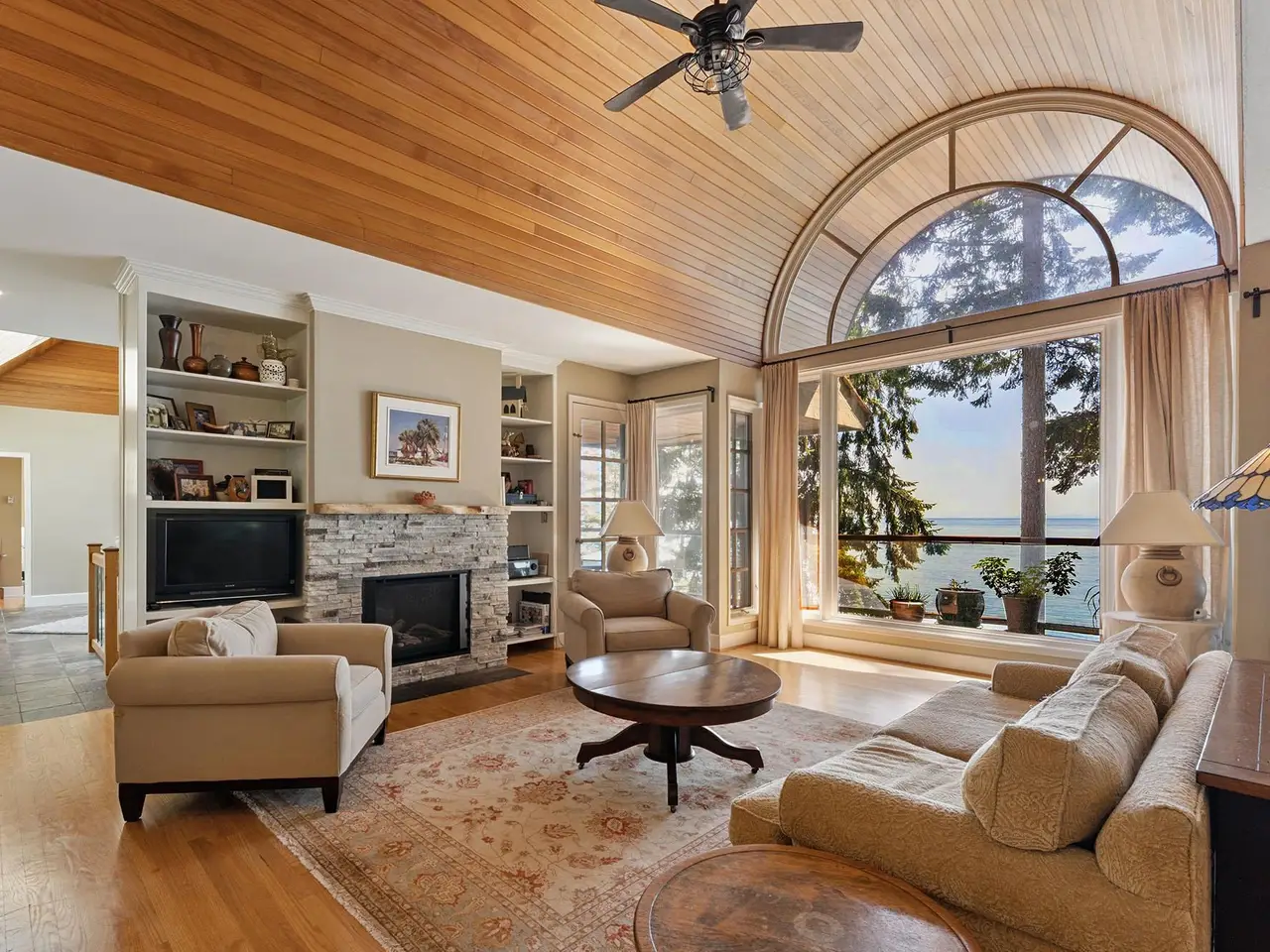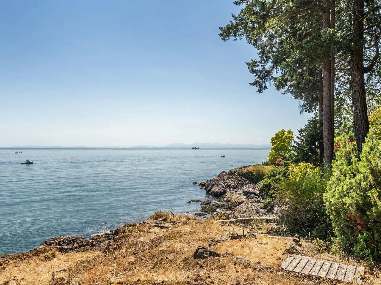 Fairweather Point – an enclave of architectural WATERFRONT homes sits on the South Shore of Bowen with views from Vancouver to the Gulf Islands. The coast here is alive with wildlife year round including seasonal visits from Humpbacks & Orcas. With a gently sloping backyard and a path of stone steps down to the water, you can go swimming any time. The spectacular views start at the front door and are showcased in almost every room. A dramatic 15’ barrel ceiling in the living room is the focal point of the open plan living/dining/kitchen. All rooms on the main floor have access to a 600+ sf south-facing deck, including the primary suite. Downstairs is a huge family room with French doors to the backyard, plus 3 more bedrooms. Excellent value for low bank WATERFRONT on Bowen Island.
