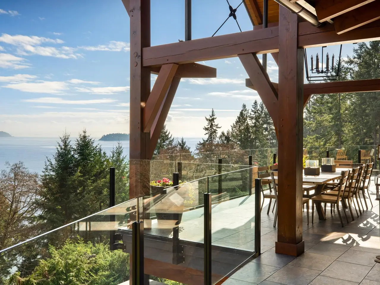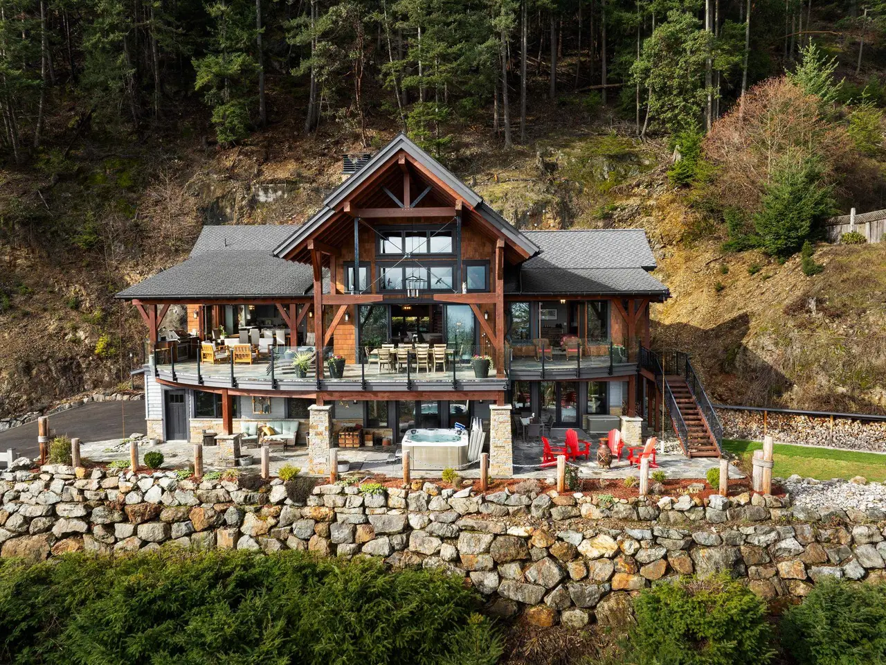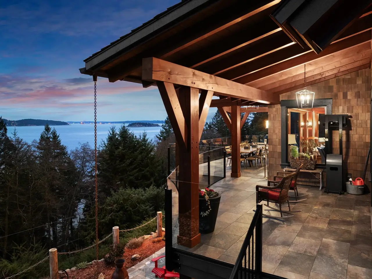This stunning ocean view property featuring a masterpiece of engineering, custom built, Canadian Timberframe Ltd home is ready to welcome a new family. The expansive timber peaks & over 1100 sq.ft. covered entertainment deck sets it apart. The open plan main floor boasts timberframe ceilings soaring over 24'. Custom Loewen Douglas Fir interior/metal exterior windows & doors, engineered Hickory flooring & exclusive lighting compliment the space. Chefs will covet the gourmet kitchen with state of the art appliances & expansive Quartz countertops. Main level primary bedroom, ensuite & walk in closet showcase the cathedral timberframe ceilings. A special retreat w/floor to ceiling fireplaces & private decks overlooking ocean, mountain and coastal views. Vancouver within easy reach.