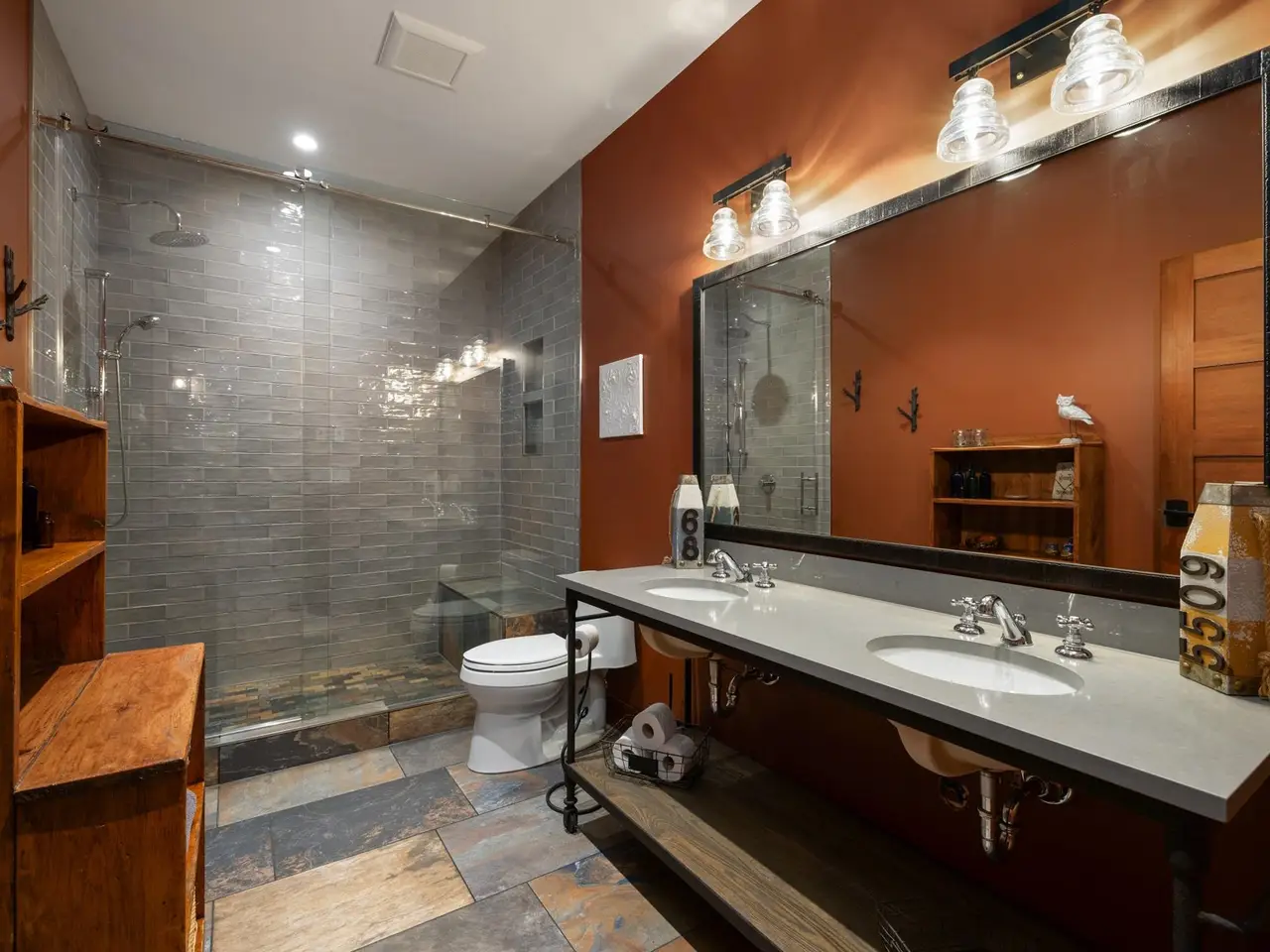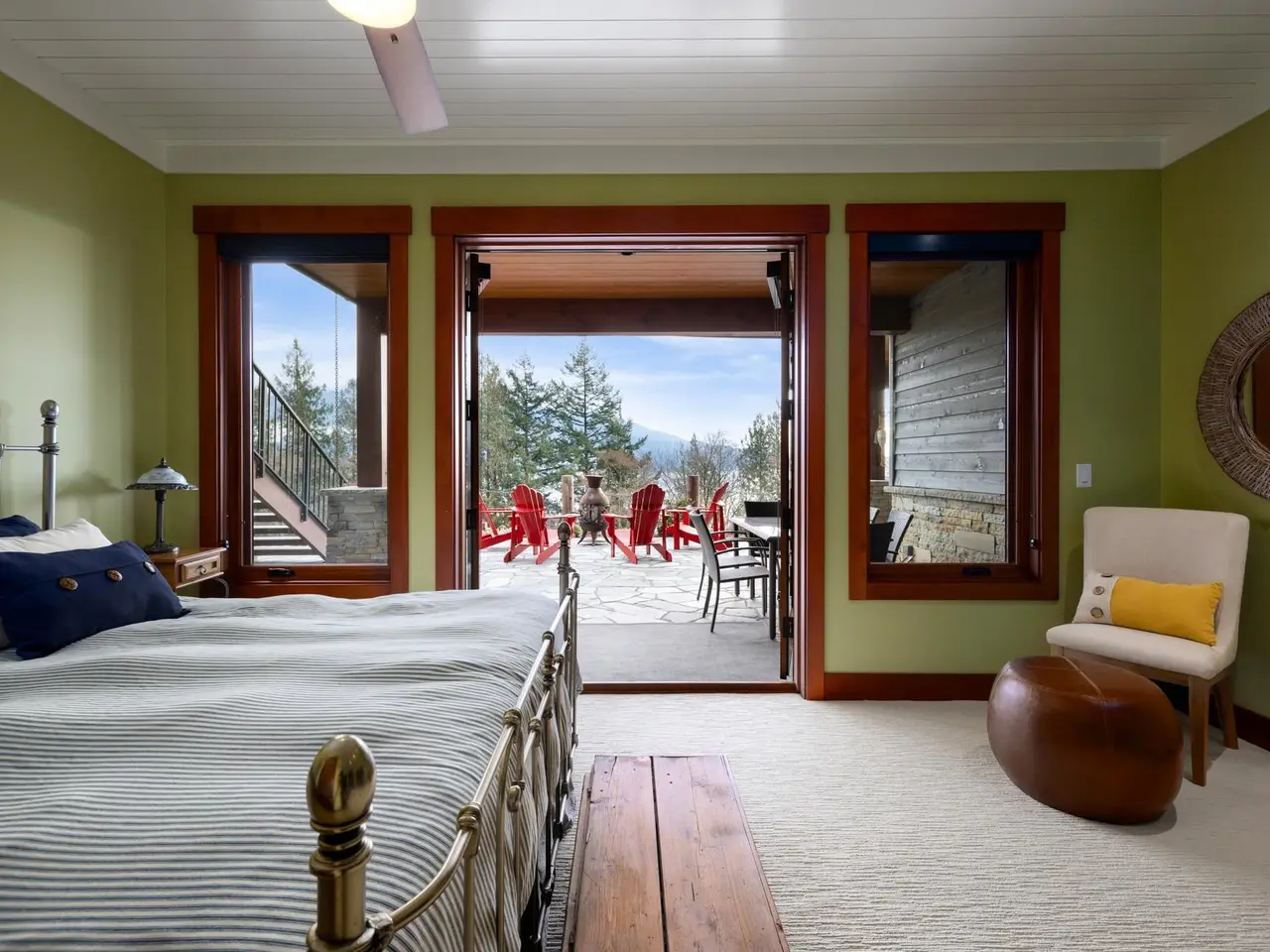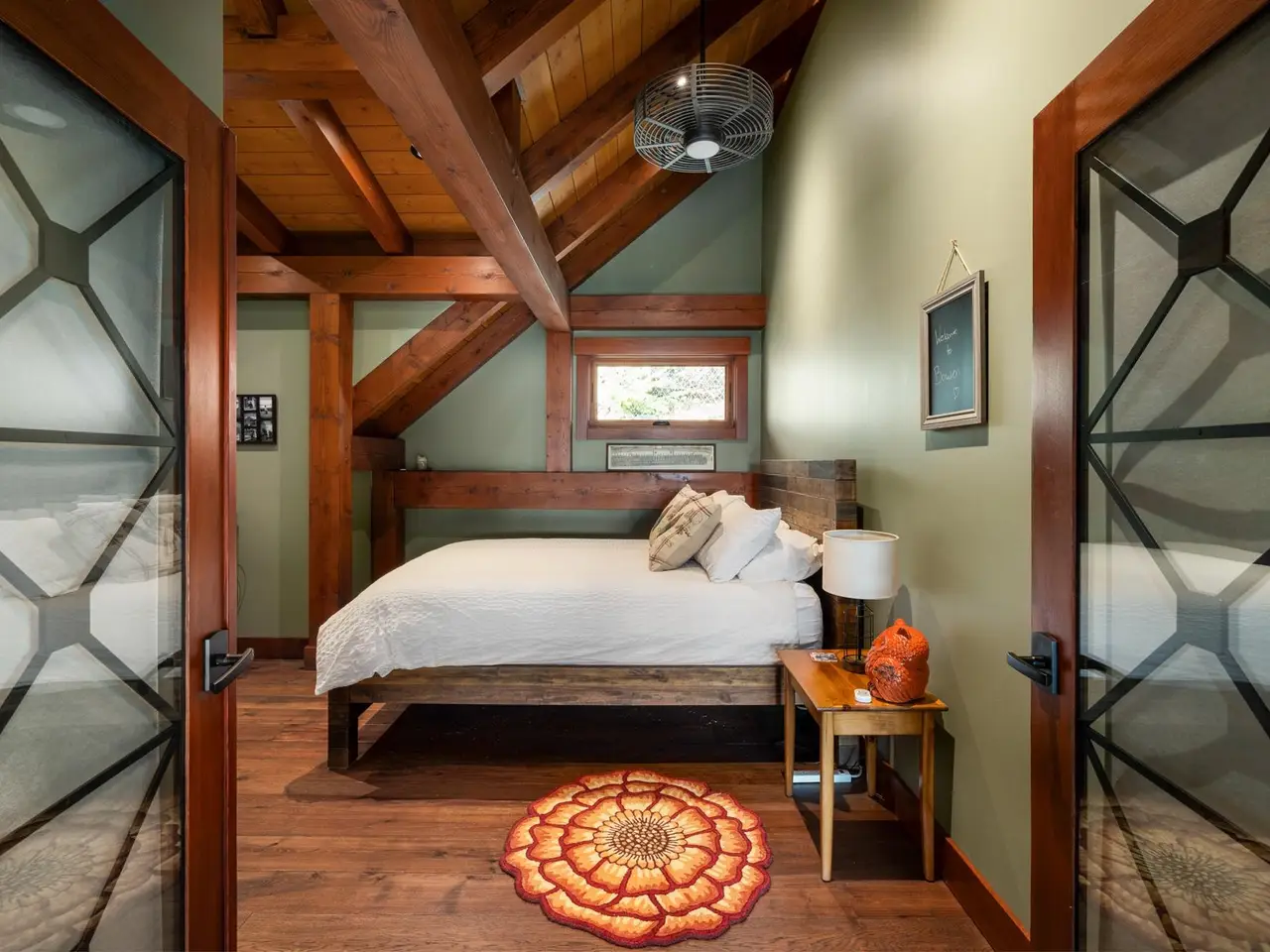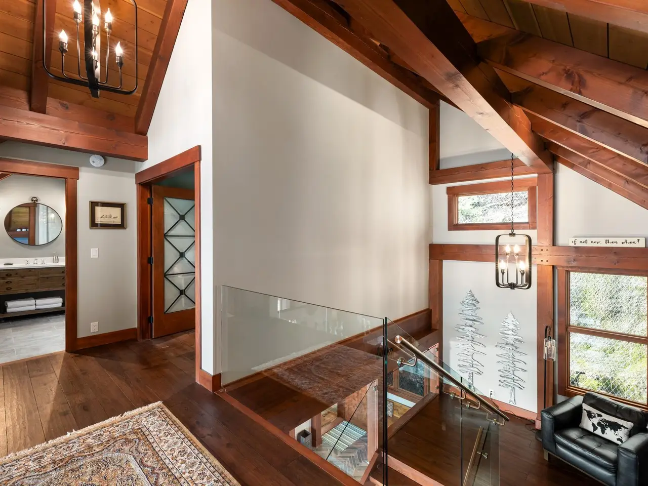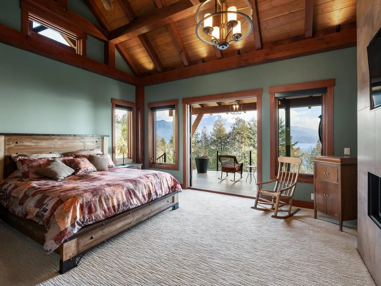 • Main level primary bedroom with cathedral timberframe ceilings