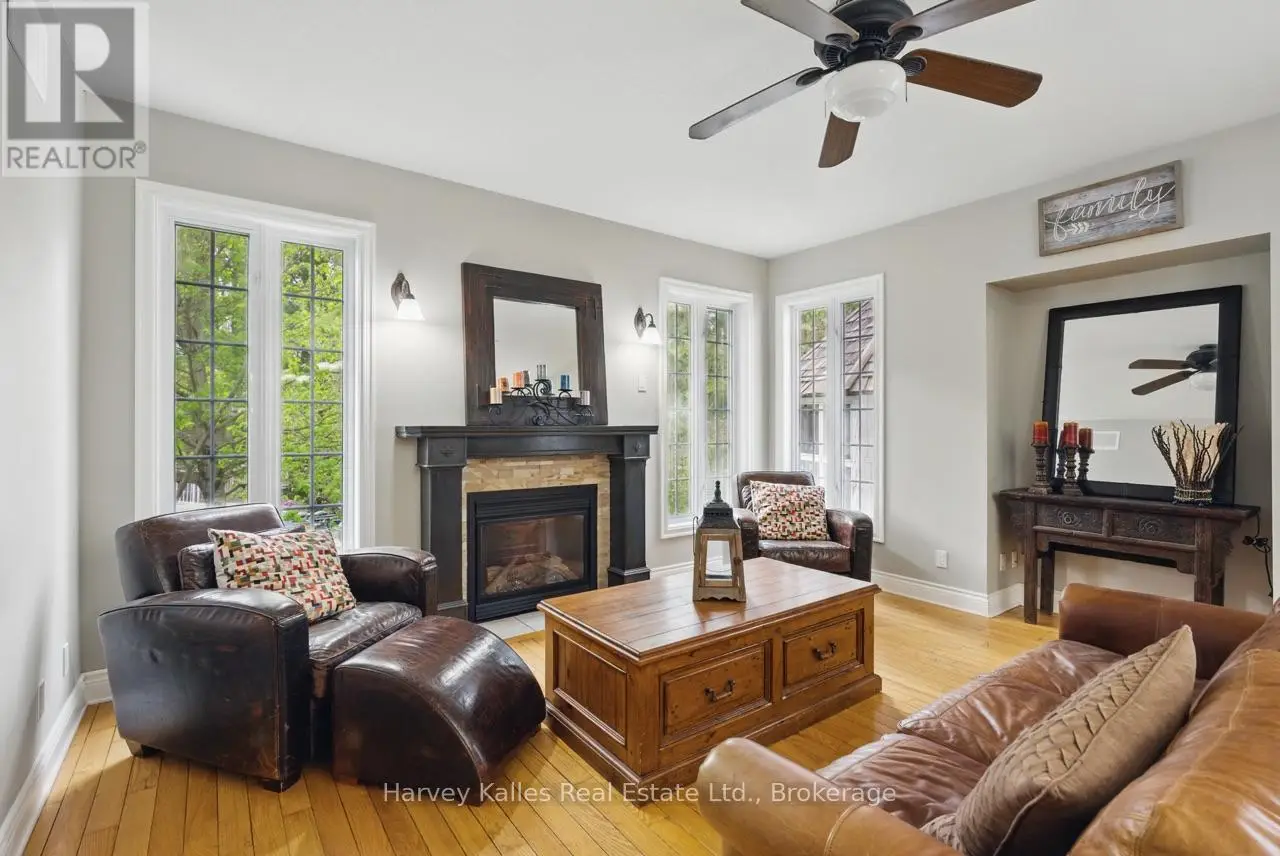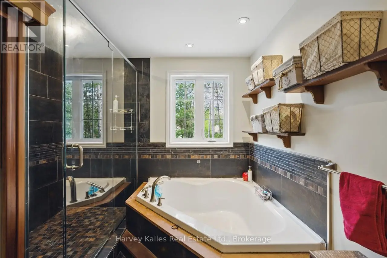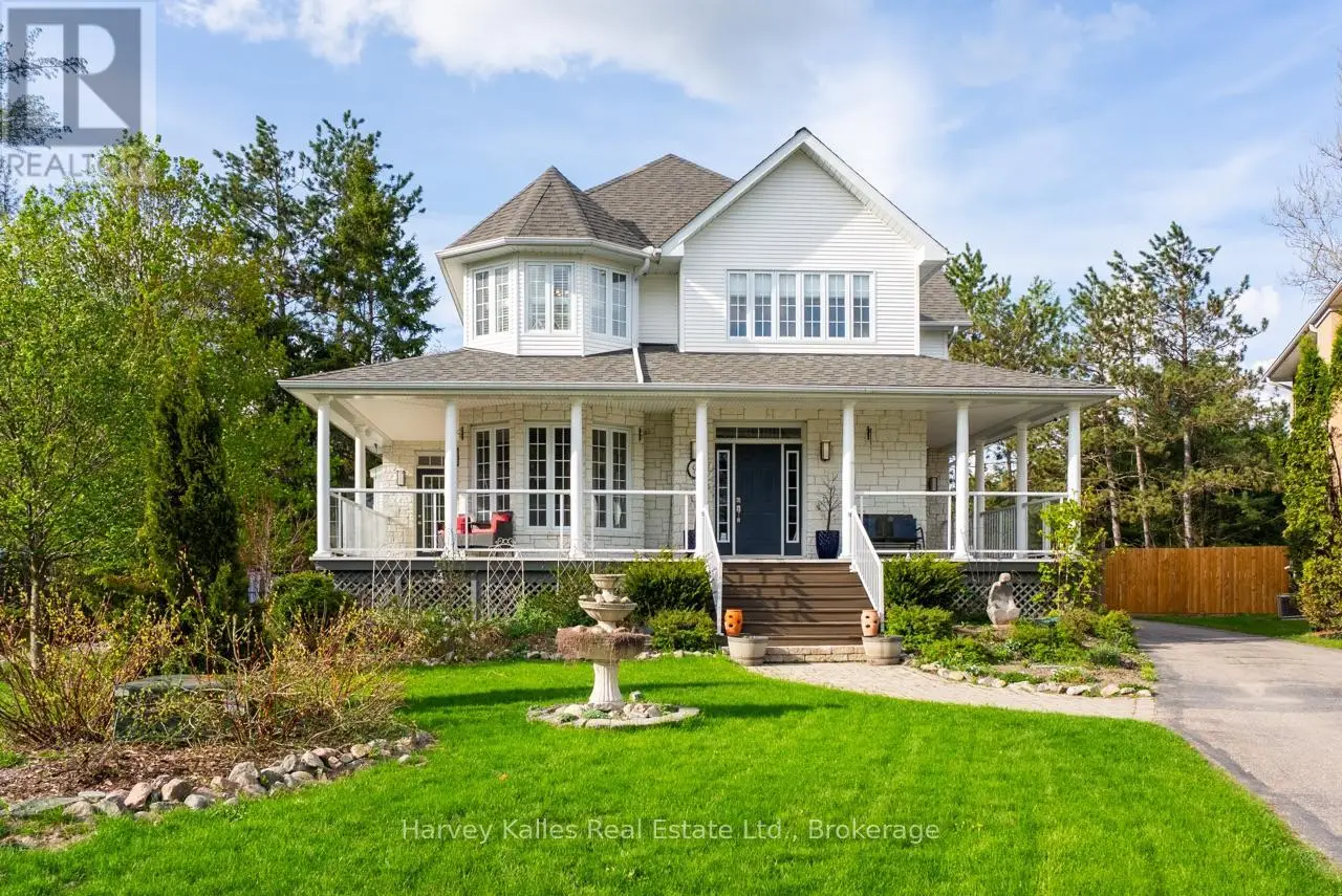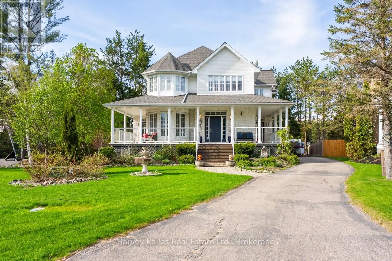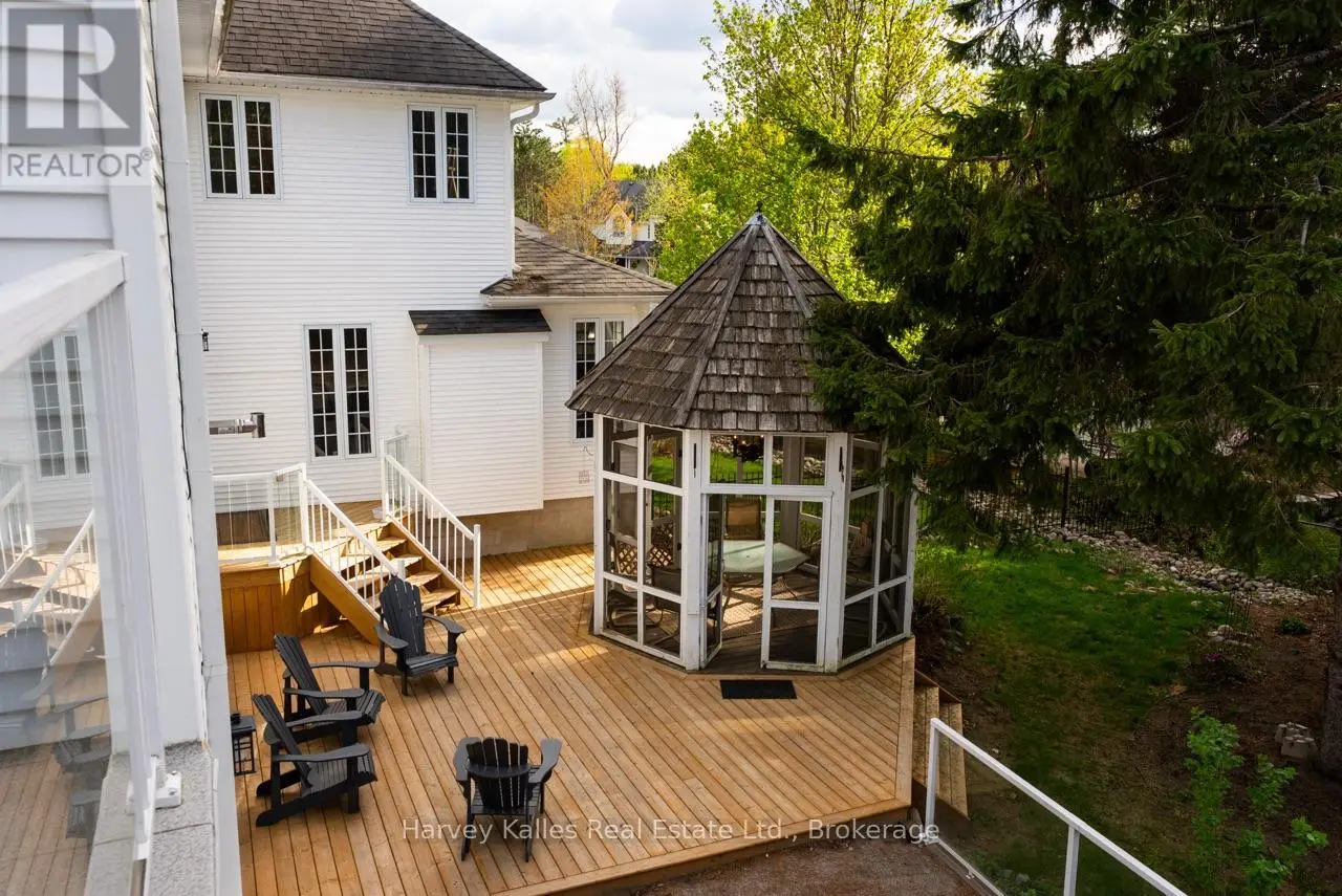 Extraordinary, postcard perfect curb appeal at this sophisticated and stunning 4-6 bedroom, 5 bathroom, 2 storey home, serving up exciting and sleek architectural details, with an invigorating layout, comfortable for just a couple, yet with a family-friendly spirit. Over 5,100 sq. ft. of beautifully flowing living space. Exquisitely positioned, in-town, on full municipal services, within walking distance of amenities, yet exclusively nestled on a quiet and secluded true 'cul-de-sac'. Melane Court is unquestionably one of Bracebridge's finest addresses. Built in 2002 and originally owned by the builder, the home stands proudly with a beautiful wrap-around covered southwest facing porch, with a cleverly tucked away attached 4-car garage along the side with paved drive, ample parking, on a large 1/2 acre lot with fully fenced garden oasis back yard. Inside, a dramatic 2-storey foyer beckons with its curved staircase. The main floor features a solar southerly office/den, hardwood floors, formal living room, dining room, eat-in kitchen, and separate family room. Plus a handy mudroom, powder room, and MF laundry room. Upper level presents 3 sizeable bedrooms plus a loft, one with an ensuite privilege, one fully ensuited, plus the 1,100+ sq. ft. primary wing featuring a private den/T.V. room, walk-in closet, ensuite with soaker tub, sauna, studio, and walk-out to deck. Finished lower level is a flexible space with access from the garage, 3 pc. bath, ample storage, bedroom, gymnasium, and rec. room. Potential to create a nanny's suite with the basement. 10 kW back-up generator, central air, forced air gas heat, multiple fireplaces. Newly resurfaced back deck and large patio area with custom greenhouse, and separate gazebo enliven outdoor living. An executive family home in a neighborhood where very, very rarely is anything offered for sale. This is a truly exemplary offering exuding so much warmth and charm, with features and facets everyone desires. (id:16999)
