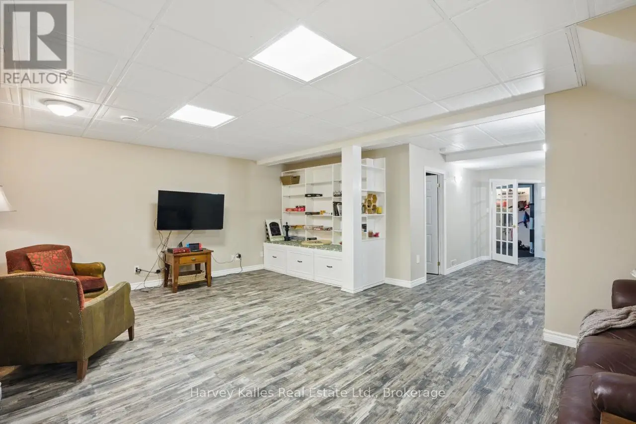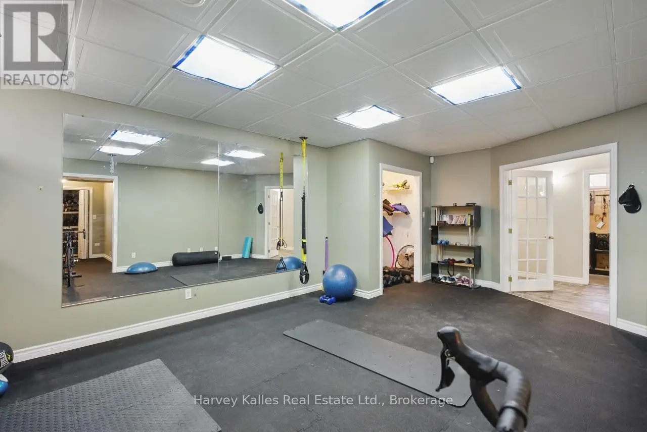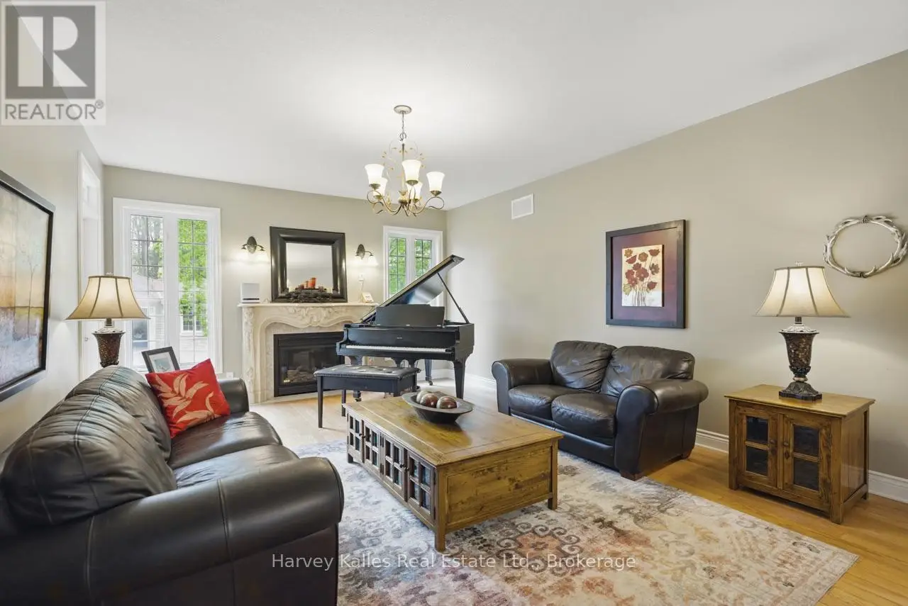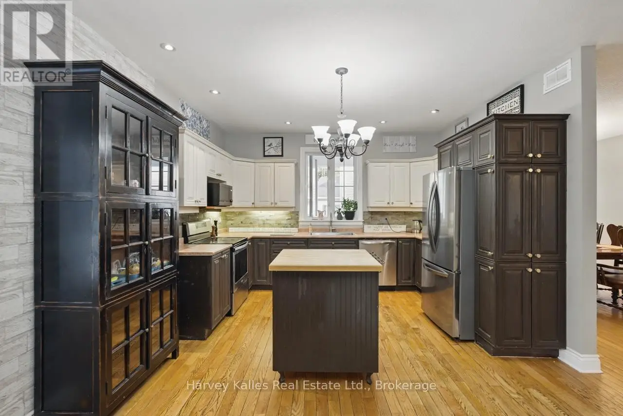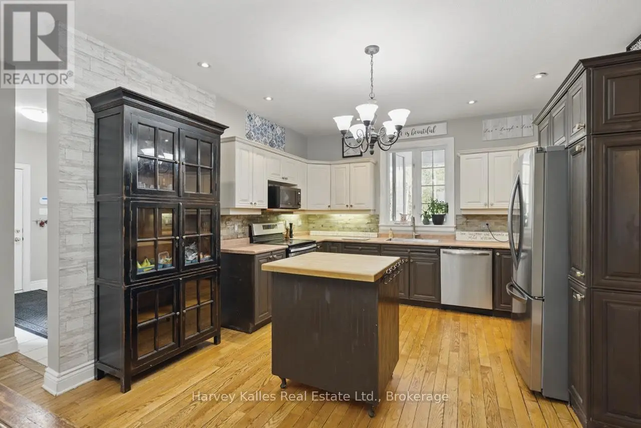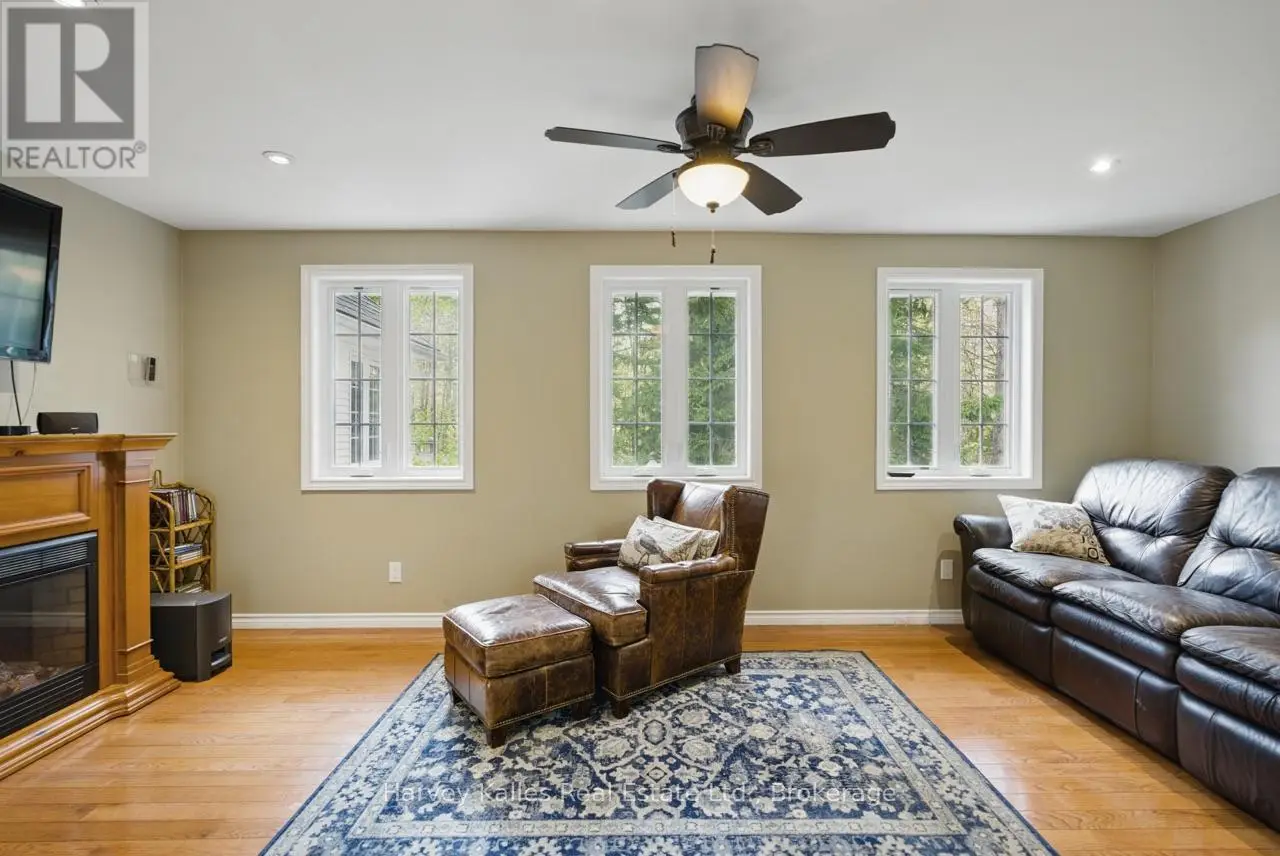 Extraordinary, postcard perfect curb appeal at this sophisticated and stunning 4-6 bedroom, 5 bathroom, 2 storey home, serving up exciting and sleek architectural details, with an invigorating layout, comfortable for just a couple, yet with a family-friendly spirit. Over 5,100 sq. ft. of beautifully flowing living space. Exquisitely positioned, in-town, on full municipal services, within walking distance of amenities, yet exclusively nestled on a quiet and secluded true 'cul-de-sac'. Melane Court is unquestionably one of Bracebridge's finest addresses. Built in 2002 and originally owned by the builder, the home stands proudly with a beautiful wrap-around covered southwest facing porch, with a cleverly tucked away attached 4-car garage along the side with paved drive, ample parking, on a large 1/2 acre lot with fully fenced garden oasis back yard. Inside, a dramatic 2-storey foyer beckons with its curved staircase. The main floor features a solar southerly office/den, hardwood floors, formal living room, dining room, eat-in kitchen, and separate family room. Plus a handy mudroom, powder room, and MF laundry room. Upper level presents 3 sizeable bedrooms plus a loft, one with an ensuite privilege, one fully ensuited, plus the 1,100+ sq. ft. primary wing featuring a private den/T.V. room, walk-in closet, ensuite with soaker tub, sauna, studio, and walk-out to deck. Finished lower level is a flexible space with access from the garage, 3 pc. bath, ample storage, bedroom, gymnasium, and rec. room. Potential to create a nanny's suite with the basement. 10 kW back-up generator, central air, forced air gas heat, multiple fireplaces. Newly resurfaced back deck and large patio area with custom greenhouse, and separate gazebo enliven outdoor living. An executive family home in a neighborhood where very, very rarely is anything offered for sale. This is a truly exemplary offering exuding so much warmth and charm, with features and facets everyone desires. (id:16999)