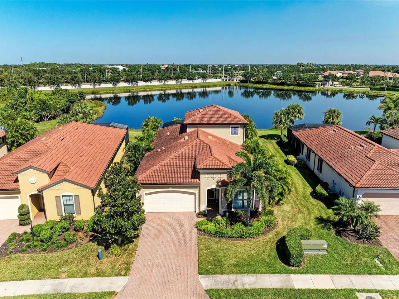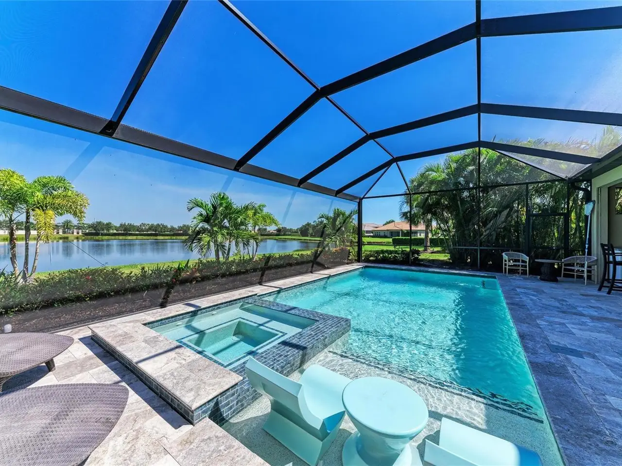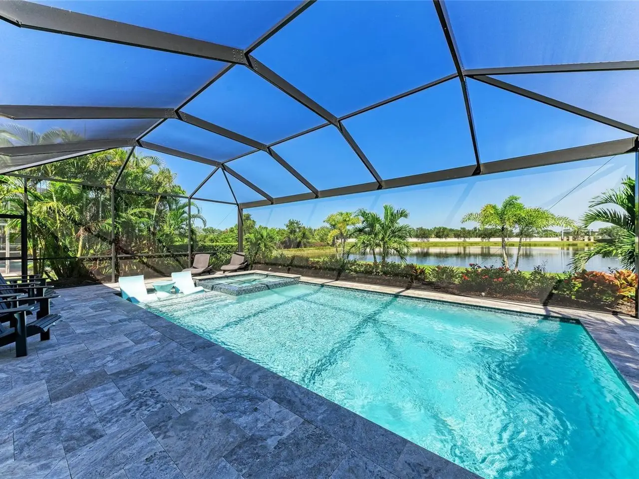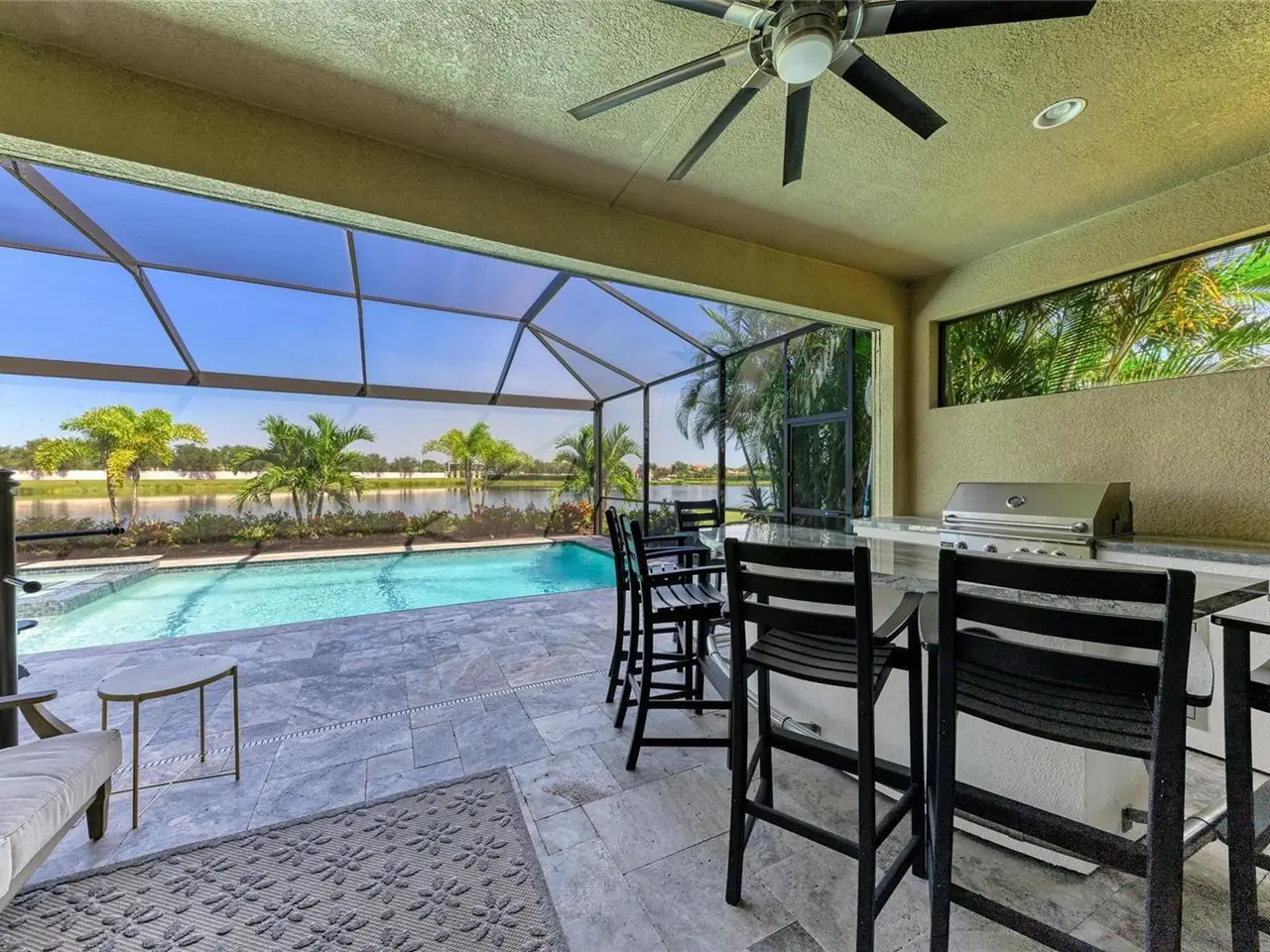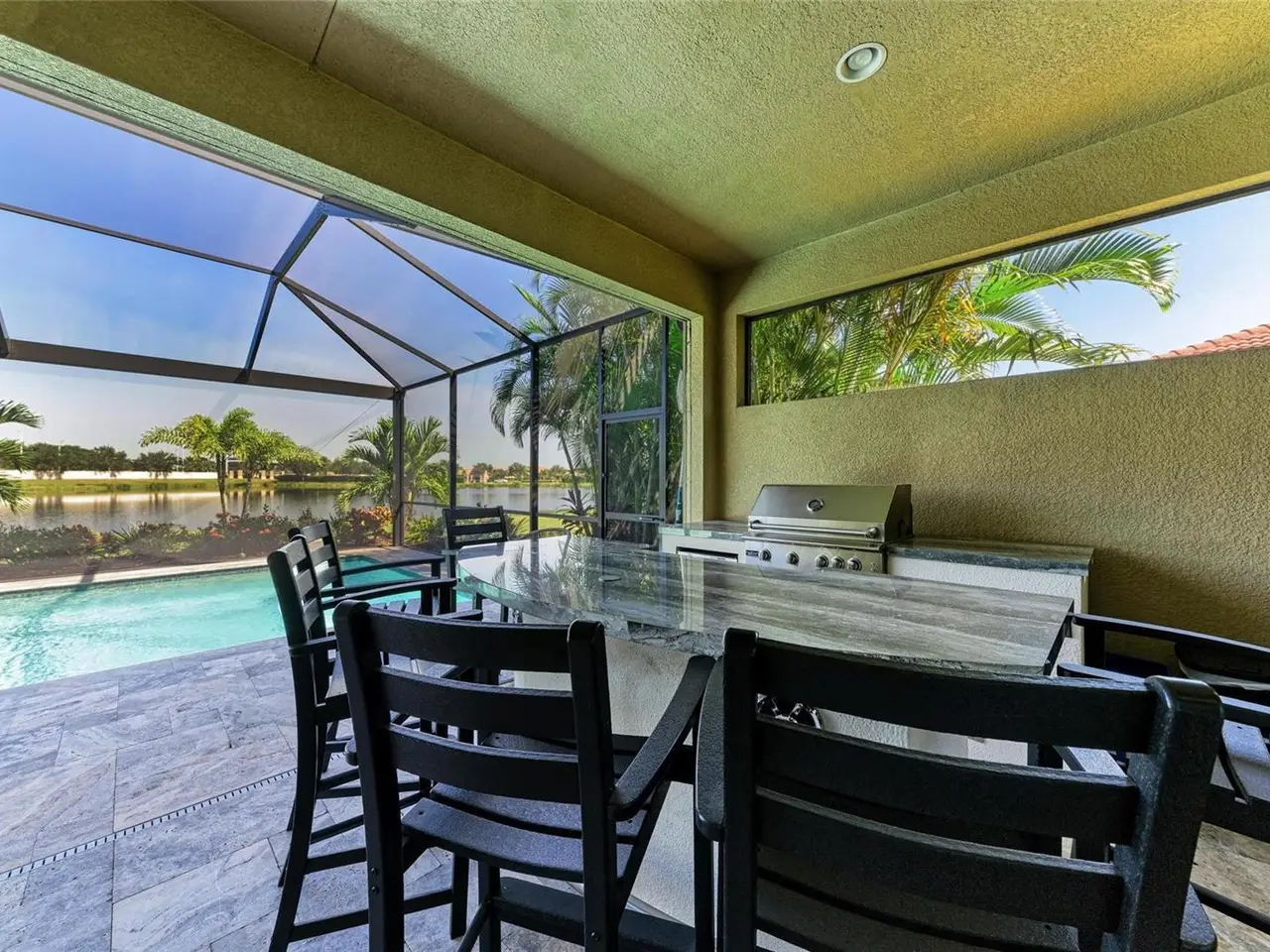 Discover this beautifully upgraded 4 bedroom, 4.5 bathroom home with tranquil water views in the gated Rosedale Golf & Country Club, designed for both luxury living and effortless entertaining. Featuring tile flooring throughout, crown molding, plantation shutters, custom draperies, and designer light fixtures, every detail has been thoughtfully curated to create a space that is sophisticated, welcoming, and move-in ready. The chef’s kitchen is a showpiece, offering granite counters and backsplash, custom cabinetry, abundant prep space, high-end KitchenAid appliances, a 5-burner gas cooktop, walk-in pantry, and a large island with breakfast bar and seating for family and friends. A butler’s pantry connects the kitchen to the formal dining room, making entertaining effortless. The kitchen opens to the great room, where sliding doors lead to the amazing outdoor living area. The backyard is an entertainer’s dream. Host gatherings or relax outdoors with a spacious entertaining area, heated saltwater pool and spa with sun shelf, travertine pavers, and lush, upgraded landscaping. The outdoor kitchen features two small beverage/wine refrigerators and a large island with seating, creating the perfect space for grilling, poolside dining, or enjoying quiet moments while taking in the beautiful water views. The owner’s suite is a luxurious retreat, offering picturesque water views, a large walk-in closet, dual sinks with granite counters, and a walk-in frameless glass shower. Two additional first-level bedrooms with ensuite bathrooms offer privacy and comfort. Upstairs, a generous loft bedroom suite with full bath and walk-in closet is ideal for overnight guests, extended stays, or a versatile media/game space. Additional upgrades include impact-resistant windows and sliding glass doors, tankless gas water heater, gutters, and designer touches throughout, ensuring both beauty and functionality. Living in Rosedale Golf & Country Club offers a resort-style lifestyle. Low HOA fees cover all landscaping and irrigation maintenance, high-speed fiber internet and cable, two manned 24/7 guard gates, plus two dog parks for residents. Social membership at the club provides access to tennis, a 22,000 sq ft clubhouse, fitness center, studio classes, full-service restaurant, Jr. Olympic-size heated pool, and year-round social events. For the avid golfer, Rosedale offers various levels of optional golf membership. Ideally located near I-75, Lakewood Ranch, UTC Mall, top-rated schools, shopping, dining, parks, medical facilities, and world-famous beaches, this home perfectly blends luxury, comfort, and an entertainer’s dream lifestyle.