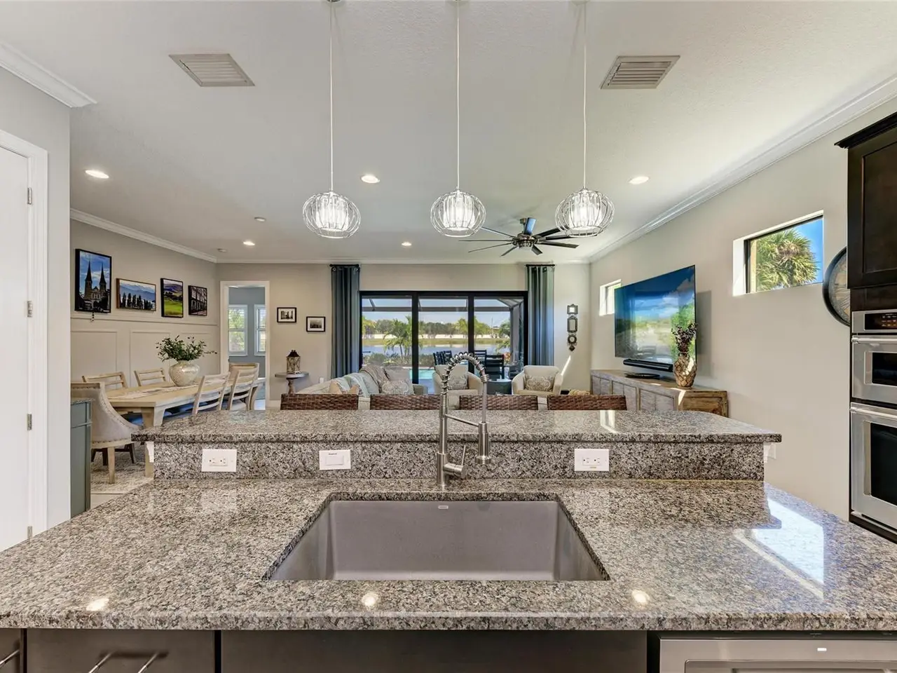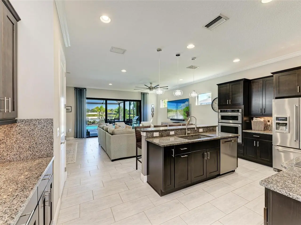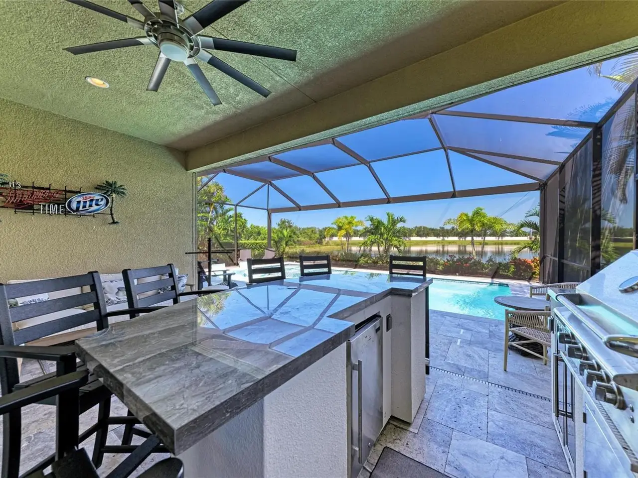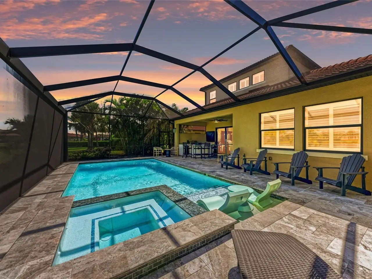 Discover this beautifully upgraded 4 bedroom, 4.5 bathroom home with tranquil water views in the gated Rosedale Golf & Country Club, designed for both luxury living and effortless entertaining. Featuring tile flooring throughout, crown molding, plantation shutters, custom draperies, and designer light fixtures, every detail has been thoughtfully curated to create a space that is sophisticated, welcoming, and move-in ready. The chef’s kitchen is a showpiece, offering granite counters and backsplash, custom cabinetry, abundant prep space, high-end KitchenAid appliances, a 5-burner gas cooktop, walk-in pantry, and a large island with breakfast bar and seating for family and friends. A butler’s pantry connects the kitchen to the formal dining room, making entertaining effortless. The kitchen opens to the great room, where sliding doors lead to the amazing outdoor living area. The backyard is an entertainer’s dream. Host gatherings or relax outdoors with a spacious entertaining area, heated saltwater pool and spa with sun shelf, travertine pavers, and lush, upgraded landscaping. The outdoor kitchen features two small beverage/wine refrigerators and a large island with seating, creating the perfect space for grilling, poolside dining, or enjoying quiet moments while taking in the beautiful water views. The owner’s suite is a luxurious retreat, offering picturesque water views, a large walk-in closet, dual sinks with granite counters, and a walk-in frameless glass shower. Two additional first-level bedrooms with ensuite bathrooms offer privacy and comfort. Upstairs, a generous loft bedroom suite with full bath and walk-in closet is ideal for overnight guests, extended stays, or a versatile media/game space. Additional upgrades include impact-resistant windows and sliding glass doors, tankless gas water heater, gutters, and designer touches throughout, ensuring both beauty and functionality. Living in Rosedale Golf & Country Club offers a resort-style lifestyle. Low HOA fees cover all landscaping and irrigation maintenance, high-speed fiber internet and cable, two manned 24/7 guard gates, plus two dog parks for residents. Social membership at the club provides access to tennis, a 22,000 sq ft clubhouse, fitness center, studio classes, full-service restaurant, Jr. Olympic-size heated pool, and year-round social events. For the avid golfer, Rosedale offers various levels of optional golf membership. Ideally located near I-75, Lakewood Ranch, UTC Mall, top-rated schools, shopping, dining, parks, medical facilities, and world-famous beaches, this home perfectly blends luxury, comfort, and an entertainer’s dream lifestyle.