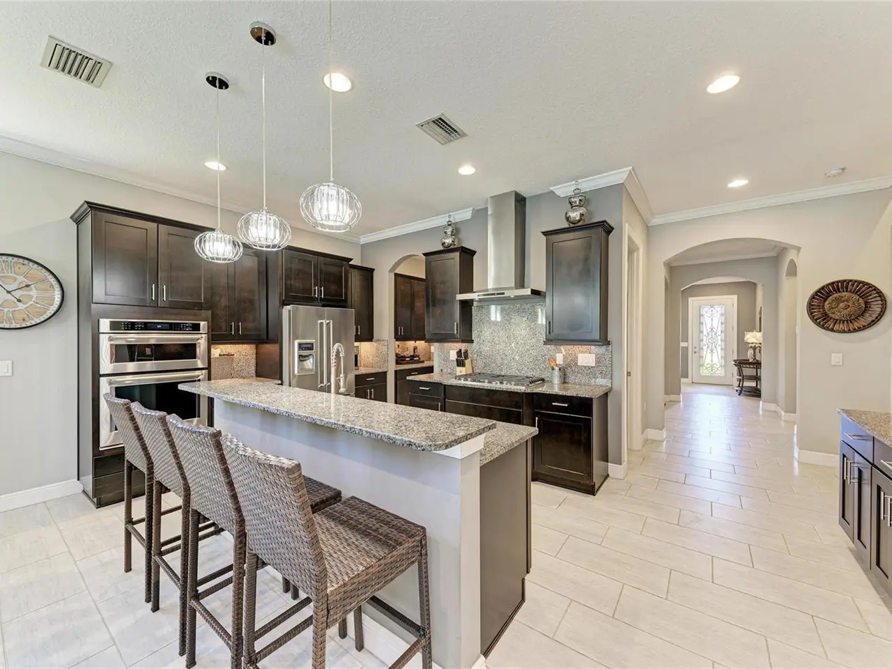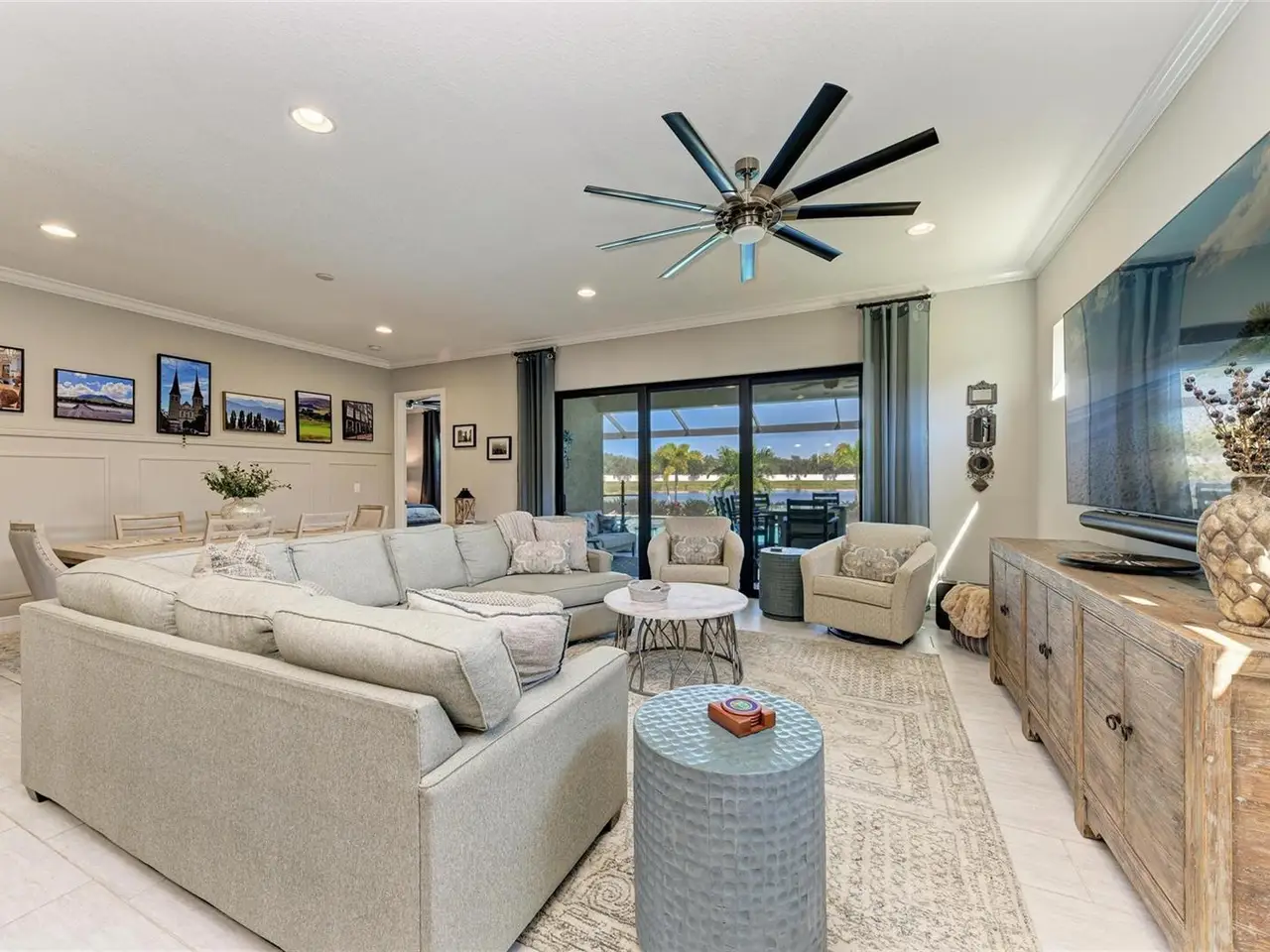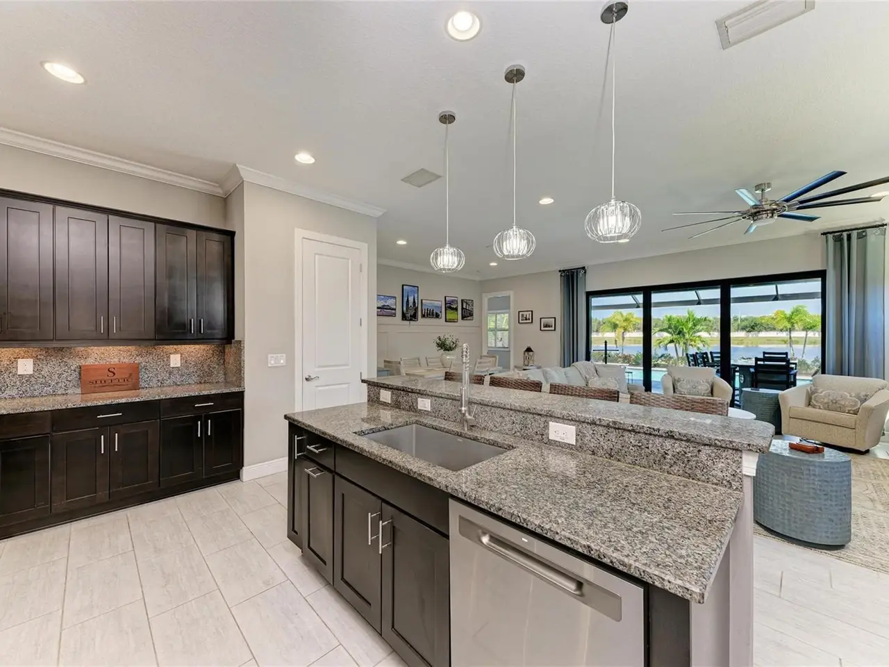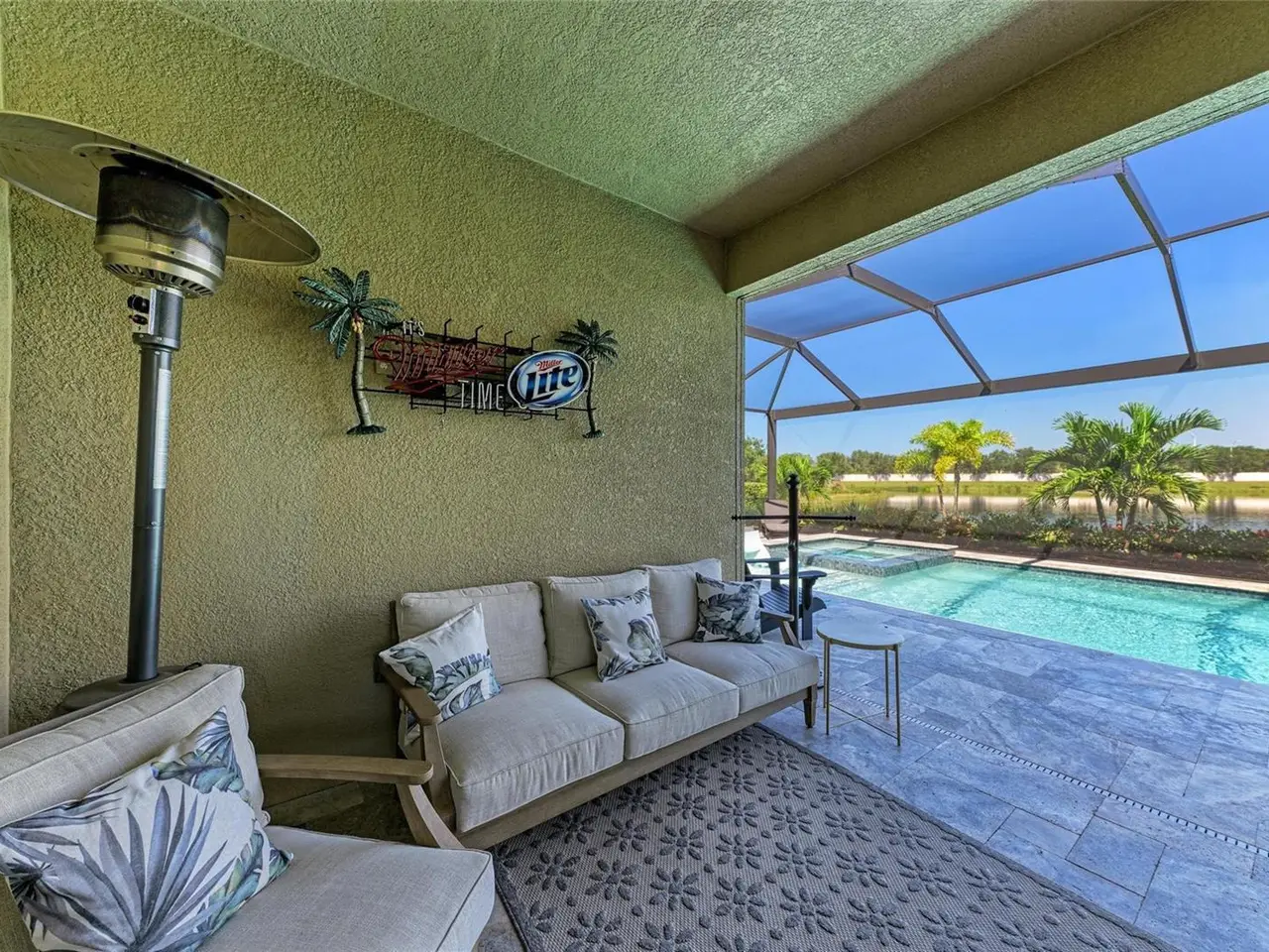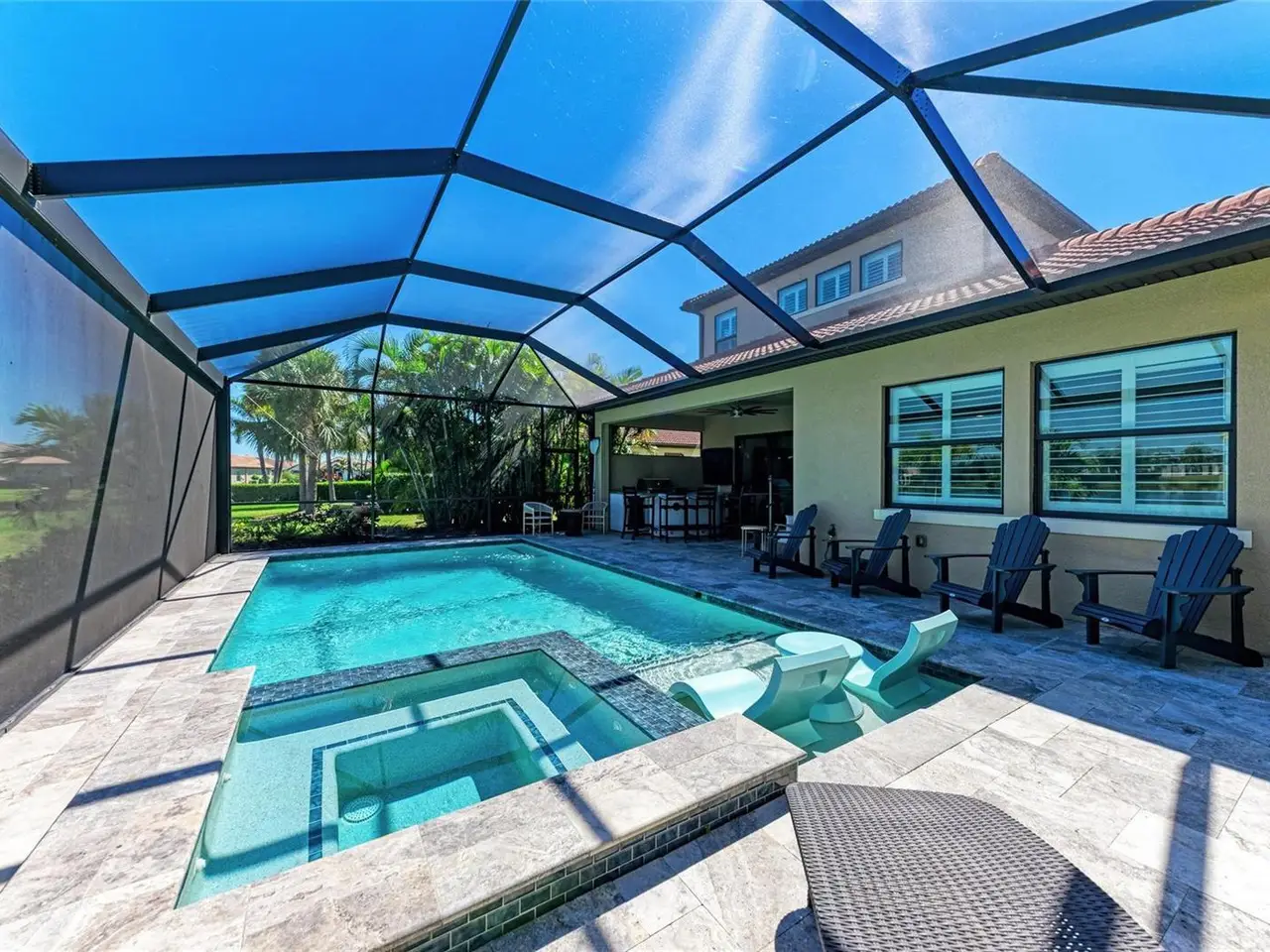 Discover this beautifully upgraded 4 bedroom, 4.5 bathroom home with tranquil water views in the gated Rosedale Golf & Country Club, designed for both luxury living and effortless entertaining. Featuring tile flooring throughout, crown molding, plantation shutters, custom draperies, and designer light fixtures, every detail has been thoughtfully curated to create a space that is sophisticated, welcoming, and move-in ready. The chef’s kitchen is a showpiece, offering granite counters and backsplash, custom cabinetry, abundant prep space, high-end KitchenAid appliances, a 5-burner gas cooktop, walk-in pantry, and a large island with breakfast bar and seating for family and friends. A butler’s pantry connects the kitchen to the formal dining room, making entertaining effortless. The kitchen opens to the great room, where sliding doors lead to the amazing outdoor living area. The backyard is an entertainer’s dream. Host gatherings or relax outdoors with a spacious entertaining area, heated saltwater pool and spa with sun shelf, travertine pavers, and lush, upgraded landscaping. The outdoor kitchen features two small beverage/wine refrigerators and a large island with seating, creating the perfect space for grilling, poolside dining, or enjoying quiet moments while taking in the beautiful water views. The owner’s suite is a luxurious retreat, offering picturesque water views, a large walk-in closet, dual sinks with granite counters, and a walk-in frameless glass shower. Two additional first-level bedrooms with ensuite bathrooms offer privacy and comfort. Upstairs, a generous loft bedroom suite with full bath and walk-in closet is ideal for overnight guests, extended stays, or a versatile media/game space. Additional upgrades include impact-resistant windows and sliding glass doors, tankless gas water heater, gutters, and designer touches throughout, ensuring both beauty and functionality. Living in Rosedale Golf & Country Club offers a resort-style lifestyle. Low HOA fees cover all landscaping and irrigation maintenance, high-speed fiber internet and cable, two manned 24/7 guard gates, plus two dog parks for residents. Social membership at the club provides access to tennis, a 22,000 sq ft clubhouse, fitness center, studio classes, full-service restaurant, Jr. Olympic-size heated pool, and year-round social events. For the avid golfer, Rosedale offers various levels of optional golf membership. Ideally located near I-75, Lakewood Ranch, UTC Mall, top-rated schools, shopping, dining, parks, medical facilities, and world-famous beaches, this home perfectly blends luxury, comfort, and an entertainer’s dream lifestyle.