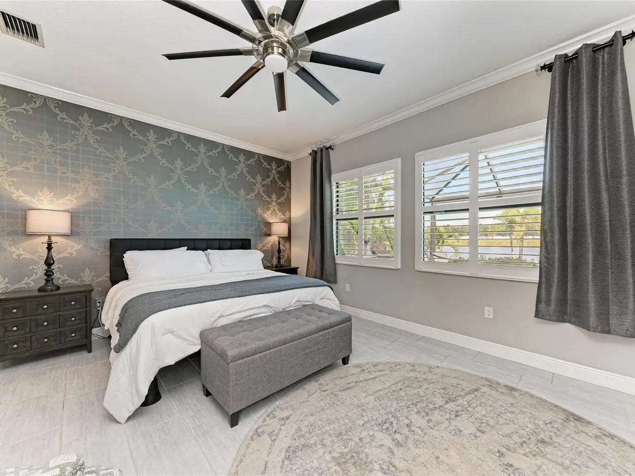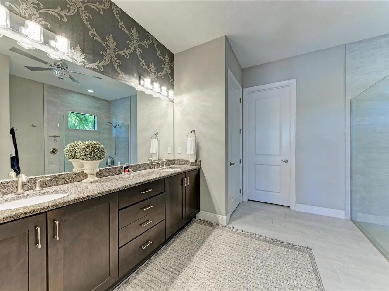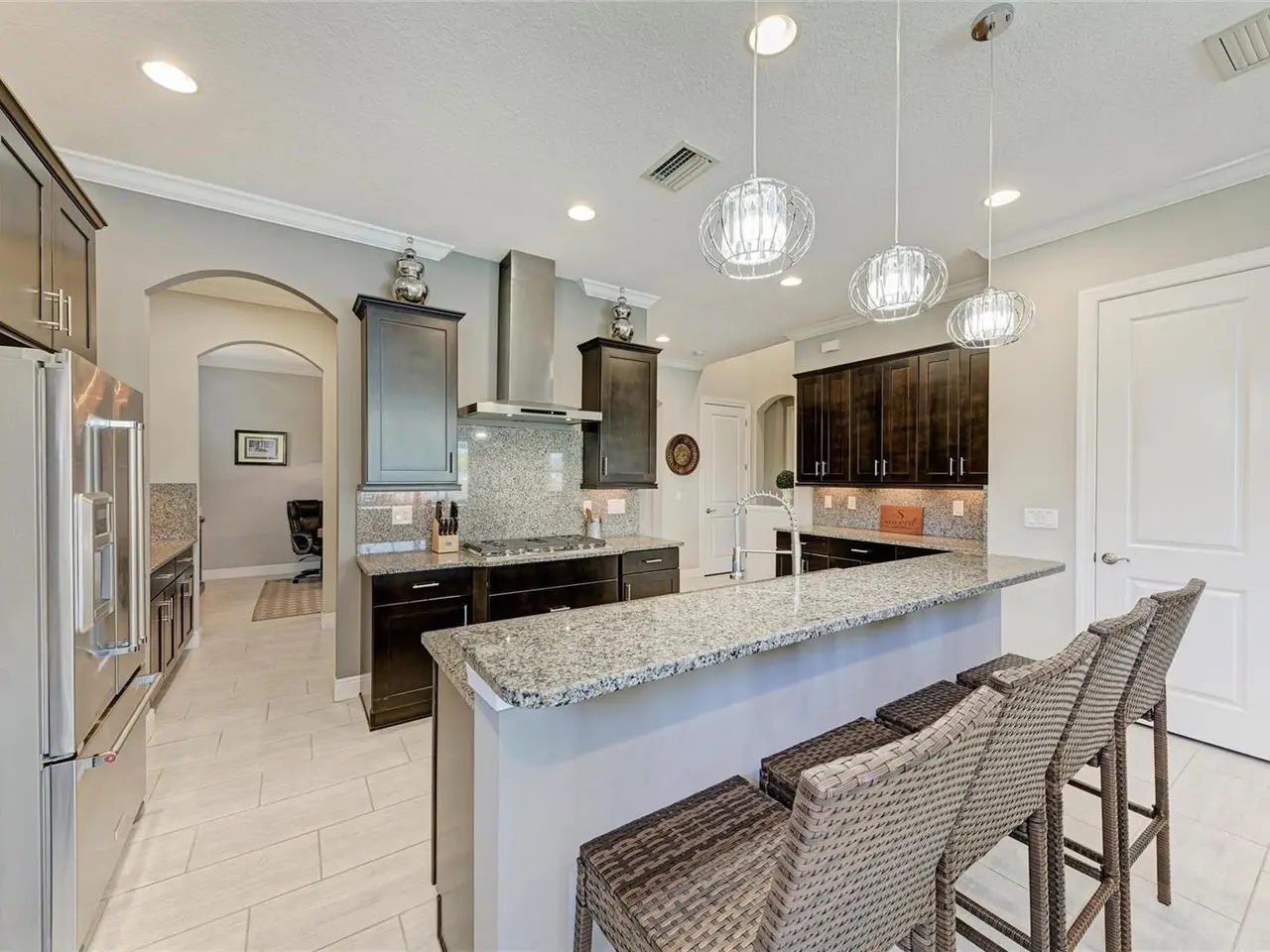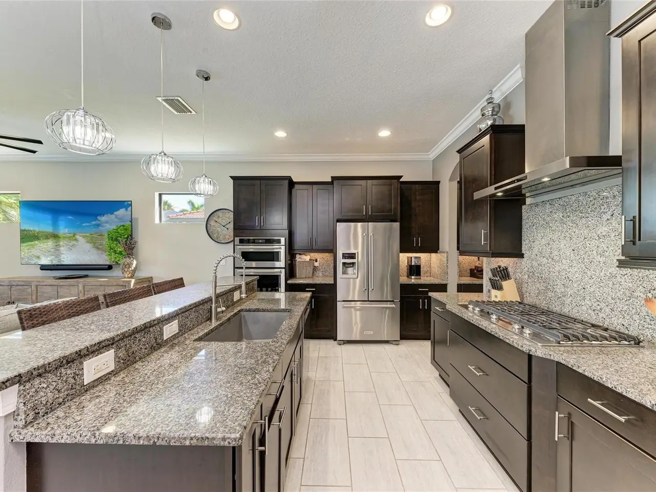 Discover this beautifully upgraded 4 bedroom, 4.5 bathroom home with tranquil water views in the gated Rosedale Golf & Country Club, designed for both luxury living and effortless entertaining. Featuring tile flooring throughout, crown molding, plantation shutters, custom draperies, and designer light fixtures, every detail has been thoughtfully curated to create a space that is sophisticated, welcoming, and move-in ready. The chef’s kitchen is a showpiece, offering granite counters and backsplash, custom cabinetry, abundant prep space, high-end KitchenAid appliances, a 5-burner gas cooktop, walk-in pantry, and a large island with breakfast bar and seating for family and friends. A butler’s pantry connects the kitchen to the formal dining room, making entertaining effortless. The kitchen opens to the great room, where sliding doors lead to the amazing outdoor living area. The backyard is an entertainer’s dream. Host gatherings or relax outdoors with a spacious entertaining area, heated saltwater pool and spa with sun shelf, travertine pavers, and lush, upgraded landscaping. The outdoor kitchen features two small beverage/wine refrigerators and a large island with seating, creating the perfect space for grilling, poolside dining, or enjoying quiet moments while taking in the beautiful water views. The owner’s suite is a luxurious retreat, offering picturesque water views, a large walk-in closet, dual sinks with granite counters, and a walk-in frameless glass shower. Two additional first-level bedrooms with ensuite bathrooms offer privacy and comfort. Upstairs, a generous loft bedroom suite with full bath and walk-in closet is ideal for overnight guests, extended stays, or a versatile media/game space. Additional upgrades include impact-resistant windows and sliding glass doors, tankless gas water heater, gutters, and designer touches throughout, ensuring both beauty and functionality. Living in Rosedale Golf & Country Club offers a resort-style lifestyle. Low HOA fees cover all landscaping and irrigation maintenance, high-speed fiber internet and cable, two manned 24/7 guard gates, plus two dog parks for residents. Social membership at the club provides access to tennis, a 22,000 sq ft clubhouse, fitness center, studio classes, full-service restaurant, Jr. Olympic-size heated pool, and year-round social events. For the avid golfer, Rosedale offers various levels of optional golf membership. Ideally located near I-75, Lakewood Ranch, UTC Mall, top-rated schools, shopping, dining, parks, medical facilities, and world-famous beaches, this home perfectly blends luxury, comfort, and an entertainer’s dream lifestyle.