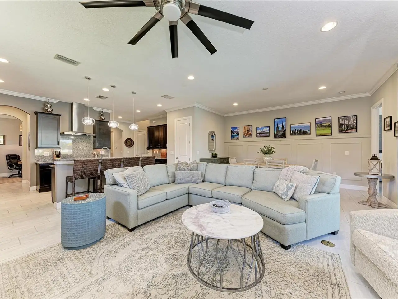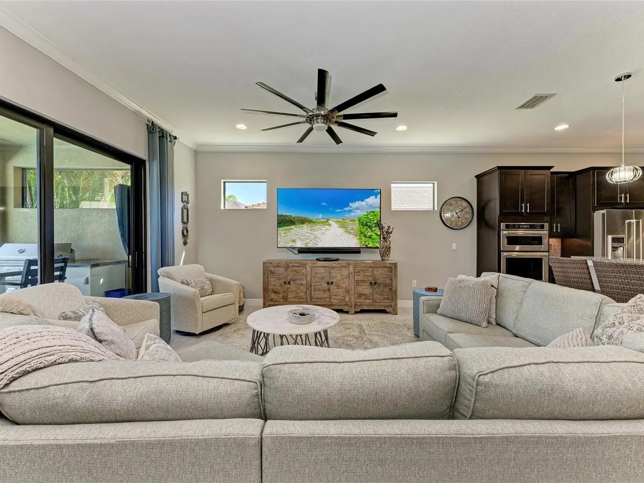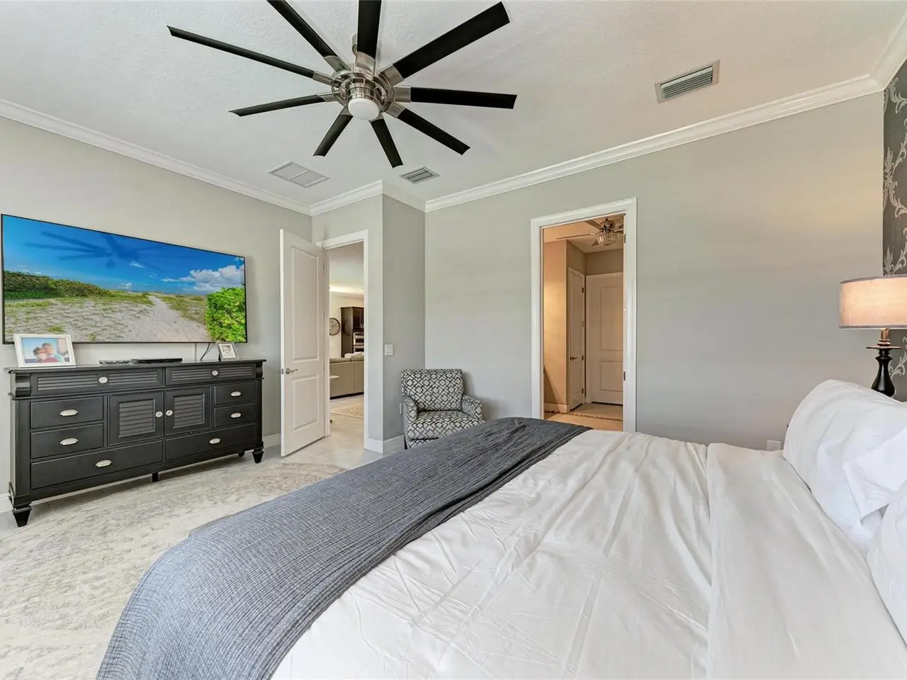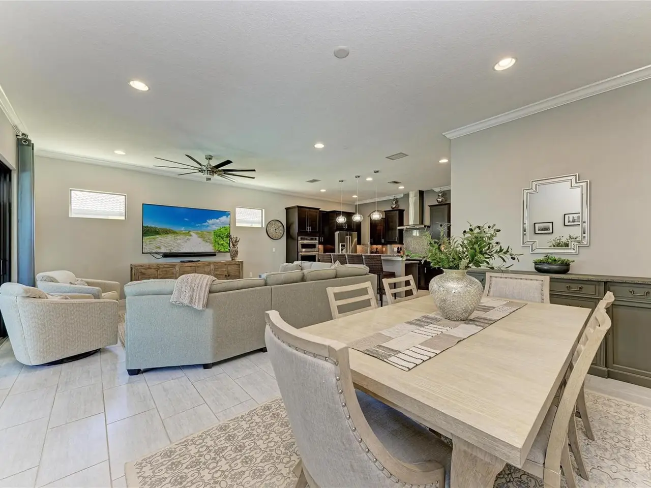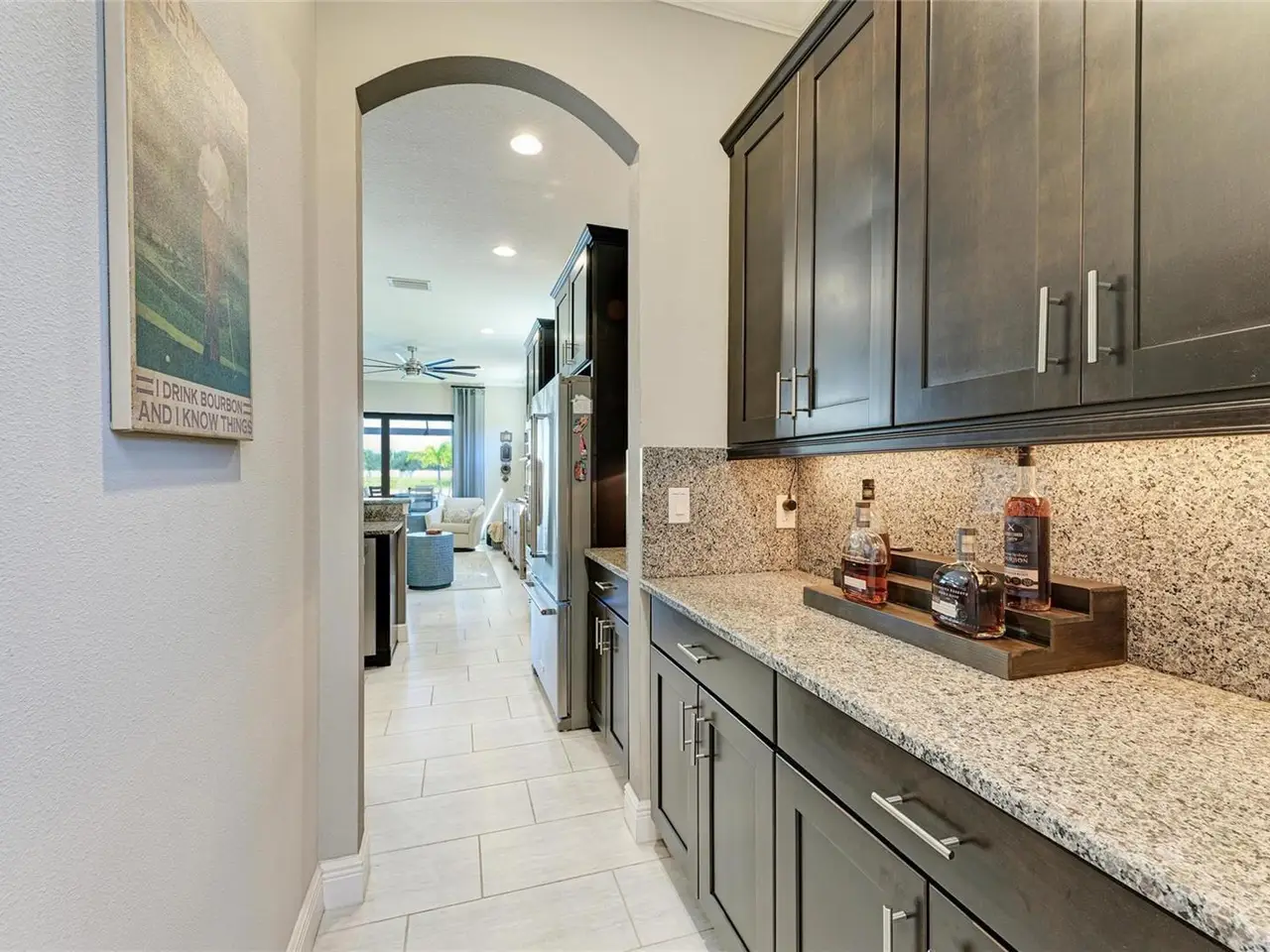 Discover this beautifully upgraded 4 bedroom, 4.5 bathroom home with tranquil water views in the gated Rosedale Golf & Country Club, designed for both luxury living and effortless entertaining. Featuring tile flooring throughout, crown molding, plantation shutters, custom draperies, and designer light fixtures, every detail has been thoughtfully curated to create a space that is sophisticated, welcoming, and move-in ready. The chef’s kitchen is a showpiece, offering granite counters and backsplash, custom cabinetry, abundant prep space, high-end KitchenAid appliances, a 5-burner gas cooktop, walk-in pantry, and a large island with breakfast bar and seating for family and friends. A butler’s pantry connects the kitchen to the formal dining room, making entertaining effortless. The kitchen opens to the great room, where sliding doors lead to the amazing outdoor living area. The backyard is an entertainer’s dream. Host gatherings or relax outdoors with a spacious entertaining area, heated saltwater pool and spa with sun shelf, travertine pavers, and lush, upgraded landscaping. The outdoor kitchen features two small beverage/wine refrigerators and a large island with seating, creating the perfect space for grilling, poolside dining, or enjoying quiet moments while taking in the beautiful water views. The owner’s suite is a luxurious retreat, offering picturesque water views, a large walk-in closet, dual sinks with granite counters, and a walk-in frameless glass shower. Two additional first-level bedrooms with ensuite bathrooms offer privacy and comfort. Upstairs, a generous loft bedroom suite with full bath and walk-in closet is ideal for overnight guests, extended stays, or a versatile media/game space. Additional upgrades include impact-resistant windows and sliding glass doors, tankless gas water heater, gutters, and designer touches throughout, ensuring both beauty and functionality. Living in Rosedale Golf & Country Club offers a resort-style lifestyle. Low HOA fees cover all landscaping and irrigation maintenance, high-speed fiber internet and cable, two manned 24/7 guard gates, plus two dog parks for residents. Social membership at the club provides access to tennis, a 22,000 sq ft clubhouse, fitness center, studio classes, full-service restaurant, Jr. Olympic-size heated pool, and year-round social events. For the avid golfer, Rosedale offers various levels of optional golf membership. Ideally located near I-75, Lakewood Ranch, UTC Mall, top-rated schools, shopping, dining, parks, medical facilities, and world-famous beaches, this home perfectly blends luxury, comfort, and an entertainer’s dream lifestyle.