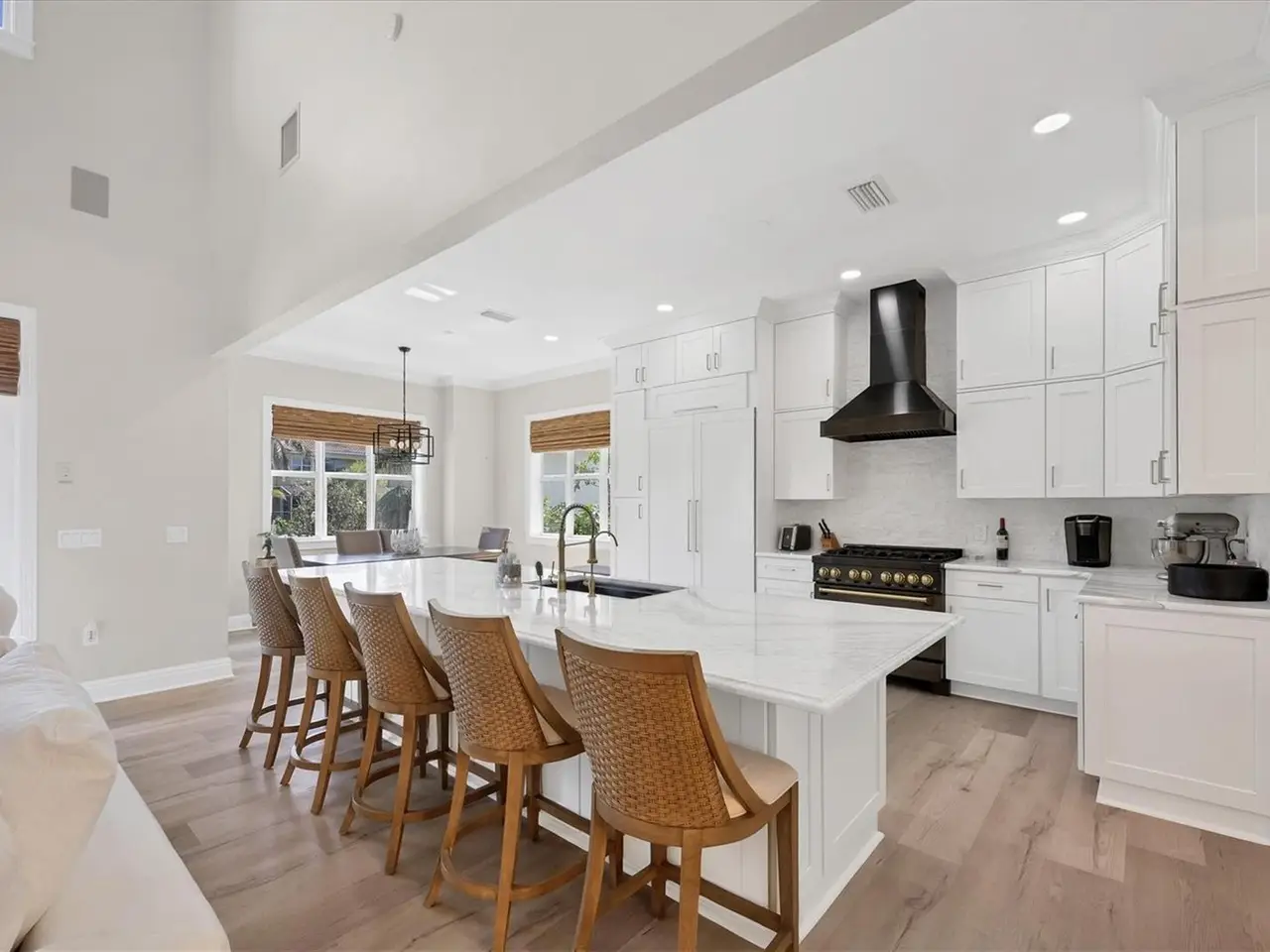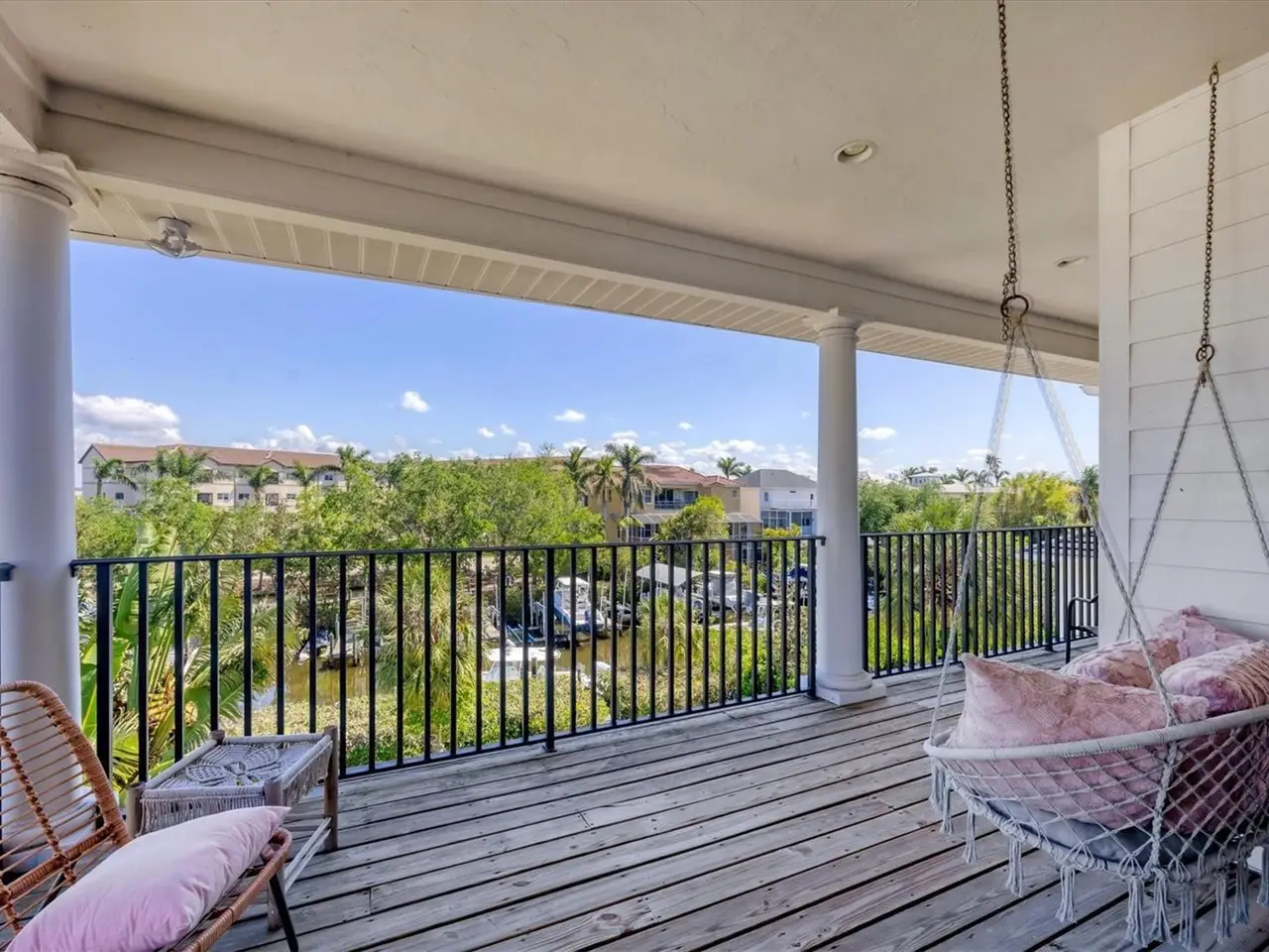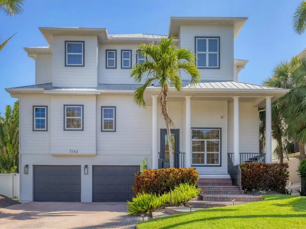 Key West-style custom-built 3-bedroom, 3.5-bath waterfront home located on deep water Crystal Canal in the gated community of Hawks Harbor. Metal roof and over $322,000 in renovations completed in 2022. Layout includes a soaring-ceiling family room, a lower-level flex space with two additional storage areas, and an upstairs loft ideal for a home office, sitting area, or game room. All bedrooms are ensuite. Kitchen features Zline and Decor appliances, Quartz countertops, stone backsplash, farmhouse sink, pantry closet, eat-in space, and a long island seating five. A whole-house water filtration system is included. The master suite includes French doors to a private balcony, step ceiling, walk-in custom closet, double sink with decorative fixtures, large walk-in shower with rain head and body sprays, garden tub, and a stone feature wall. Both secondary bedrooms feature tile flooring, walk-in closets, French doors to a balcony, and remodeled bathrooms with rain head and body spray showers. Laundry room includes Samsung washer/dryer, sink, and storage cabinetry. Outdoor amenities include a cozy front porch with composite decking, fenced backyard, spacious covered area, heated saltwater pool and spa with Pentair EasyTouch remote, putting green, Gardenia trees, grass yard with Invisible Fence. 23' new dock with water and electric plus a Jet Ski floating dock. Major systems: 2021 water heater; HVACs replaced in 2020, 2021, and 2022. Additional upgrades: luxury vinyl flooring, new interior and exterior paint, new front door, new main-level deck and stairs, new interior and exterior lighting including all new interior LEDs, new concrete sidewalk, impact glass, crown molding, paver driveway and walkway, wall/ceiling speakers, and freshly painted 26-foot-deep 2-car garage with ample storage. Conveniently located minutes from downtown Sarasota and IMG Academy, with close proximity to Sarasota Airport, restaurants, shops, St. Armands Circle, and Gulf beaches.