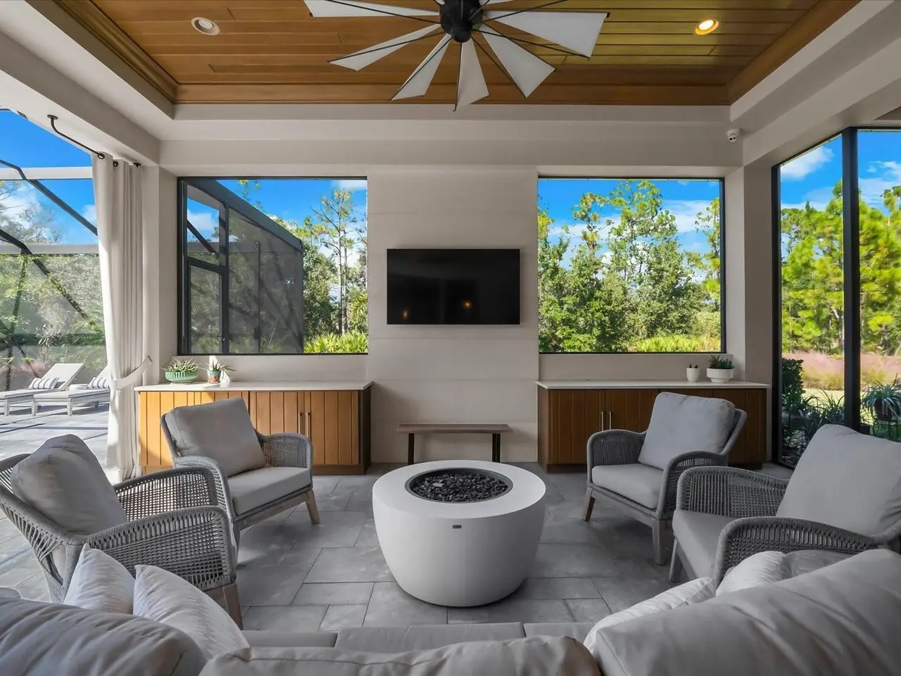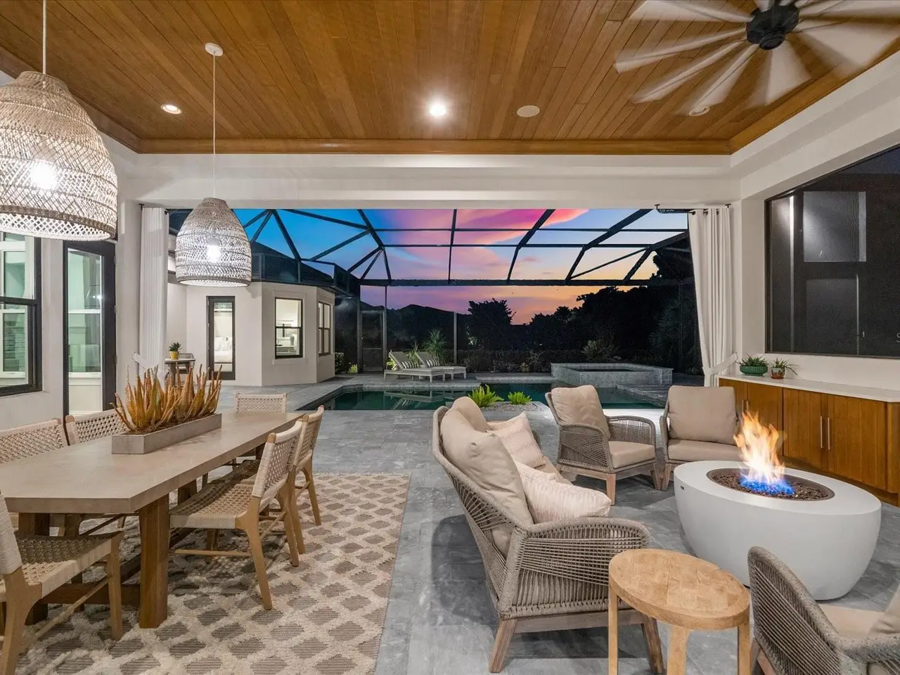 Resort-like outdoor lanai with fire pit