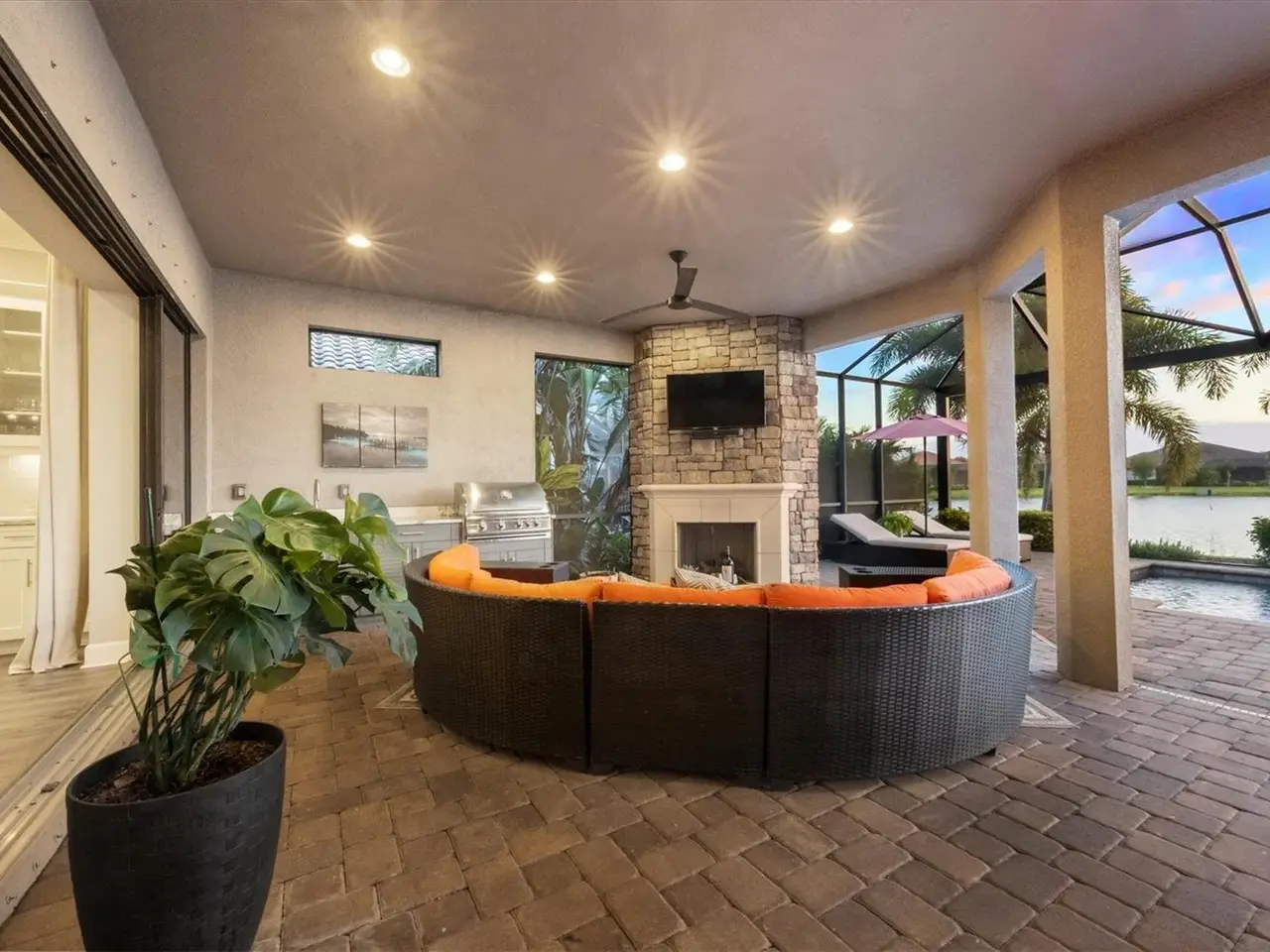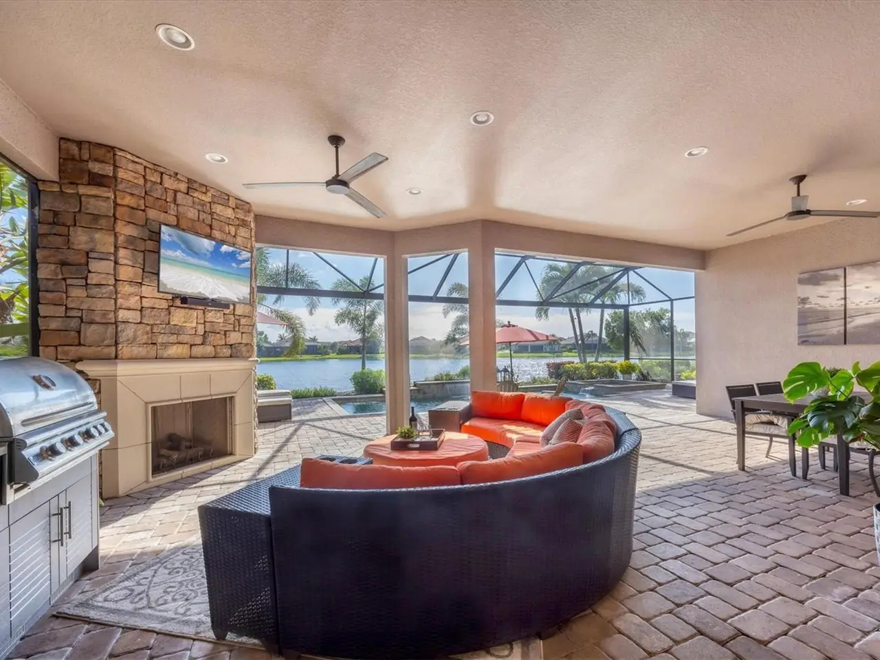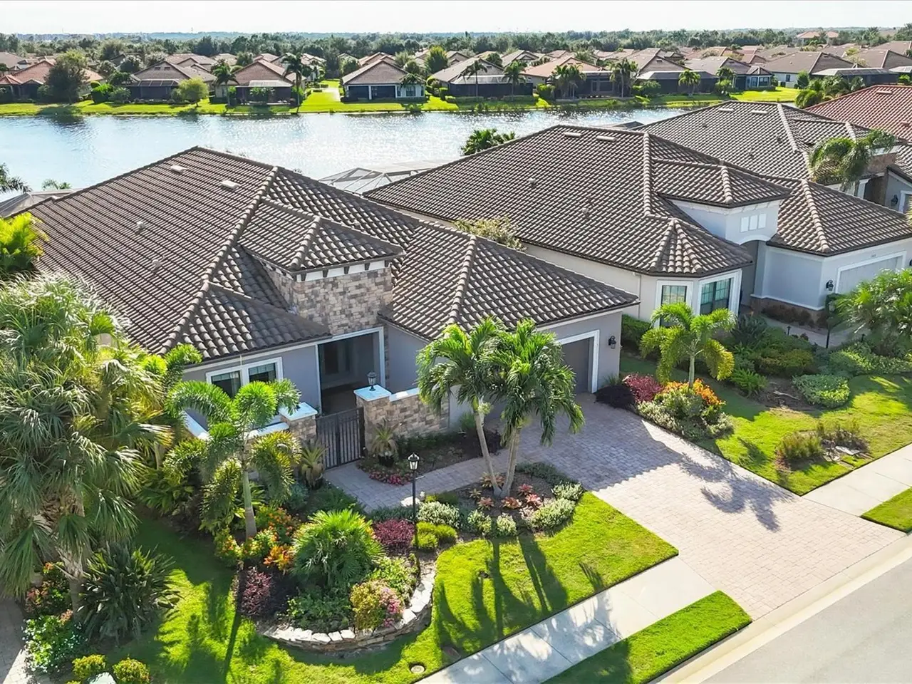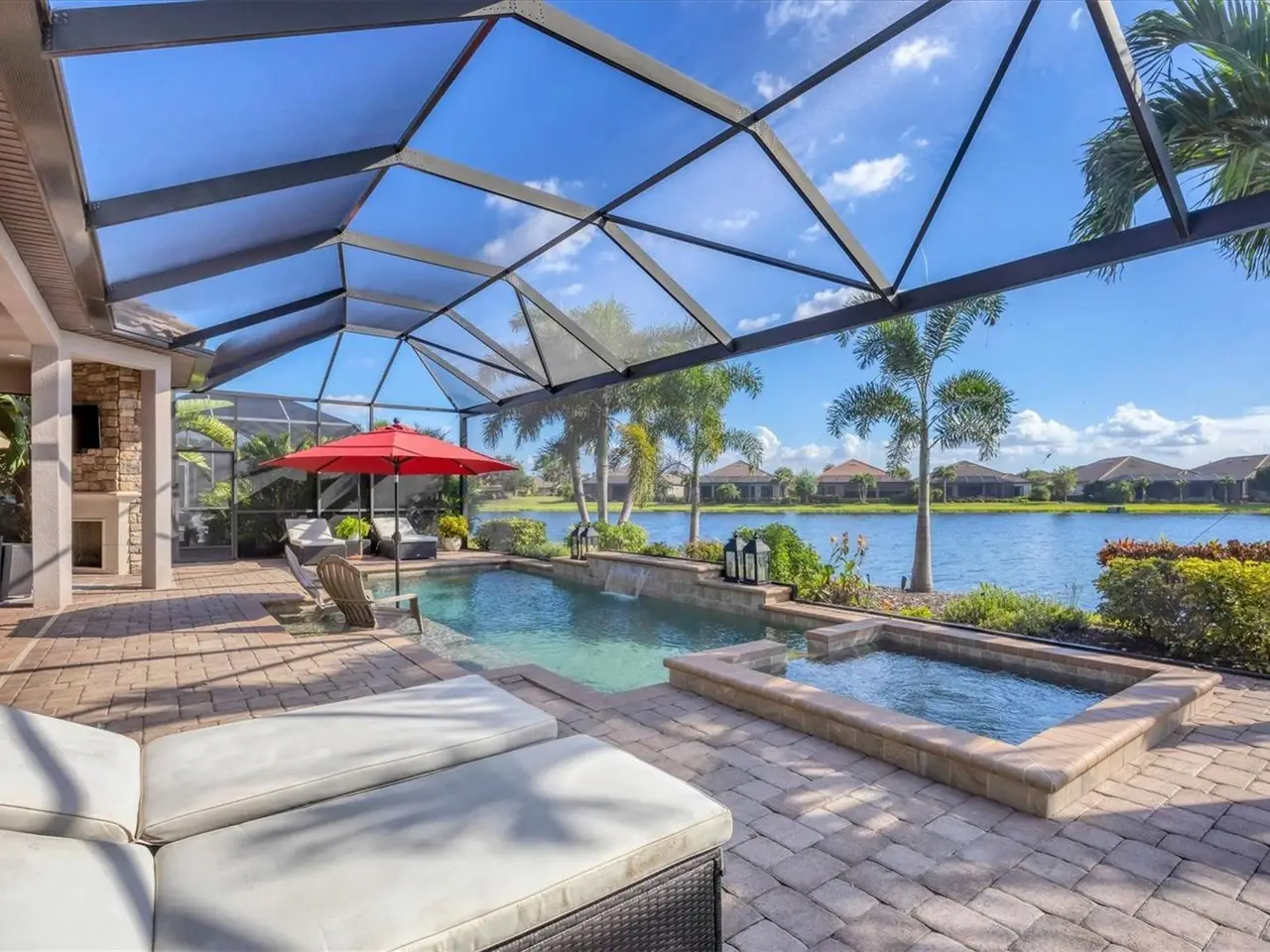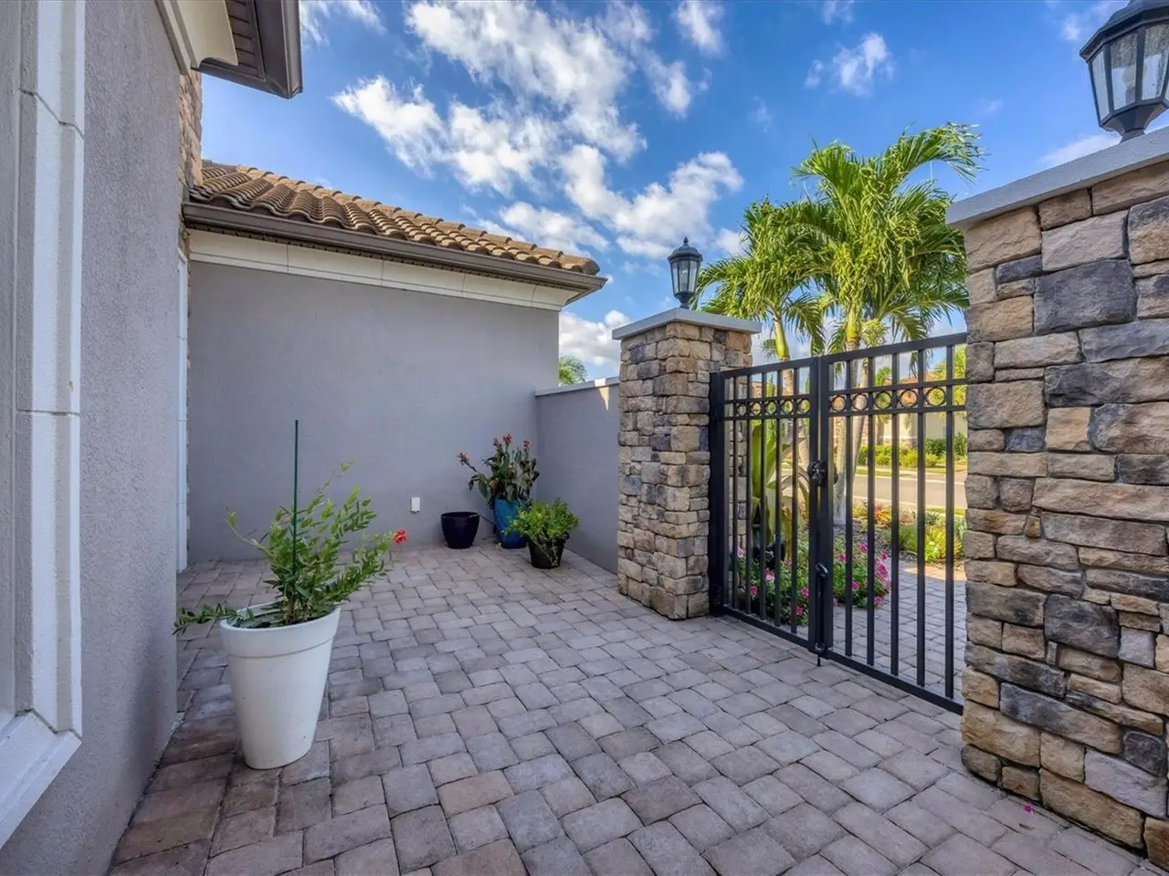 Embrace the ultimate resort-style living in this stunning water view home, featuring the coveted Pallazio VII floor plan with an added nook. This residence boasts an expansive outdoor living space with a gas fireplace, perfect for both relaxation and entertainment, enhanced by Elevation C with a 4 ft garage extension. With a FULL GOLF MEMBERSHIP included, you can enjoy the best of golf and leisure right at your doorstep! As you enter through the charming, gated courtyard and double doors, you will be welcomed by impressive columns and soaring ceilings that set the tone for elegance. The open-concept great room, adorned with crown molding and bathed in natural light from disappearing pocket sliding doors, seamlessly connects to the lanai with breathtaking southwest facing views of the pool and outdoor oasis. The upgraded gourmet kitchen is a chefs dream, featuring stainless-steel appliances including Quartz Cambria countertops, a 36-inch natural gas cooktop, and a built-in oven. The oversized island, highlighted by stylish pendant lighting, offers ample storage and is perfect for entertaining or family meals. Enjoy morning coffee in the extended breakfast area, with sliding glass pocket doors that open to the lanai. Retreat to the grand primary bedroom, a private sanctuary complete with a spacious en-suite bathroom featuring dual sinks, a frameless glass shower, and a large walk-in closet. Two guest bedrooms provide comfort and privacy, one with an en-suite bathroom and the other with convenient access to a separate bath. The generously sized study/den, accessible through elegant 8 ft. French double doors, offers versatility for work or can easily be transformed into a fourth bedroom. Step outside to the extended screened lanai, where the expansive paver deck and endless water views invite you to soak up Florida’s sunshine. With a wealth of community amenities, including an 18-hole championship golf course, tennis and pickleball courts, two resort-style pools, and a full-service spa, you will never run out of things to do. Enjoy fine dining at the Barrel House Bistro, or casual meals at the Bahama Bar, along with an active social calendar filled with events. Located in award-winning Lakewood Ranch, you are just moments away from shopping, dining, local farmers? markets, scenic trails, and beautiful beaches. Don't miss your chance to own this meticulously designed home in one of Florida's premier communities, schedule your showing today and step into your dream lifestyle! GREAT ROOM AND PRIMARY BEDROOM LIGHT FIXTURES DO NOT CONVEY.