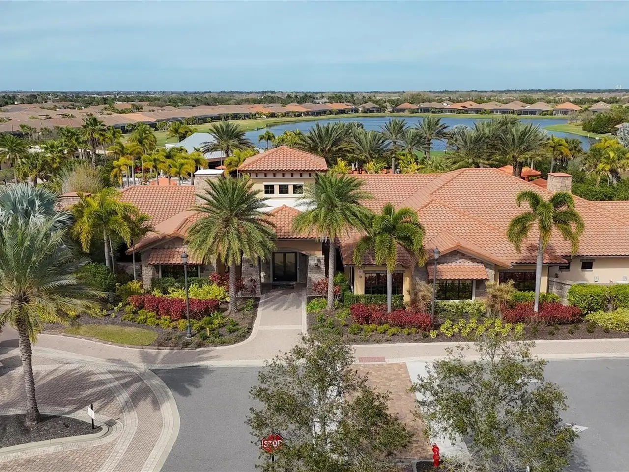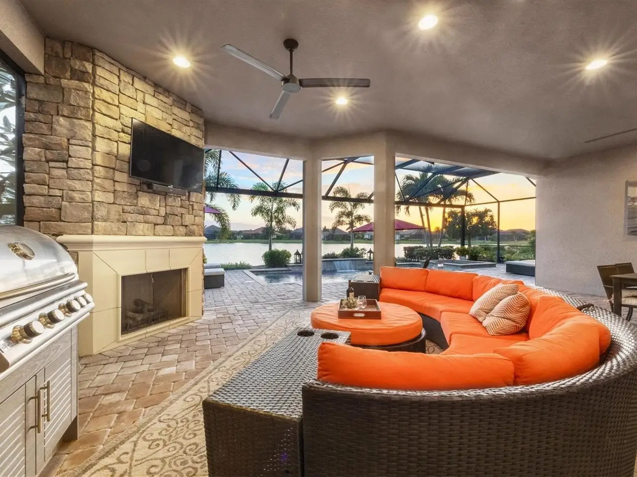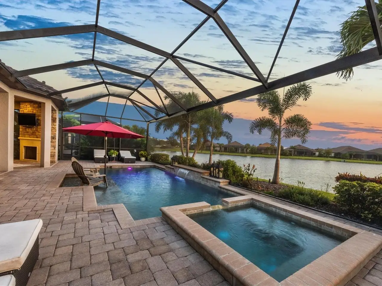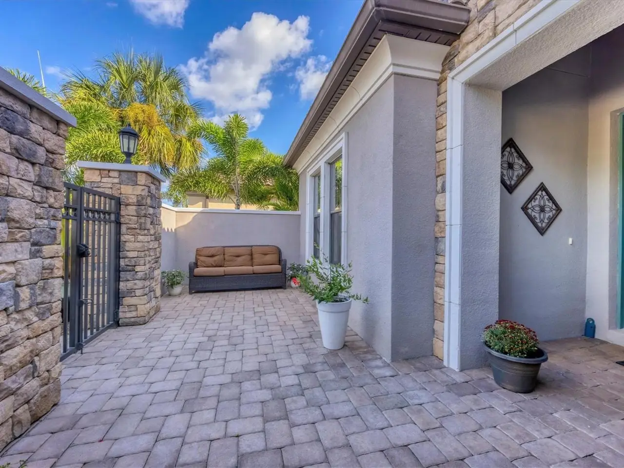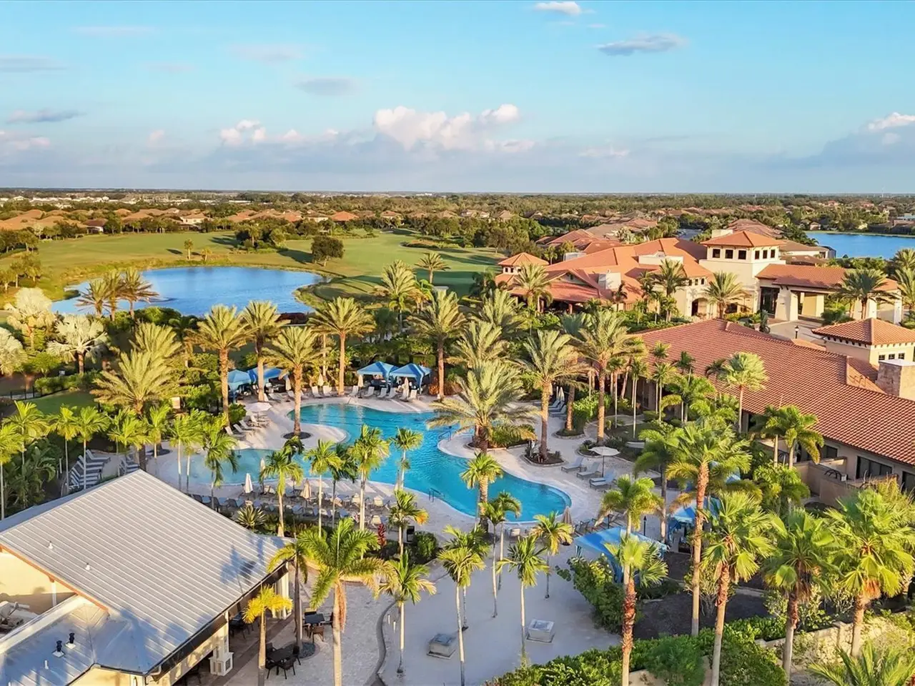 Embrace the ultimate resort-style living in this stunning water view home, featuring the coveted Pallazio VII floor plan with an added nook. This residence boasts an expansive outdoor living space with a gas fireplace, perfect for both relaxation and entertainment, enhanced by Elevation C with a 4 ft garage extension. With a FULL GOLF MEMBERSHIP included, you can enjoy the best of golf and leisure right at your doorstep! As you enter through the charming, gated courtyard and double doors, you will be welcomed by impressive columns and soaring ceilings that set the tone for elegance. The open-concept great room, adorned with crown molding and bathed in natural light from disappearing pocket sliding doors, seamlessly connects to the lanai with breathtaking southwest facing views of the pool and outdoor oasis. The upgraded gourmet kitchen is a chefs dream, featuring stainless-steel appliances including Quartz Cambria countertops, a 36-inch natural gas cooktop, and a built-in oven. The oversized island, highlighted by stylish pendant lighting, offers ample storage and is perfect for entertaining or family meals. Enjoy morning coffee in the extended breakfast area, with sliding glass pocket doors that open to the lanai. Retreat to the grand primary bedroom, a private sanctuary complete with a spacious en-suite bathroom featuring dual sinks, a frameless glass shower, and a large walk-in closet. Two guest bedrooms provide comfort and privacy, one with an en-suite bathroom and the other with convenient access to a separate bath. The generously sized study/den, accessible through elegant 8 ft. French double doors, offers versatility for work or can easily be transformed into a fourth bedroom. Step outside to the extended screened lanai, where the expansive paver deck and endless water views invite you to soak up Florida’s sunshine. With a wealth of community amenities, including an 18-hole championship golf course, tennis and pickleball courts, two resort-style pools, and a full-service spa, you will never run out of things to do. Enjoy fine dining at the Barrel House Bistro, or casual meals at the Bahama Bar, along with an active social calendar filled with events. Located in award-winning Lakewood Ranch, you are just moments away from shopping, dining, local farmers? markets, scenic trails, and beautiful beaches. Don't miss your chance to own this meticulously designed home in one of Florida's premier communities, schedule your showing today and step into your dream lifestyle! GREAT ROOM AND PRIMARY BEDROOM LIGHT FIXTURES DO NOT CONVEY.