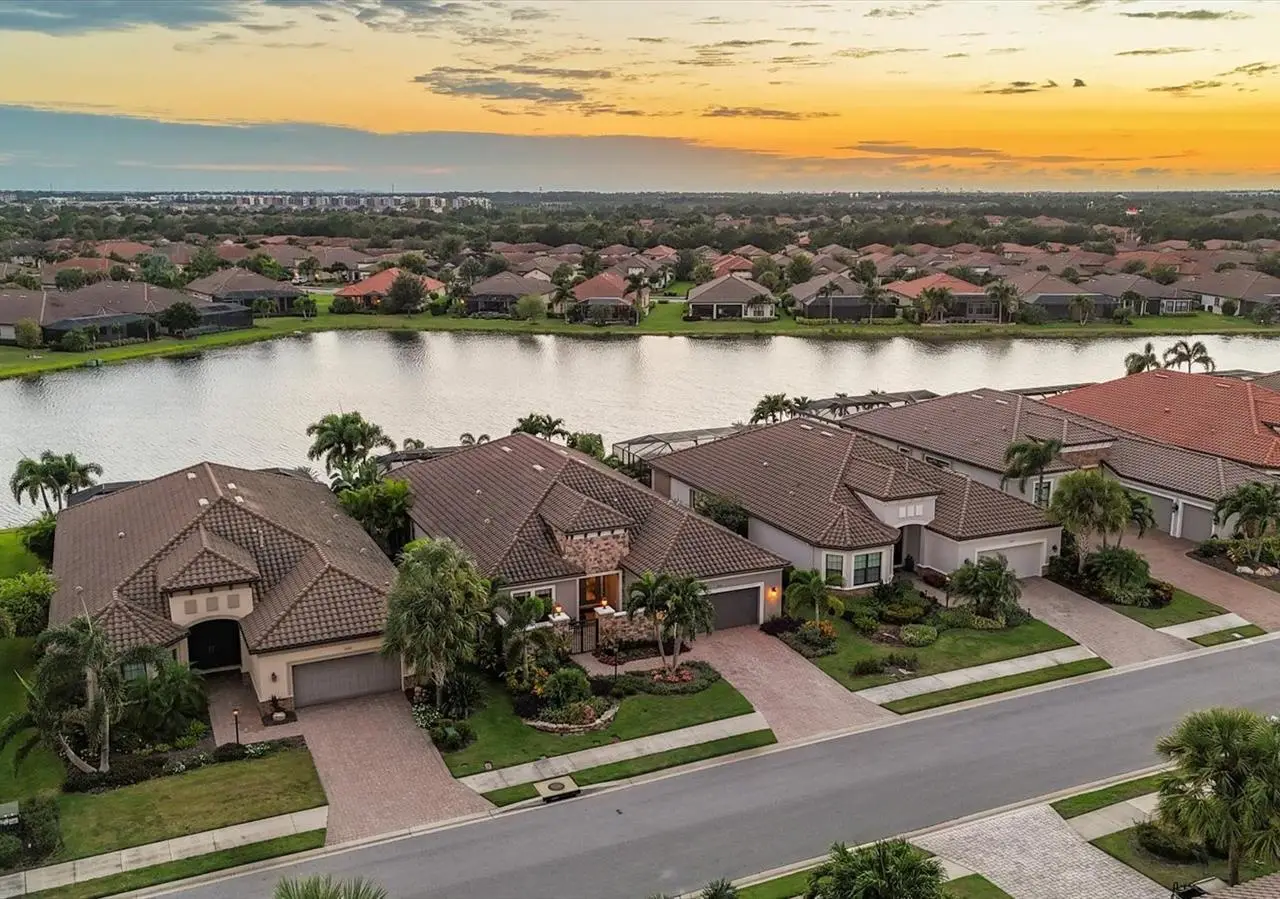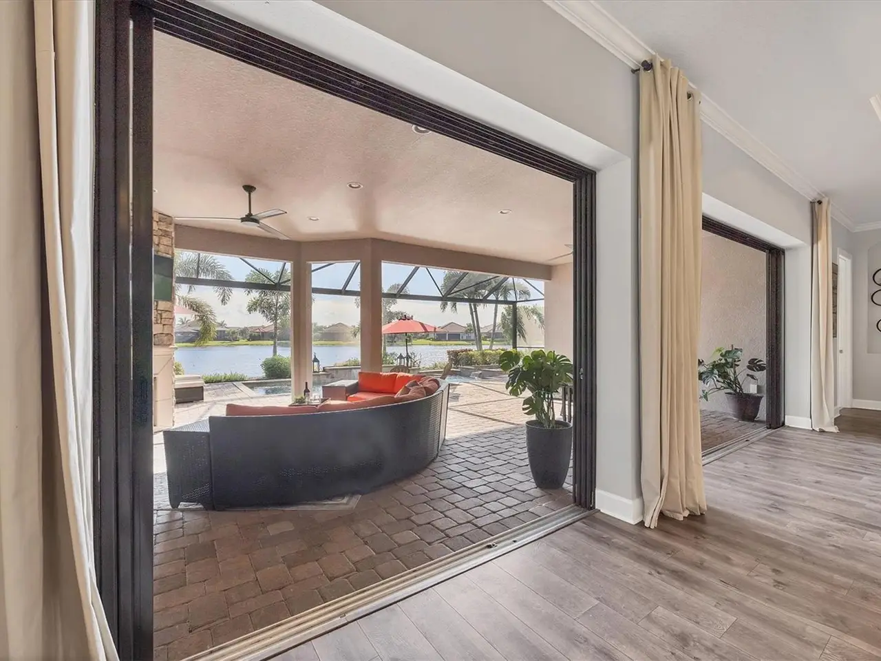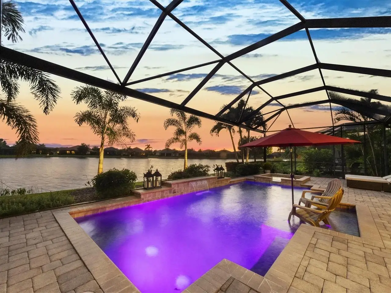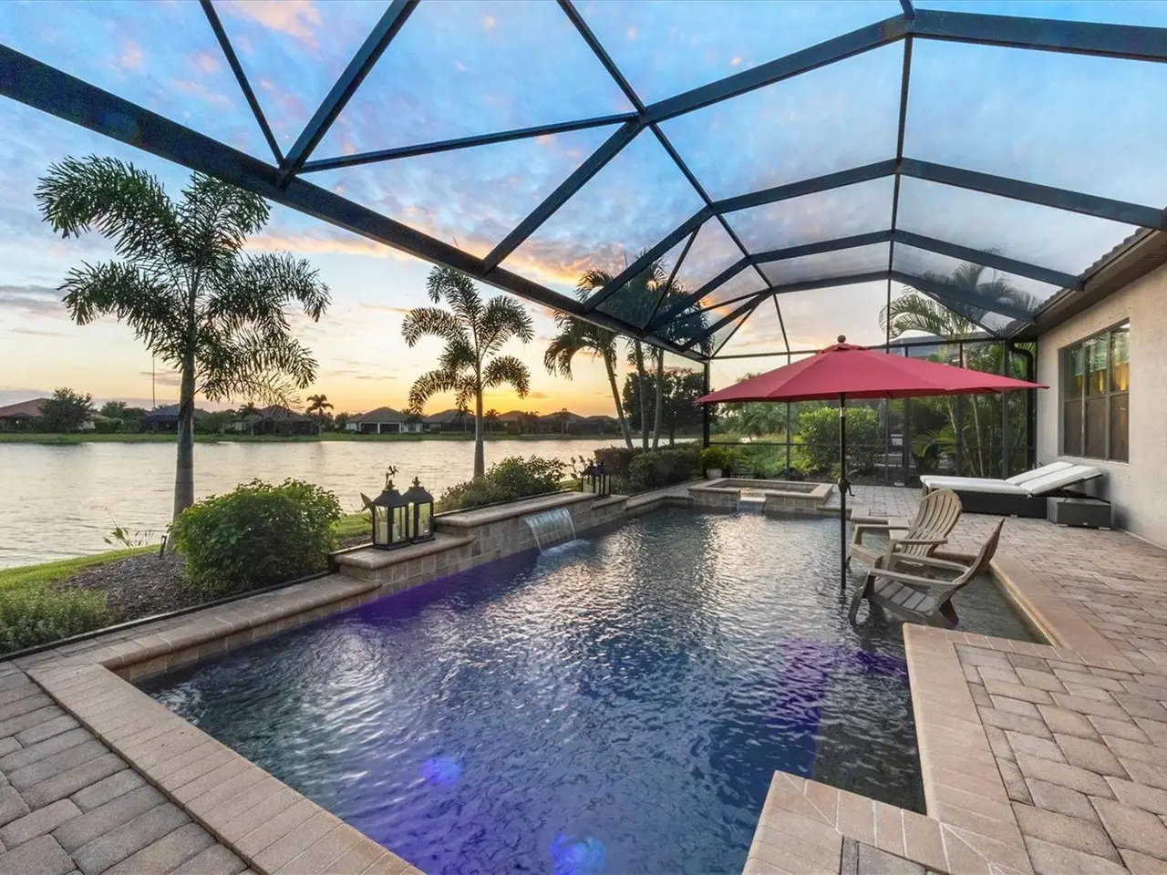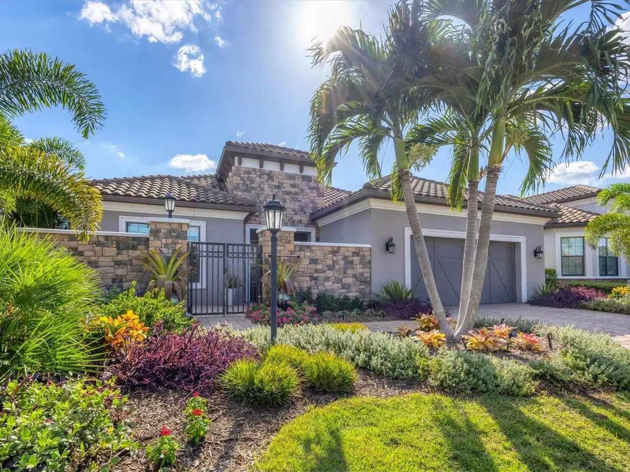 Embrace the ultimate resort-style living in this stunning water view home, featuring the coveted Pallazio VII floor plan with an added nook. This residence boasts an expansive outdoor living space with a gas fireplace, perfect for both relaxation and entertainment, enhanced by Elevation C with a 4 ft garage extension. With a FULL GOLF MEMBERSHIP included, you can enjoy the best of golf and leisure right at your doorstep! As you enter through the charming, gated courtyard and double doors, you will be welcomed by impressive columns and soaring ceilings that set the tone for elegance. The open-concept great room, adorned with crown molding and bathed in natural light from disappearing pocket sliding doors, seamlessly connects to the lanai with breathtaking southwest facing views of the pool and outdoor oasis. The upgraded gourmet kitchen is a chefs dream, featuring stainless-steel appliances including Quartz Cambria countertops, a 36-inch natural gas cooktop, and a built-in oven. The oversized island, highlighted by stylish pendant lighting, offers ample storage and is perfect for entertaining or family meals. Enjoy morning coffee in the extended breakfast area, with sliding glass pocket doors that open to the lanai. Retreat to the grand primary bedroom, a private sanctuary complete with a spacious en-suite bathroom featuring dual sinks, a frameless glass shower, and a large walk-in closet. Two guest bedrooms provide comfort and privacy, one with an en-suite bathroom and the other with convenient access to a separate bath. The generously sized study/den, accessible through elegant 8 ft. French double doors, offers versatility for work or can easily be transformed into a fourth bedroom. Step outside to the extended screened lanai, where the expansive paver deck and endless water views invite you to soak up Florida’s sunshine. With a wealth of community amenities, including an 18-hole championship golf course, tennis and pickleball courts, two resort-style pools, and a full-service spa, you will never run out of things to do. Enjoy fine dining at the Barrel House Bistro, or casual meals at the Bahama Bar, along with an active social calendar filled with events. Located in award-winning Lakewood Ranch, you are just moments away from shopping, dining, local farmers? markets, scenic trails, and beautiful beaches. Don't miss your chance to own this meticulously designed home in one of Florida's premier communities, schedule your showing today and step into your dream lifestyle! GREAT ROOM AND PRIMARY BEDROOM LIGHT FIXTURES DO NOT CONVEY.
