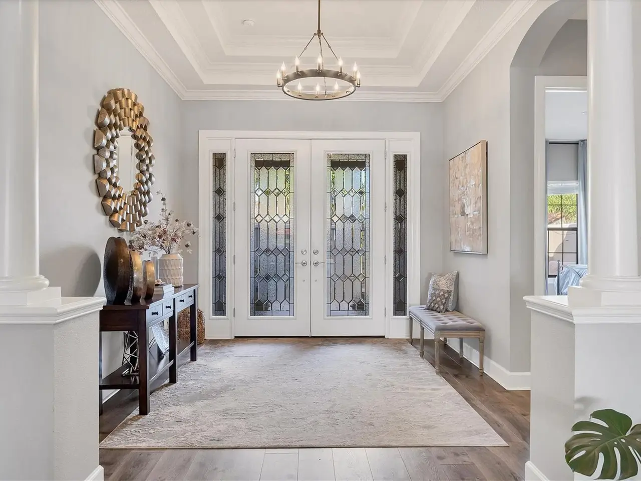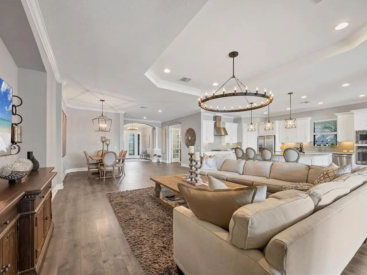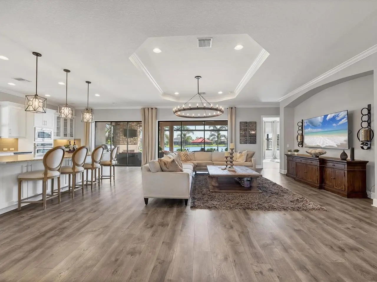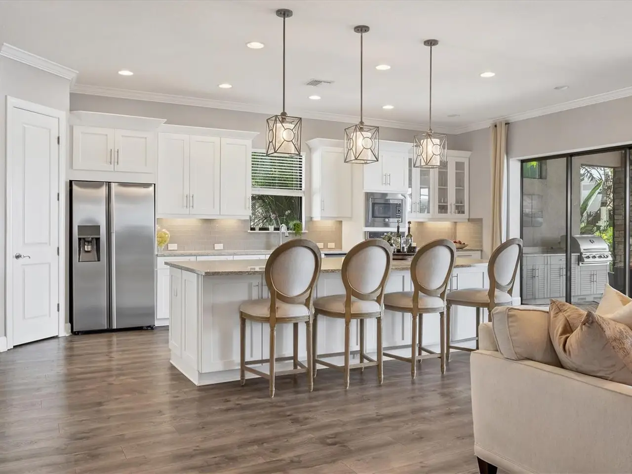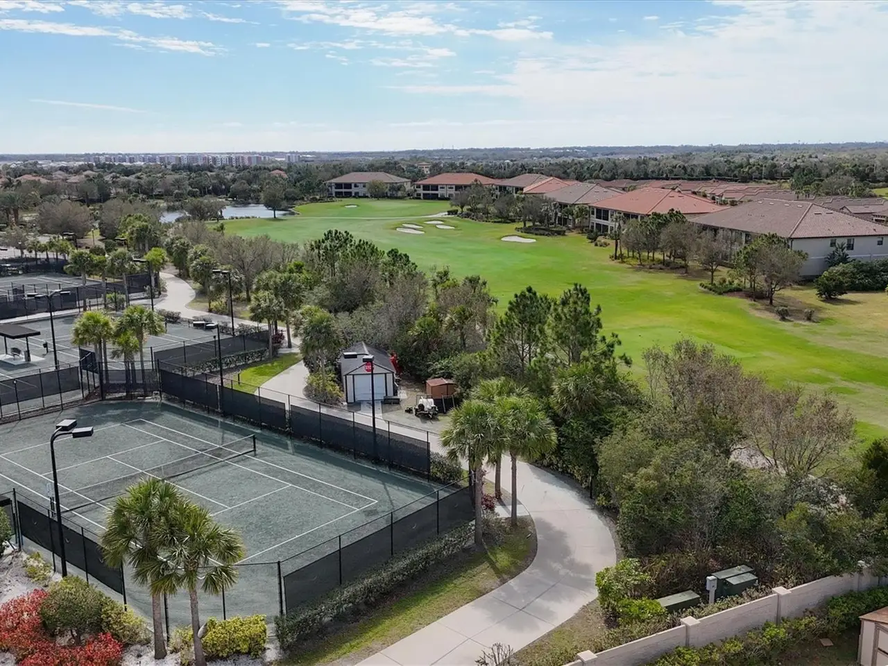 Embrace the ultimate resort-style living in this stunning water view home, featuring the coveted Pallazio VII floor plan with an added nook. This residence boasts an expansive outdoor living space with a gas fireplace, perfect for both relaxation and entertainment, enhanced by Elevation C with a 4 ft garage extension. With a FULL GOLF MEMBERSHIP included, you can enjoy the best of golf and leisure right at your doorstep! As you enter through the charming, gated courtyard and double doors, you will be welcomed by impressive columns and soaring ceilings that set the tone for elegance. The open-concept great room, adorned with crown molding and bathed in natural light from disappearing pocket sliding doors, seamlessly connects to the lanai with breathtaking southwest facing views of the pool and outdoor oasis. The upgraded gourmet kitchen is a chefs dream, featuring stainless-steel appliances including Quartz Cambria countertops, a 36-inch natural gas cooktop, and a built-in oven. The oversized island, highlighted by stylish pendant lighting, offers ample storage and is perfect for entertaining or family meals. Enjoy morning coffee in the extended breakfast area, with sliding glass pocket doors that open to the lanai. Retreat to the grand primary bedroom, a private sanctuary complete with a spacious en-suite bathroom featuring dual sinks, a frameless glass shower, and a large walk-in closet. Two guest bedrooms provide comfort and privacy, one with an en-suite bathroom and the other with convenient access to a separate bath. The generously sized study/den, accessible through elegant 8 ft. French double doors, offers versatility for work or can easily be transformed into a fourth bedroom. Step outside to the extended screened lanai, where the expansive paver deck and endless water views invite you to soak up Florida’s sunshine. With a wealth of community amenities, including an 18-hole championship golf course, tennis and pickleball courts, two resort-style pools, and a full-service spa, you will never run out of things to do. Enjoy fine dining at the Barrel House Bistro, or casual meals at the Bahama Bar, along with an active social calendar filled with events. Located in award-winning Lakewood Ranch, you are just moments away from shopping, dining, local farmers? markets, scenic trails, and beautiful beaches. Don't miss your chance to own this meticulously designed home in one of Florida's premier communities, schedule your showing today and step into your dream lifestyle! GREAT ROOM AND PRIMARY BEDROOM LIGHT FIXTURES DO NOT CONVEY.